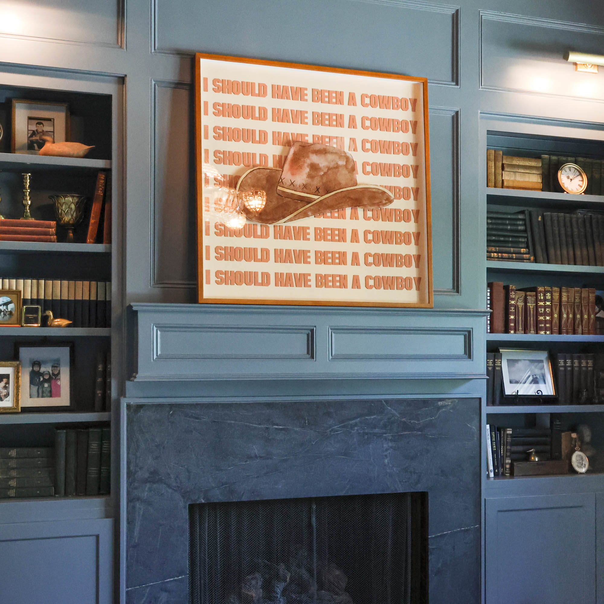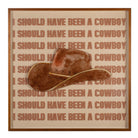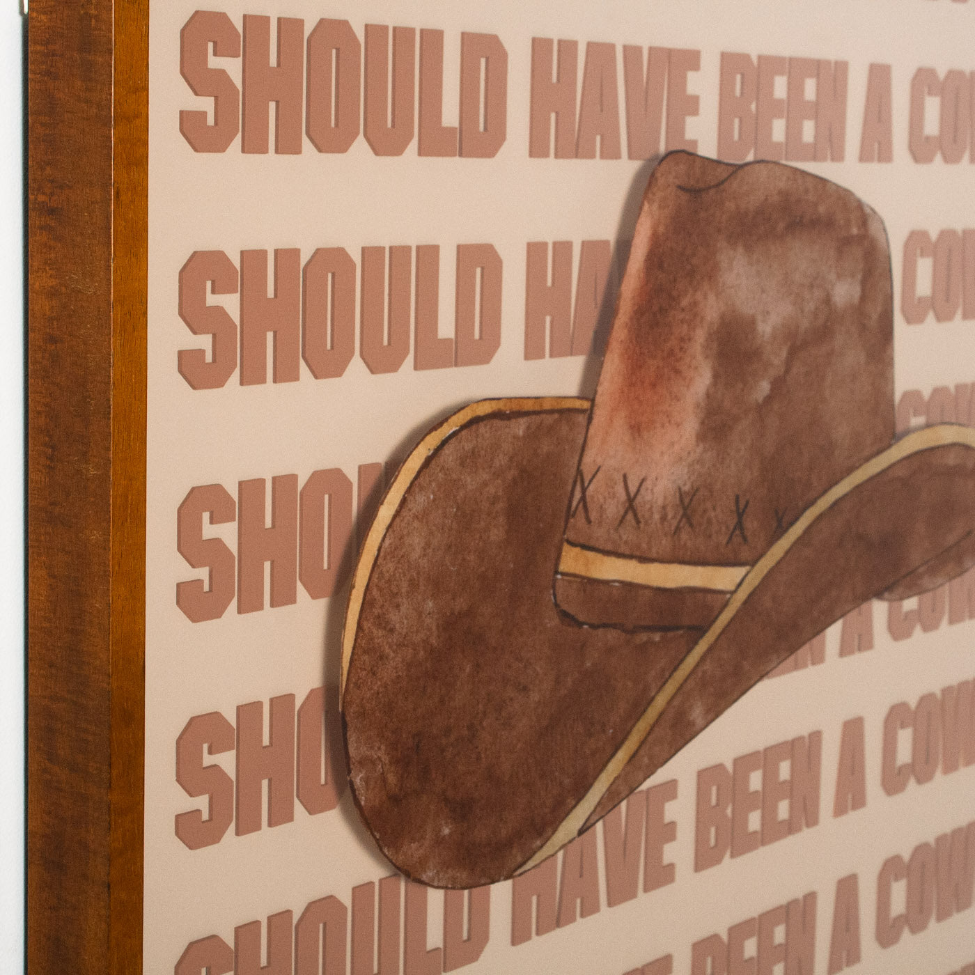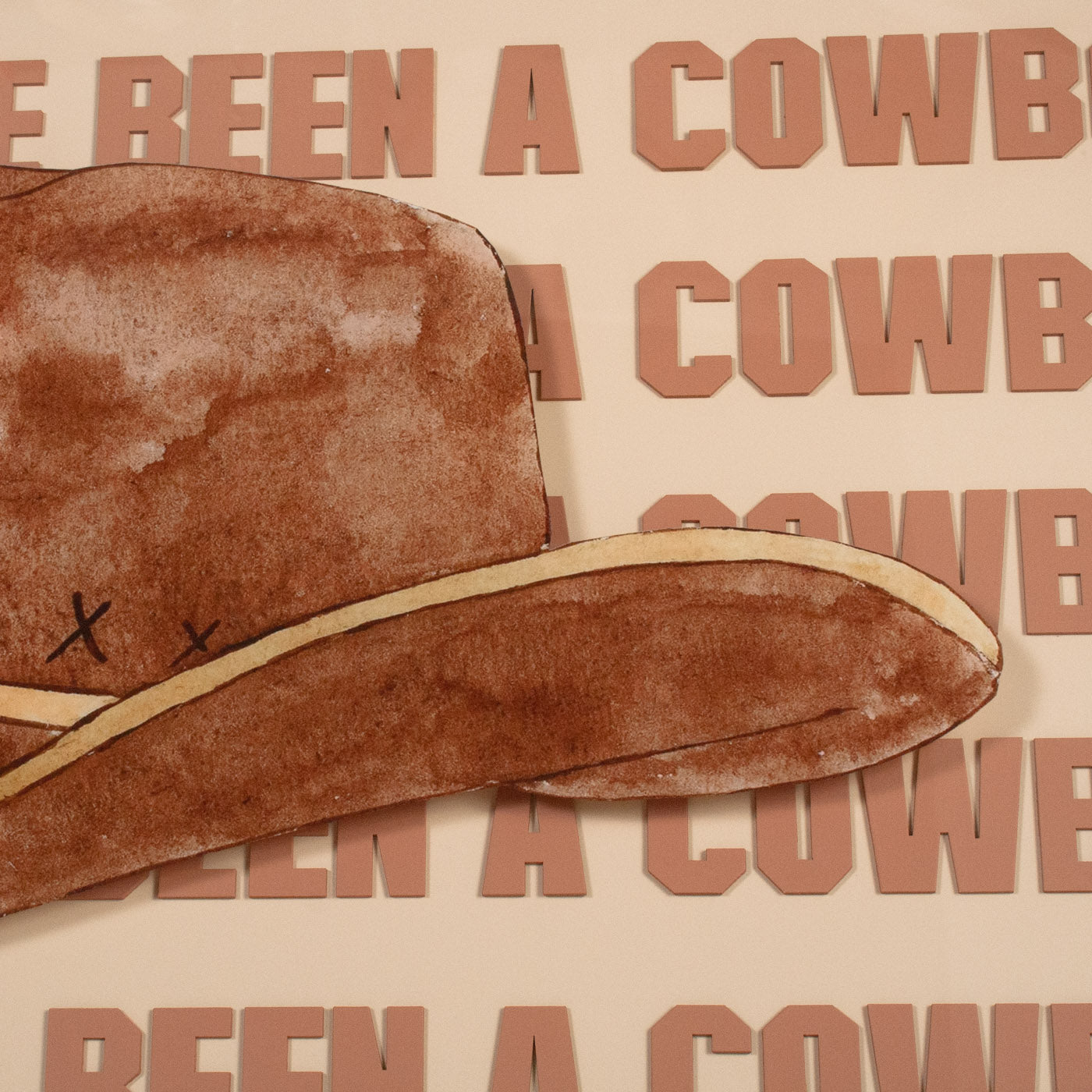 New from the Tat Frederick studio, Cowboy is composed of laser cut letters "I Should Have Been A Cowboy" individually placed on a beige canvas and framed in brown.