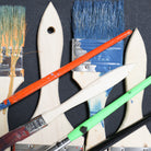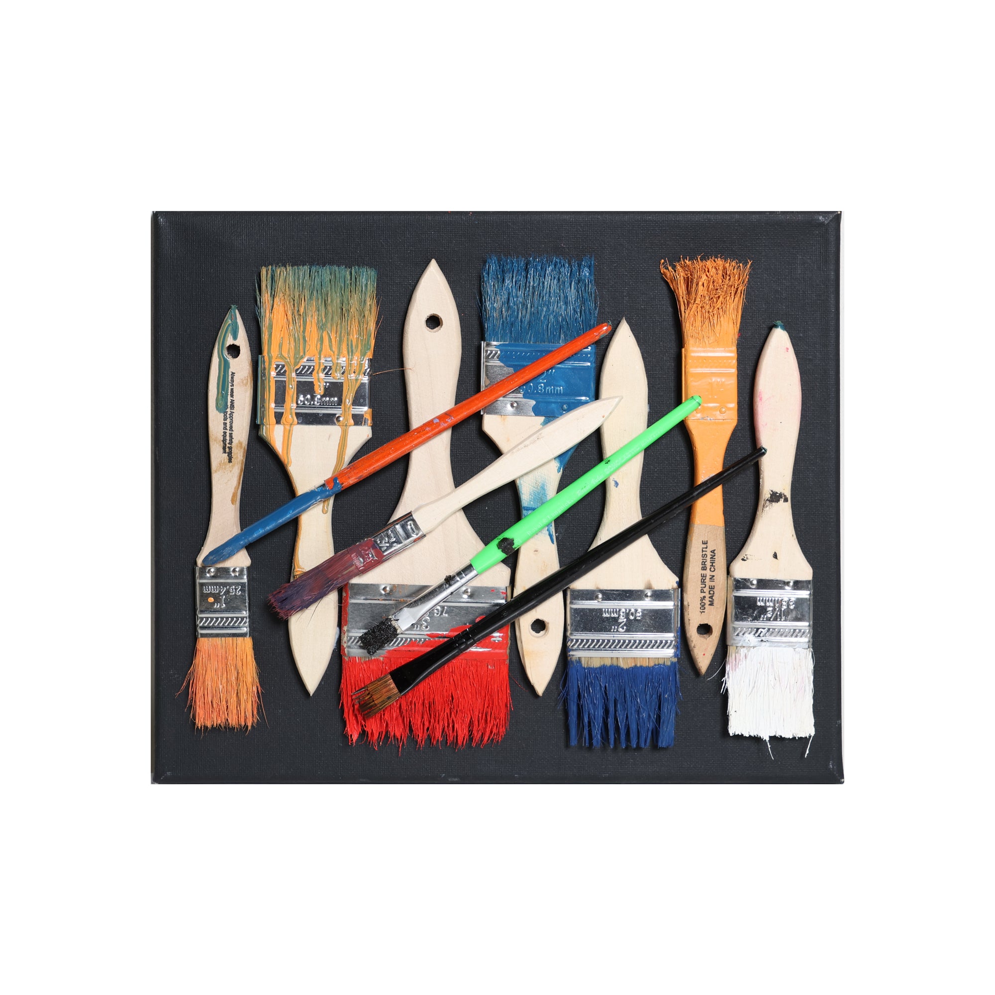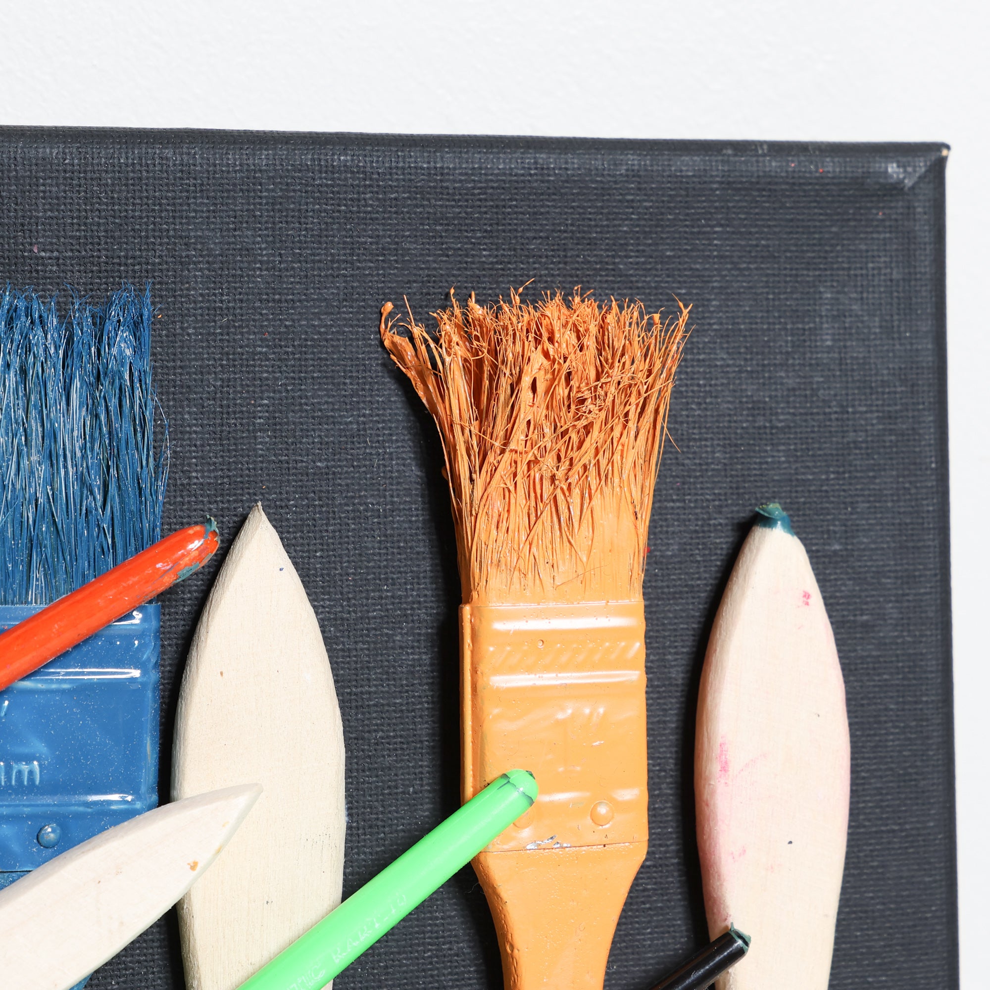 We love this 3D take on paintbrush art. Vintage brushes are adhered to black painted canvas. Authentically original and uniquely cool for a collected space.