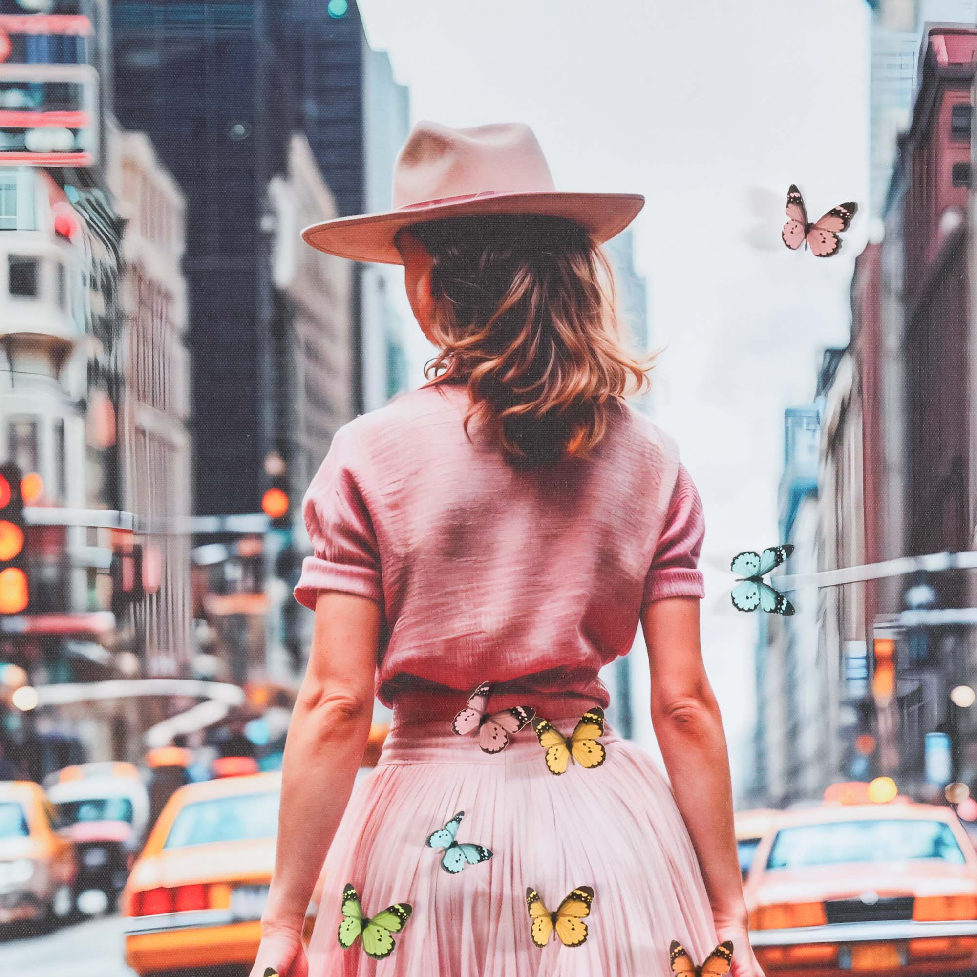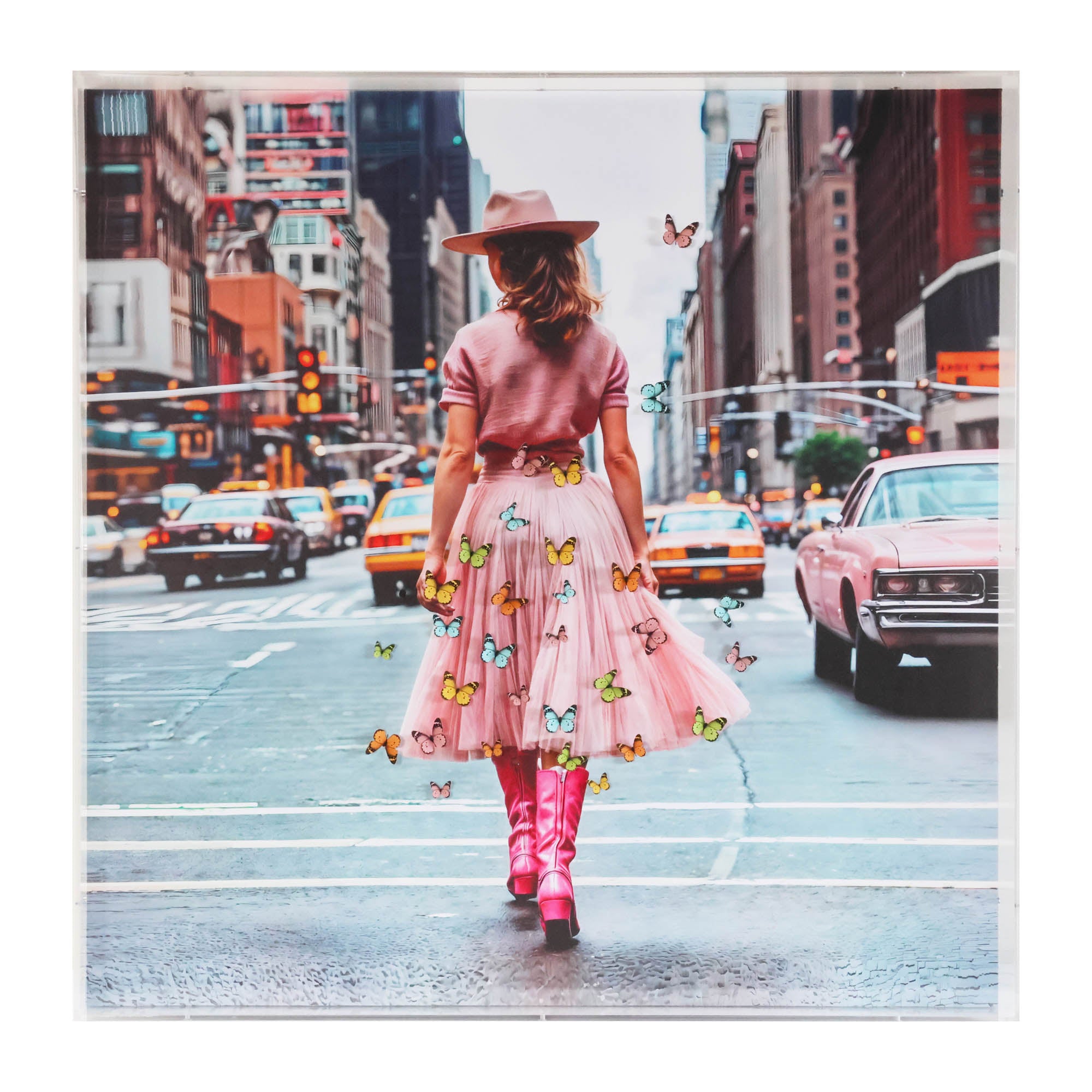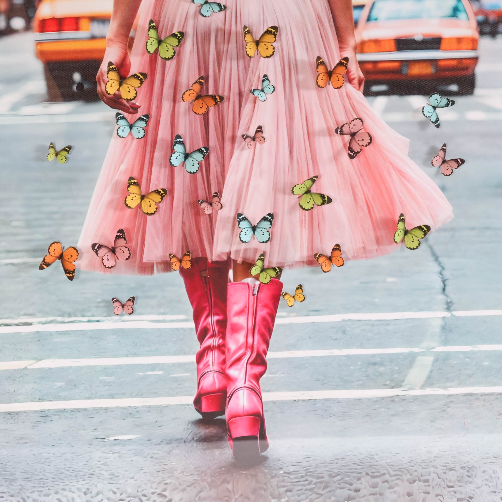 From the Tat Frederick studio, Dolly's Day Off features photographic art printed on canvas of a Queen in the streets. Hand-cut pastel butterflies float around her as she stops traffic.