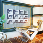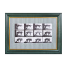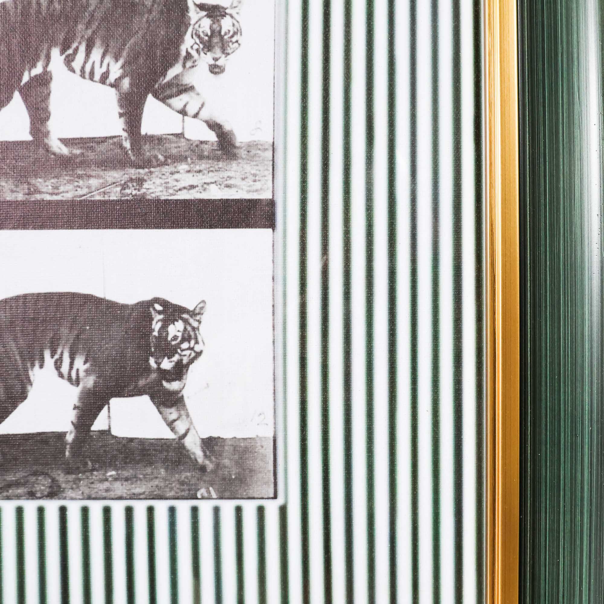 Capturing nature's most iconic predator, Earn Your Stripes features vintage black and white tiger prints on green and white striped matting. Gold painted border and green wooden frame make this piece pop!