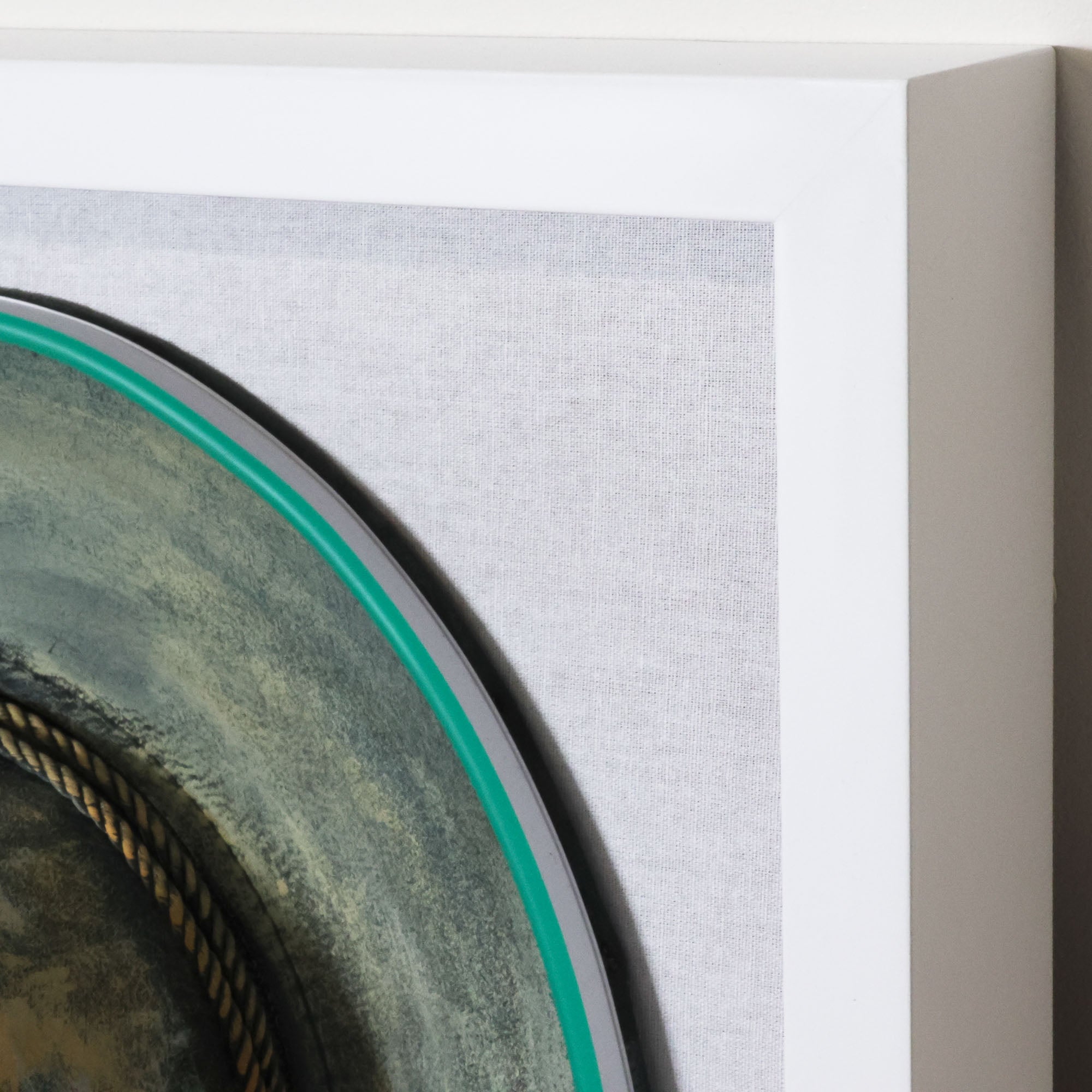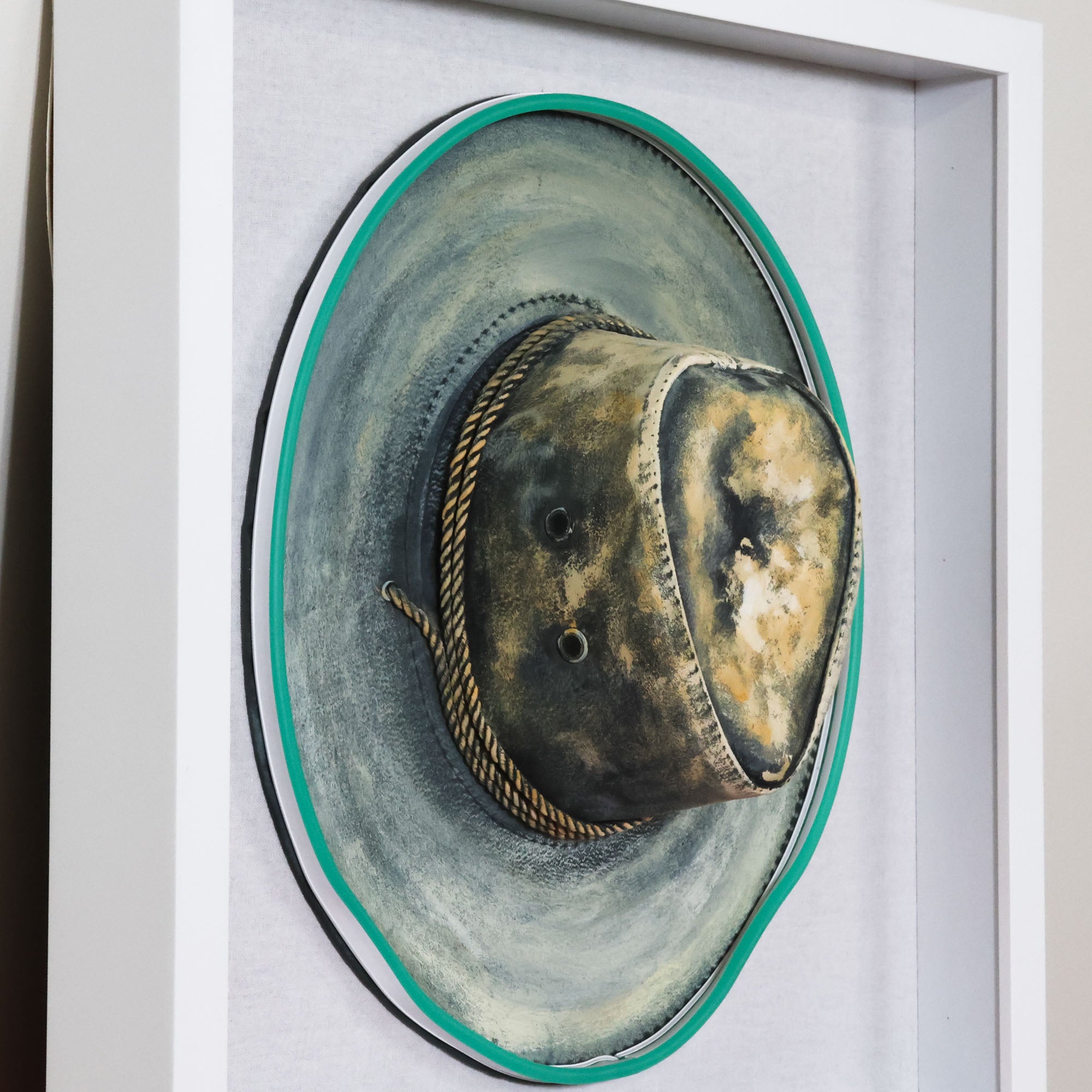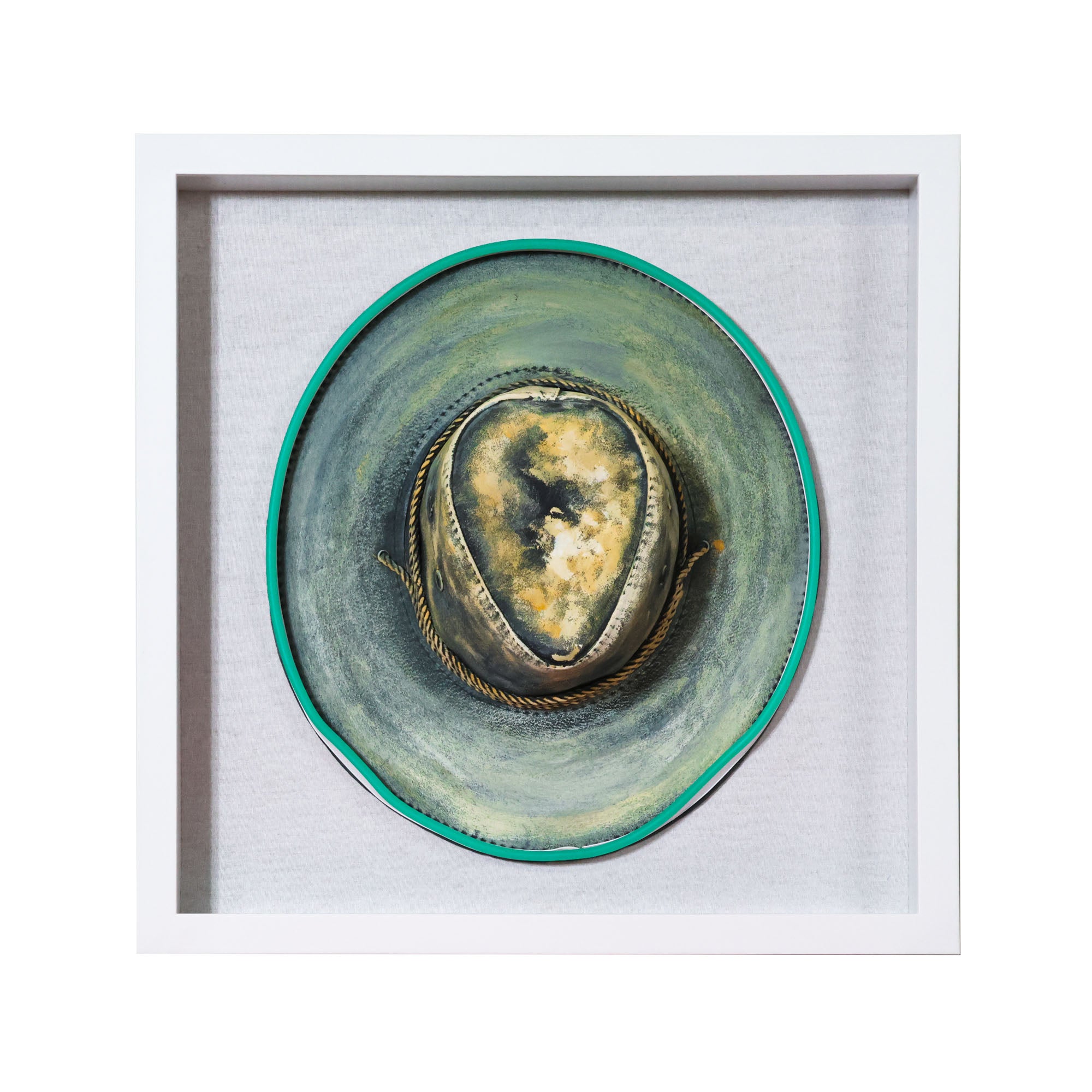 New from the Tat Frederick studio, Electric Cowboy Petite features an array of colorful cowboy hats. Once each hat is hand-stitched and hand-painted, neon lights are applied around the edges with glue. Framed in white.