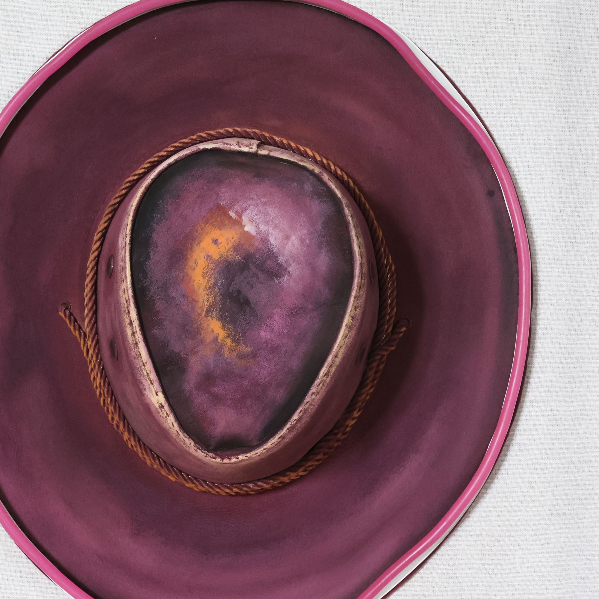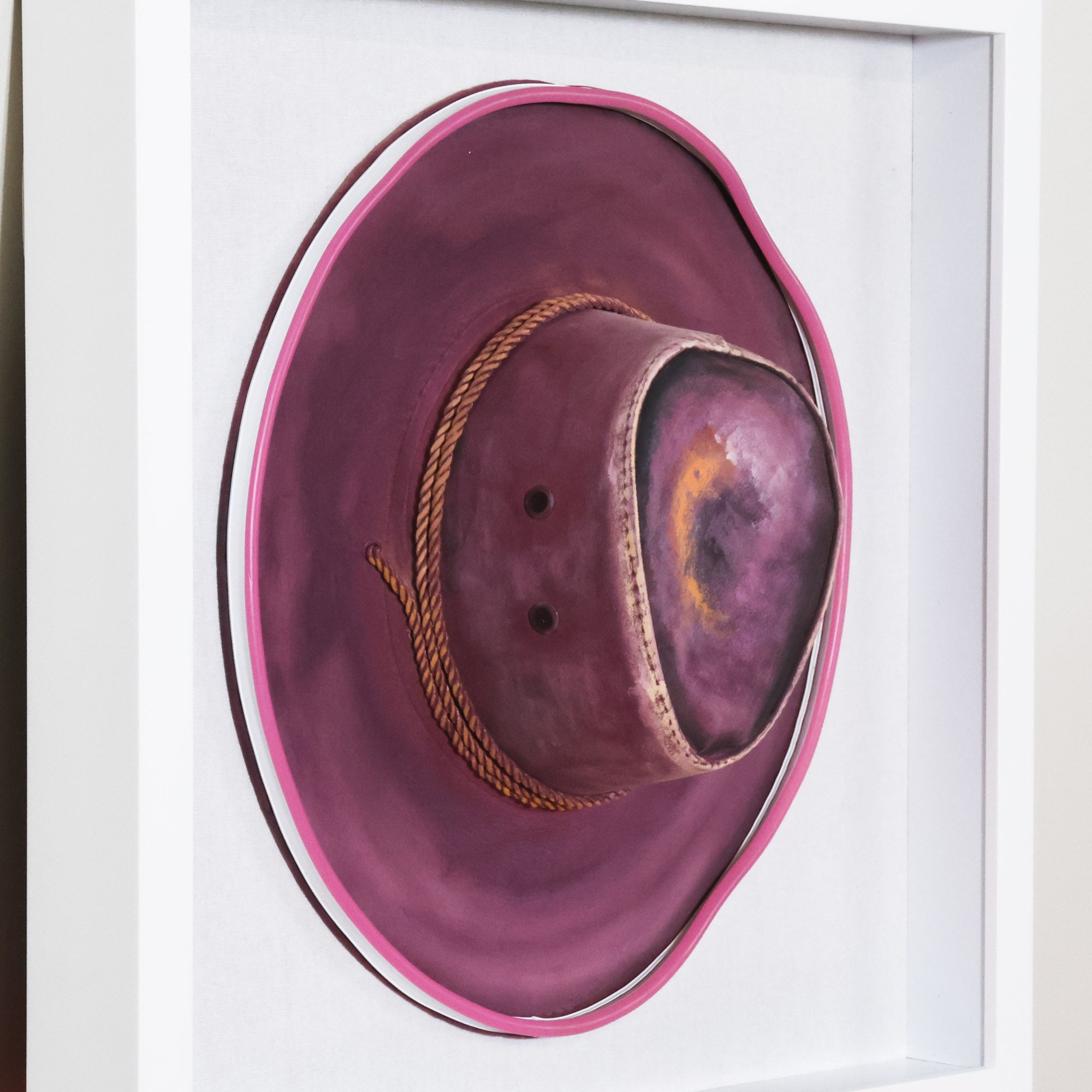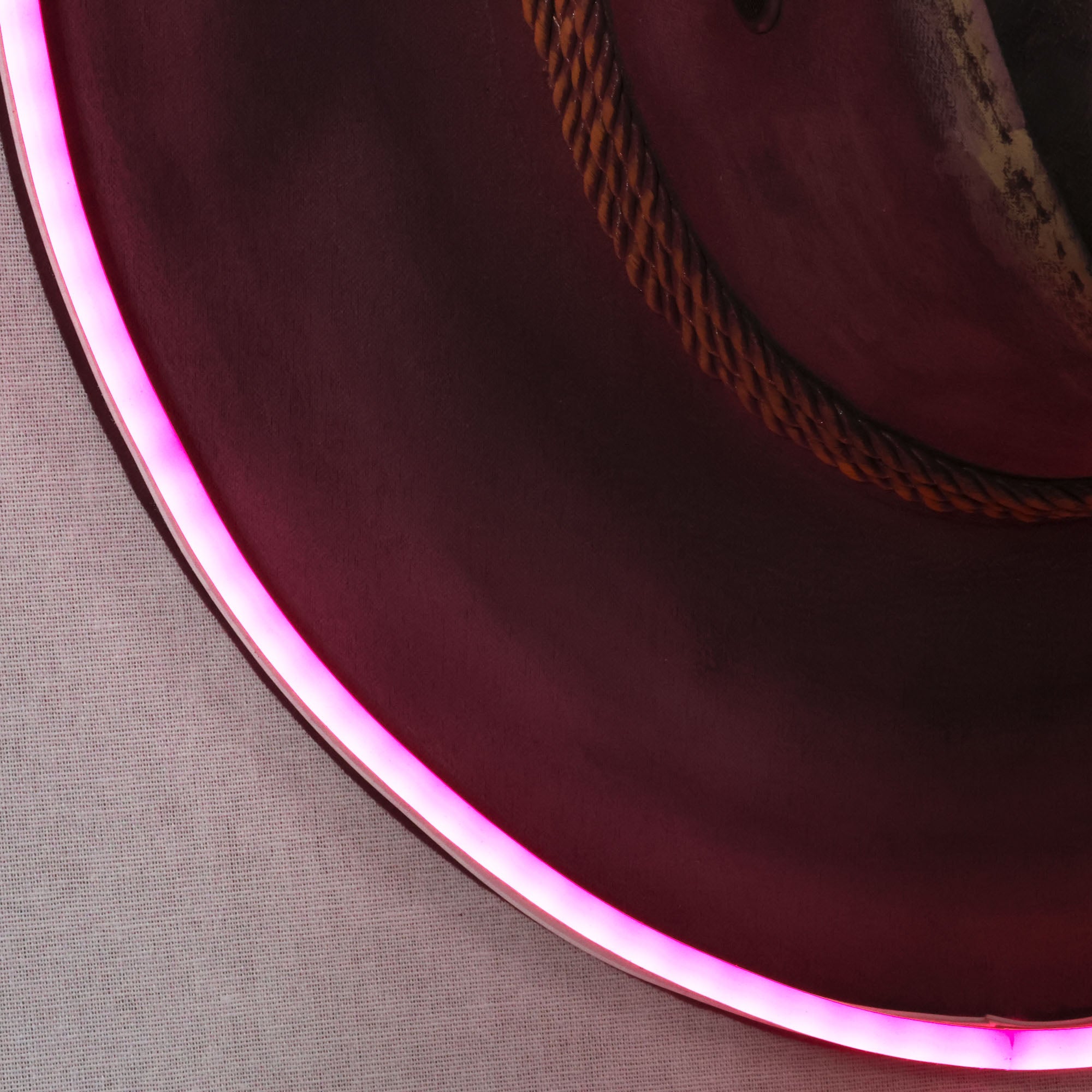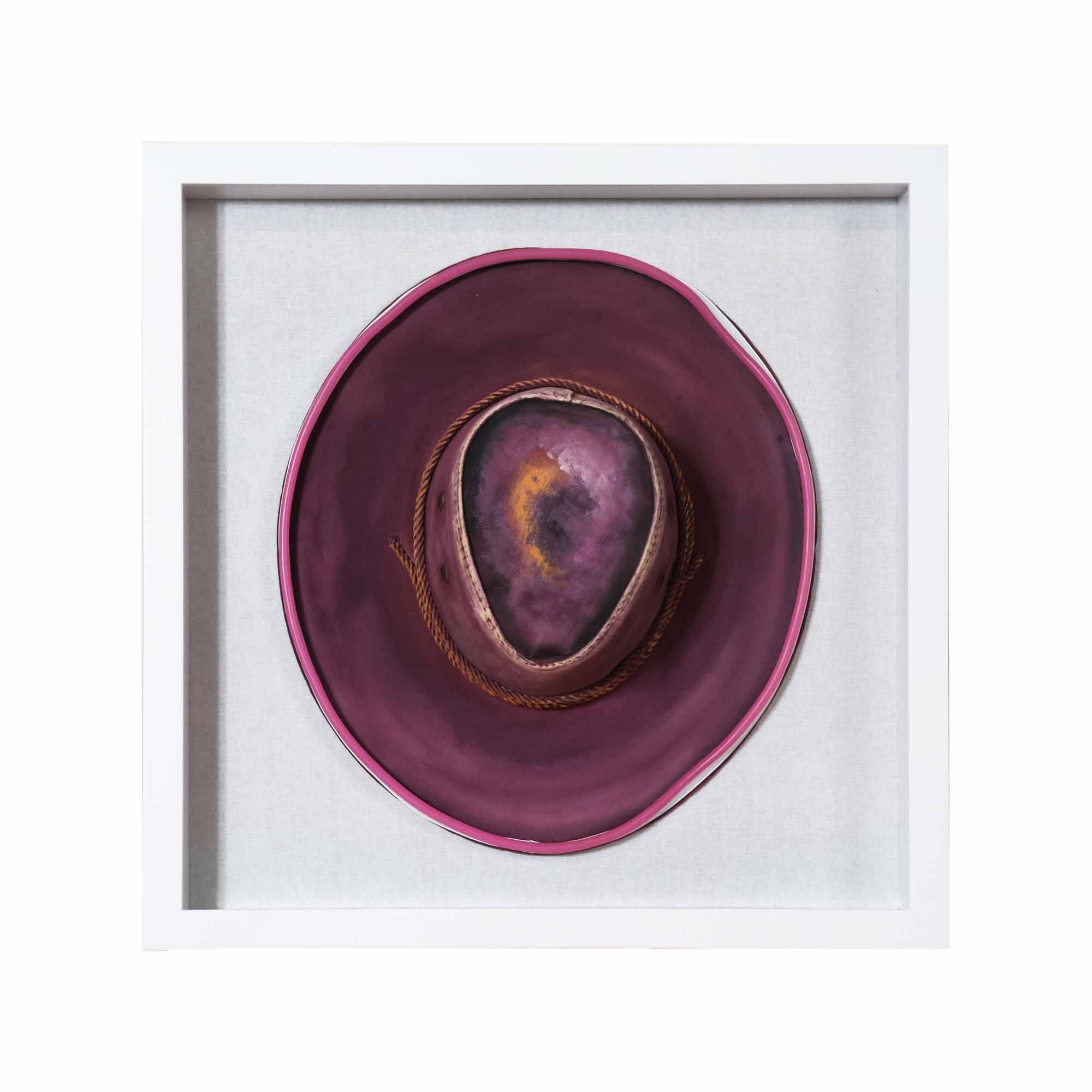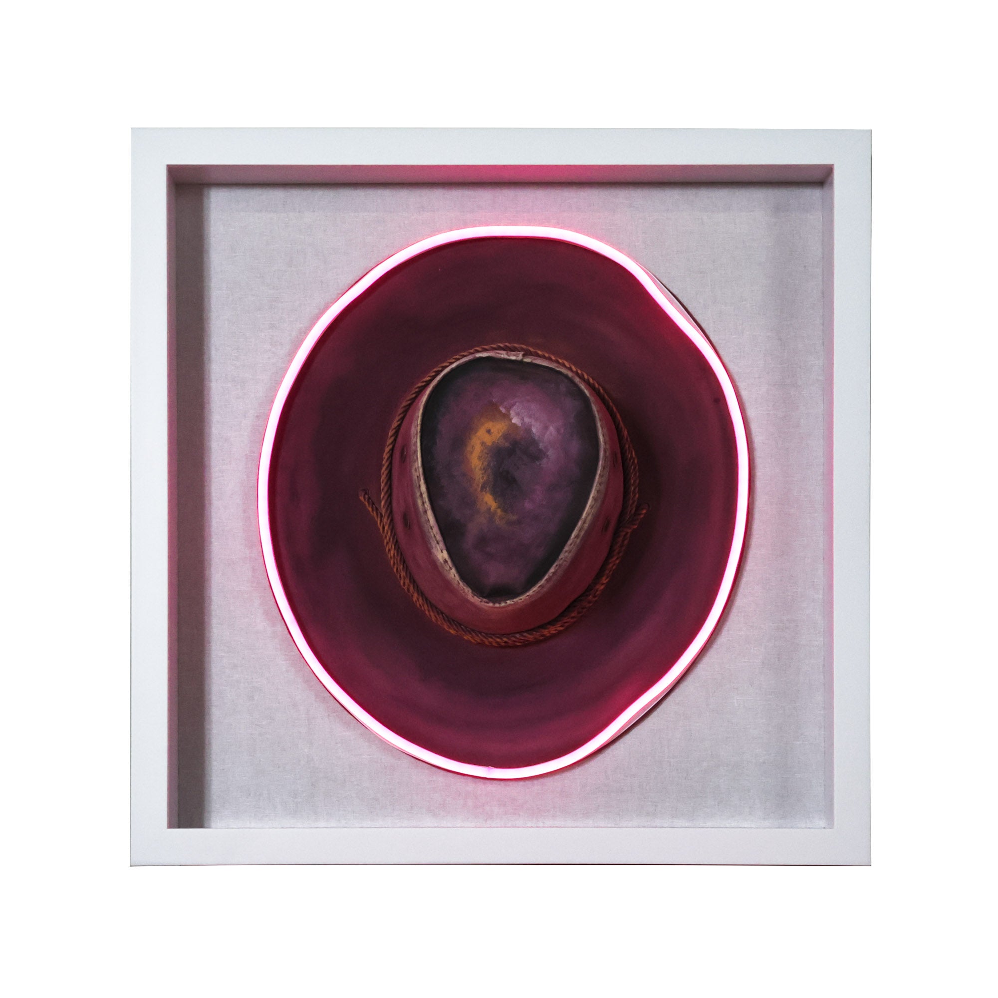 New from the Tat Frederick studio, Electric Cowboy Petite features an array of colorful cowboy hats. Once each hat is hand-stitched and hand-painted, neon lights are applied around the edges with glue. Framed in white.