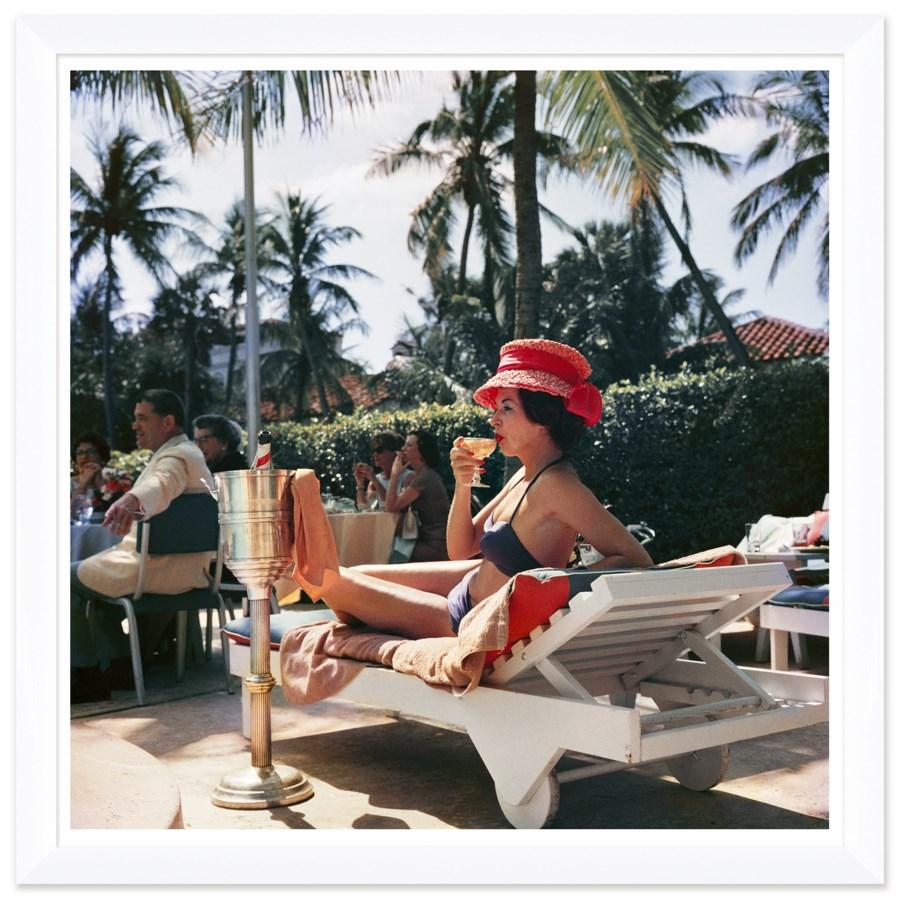 Slim Aarons photography of a woman watching a poolside fashion show at the Colony Hotel in Palm Beach, Florida on January 1, 1961.