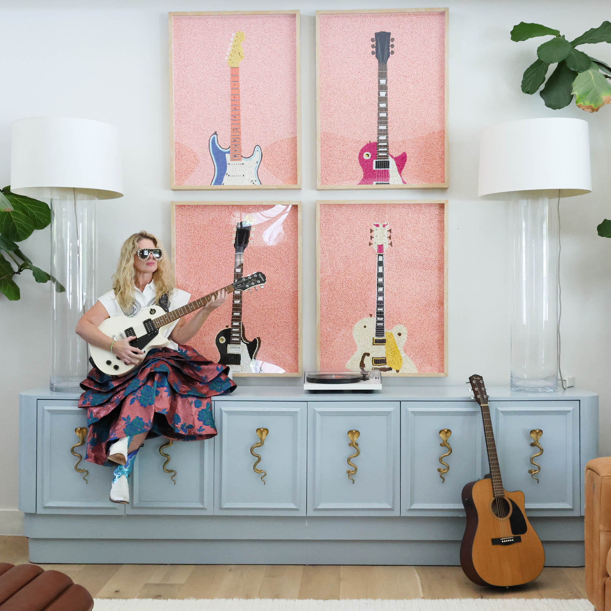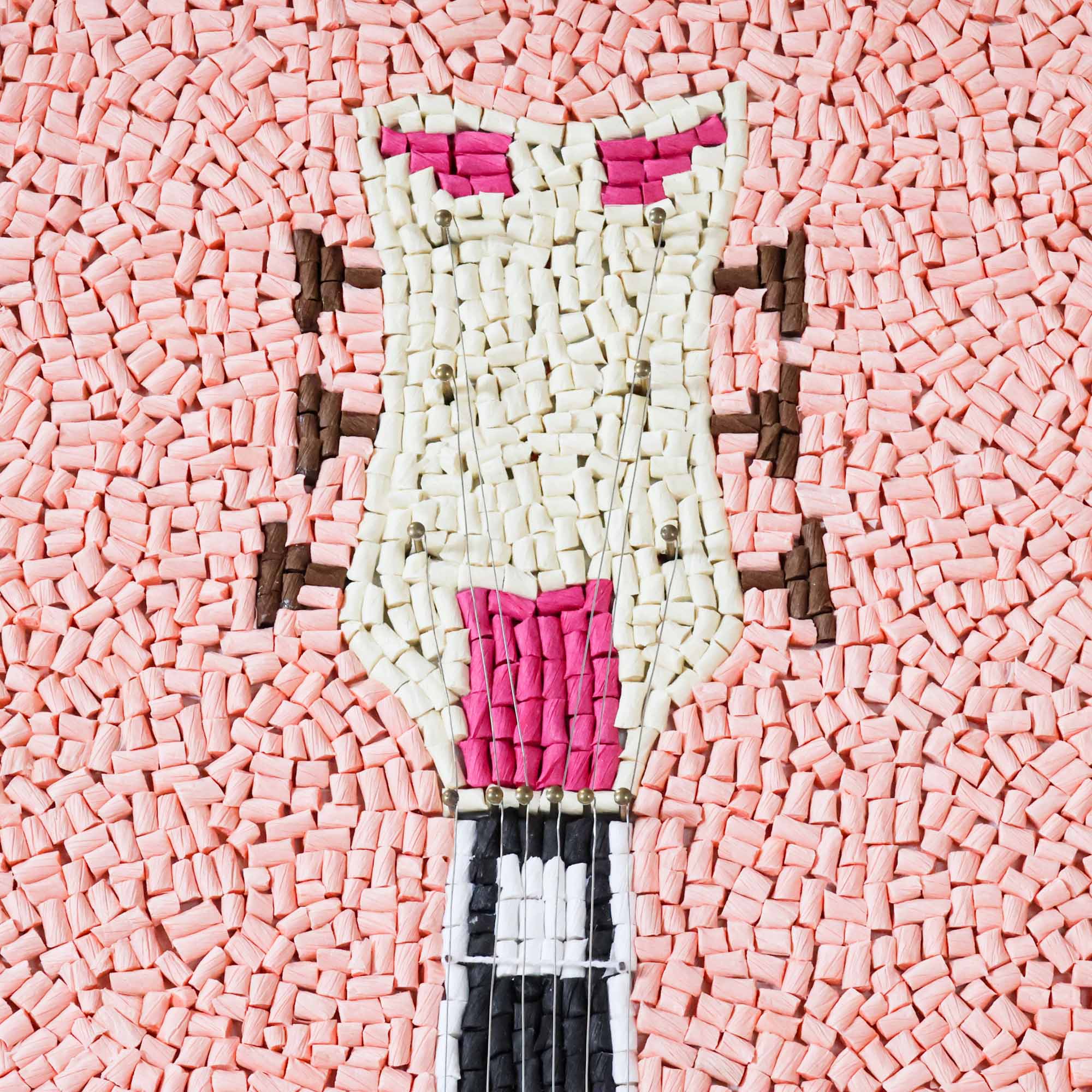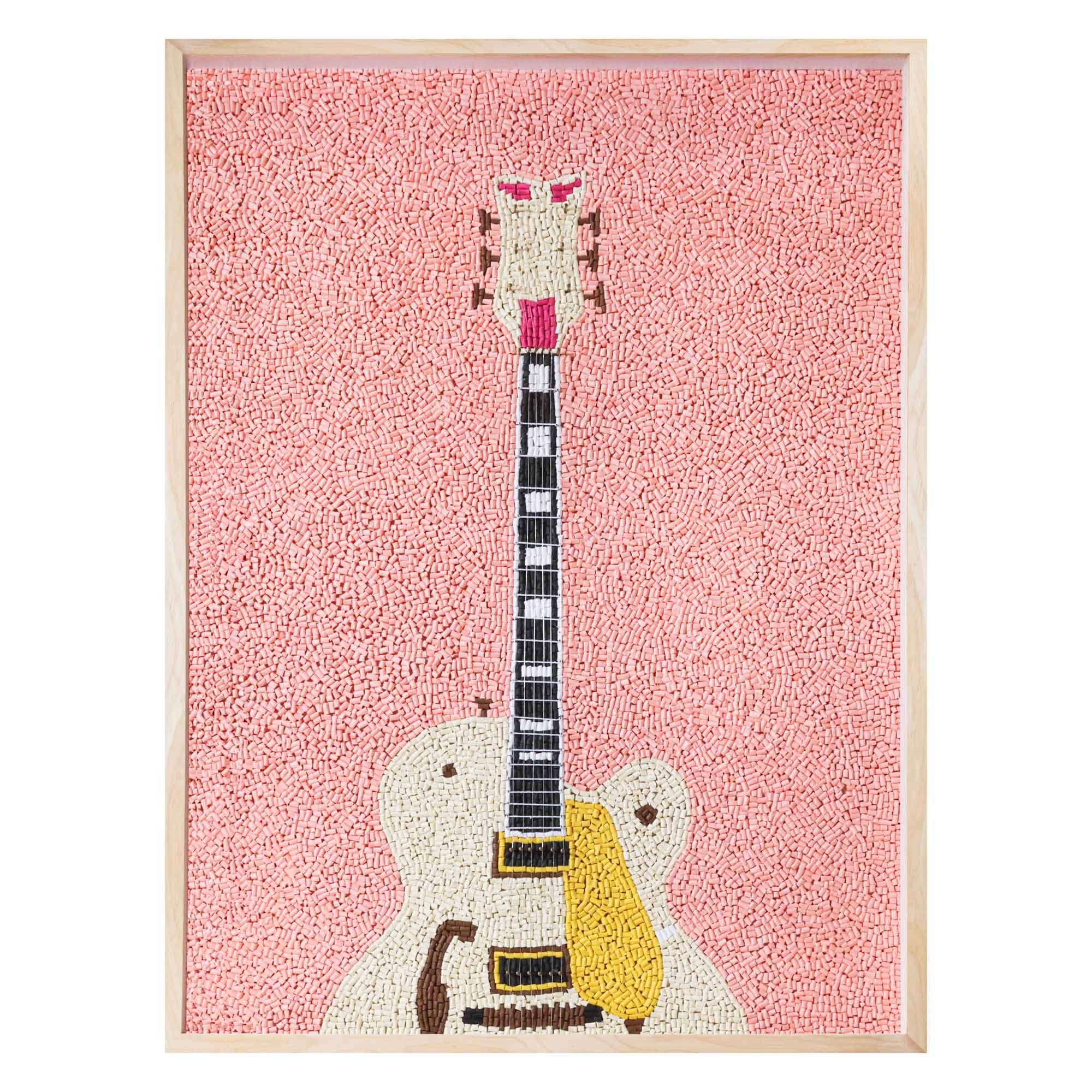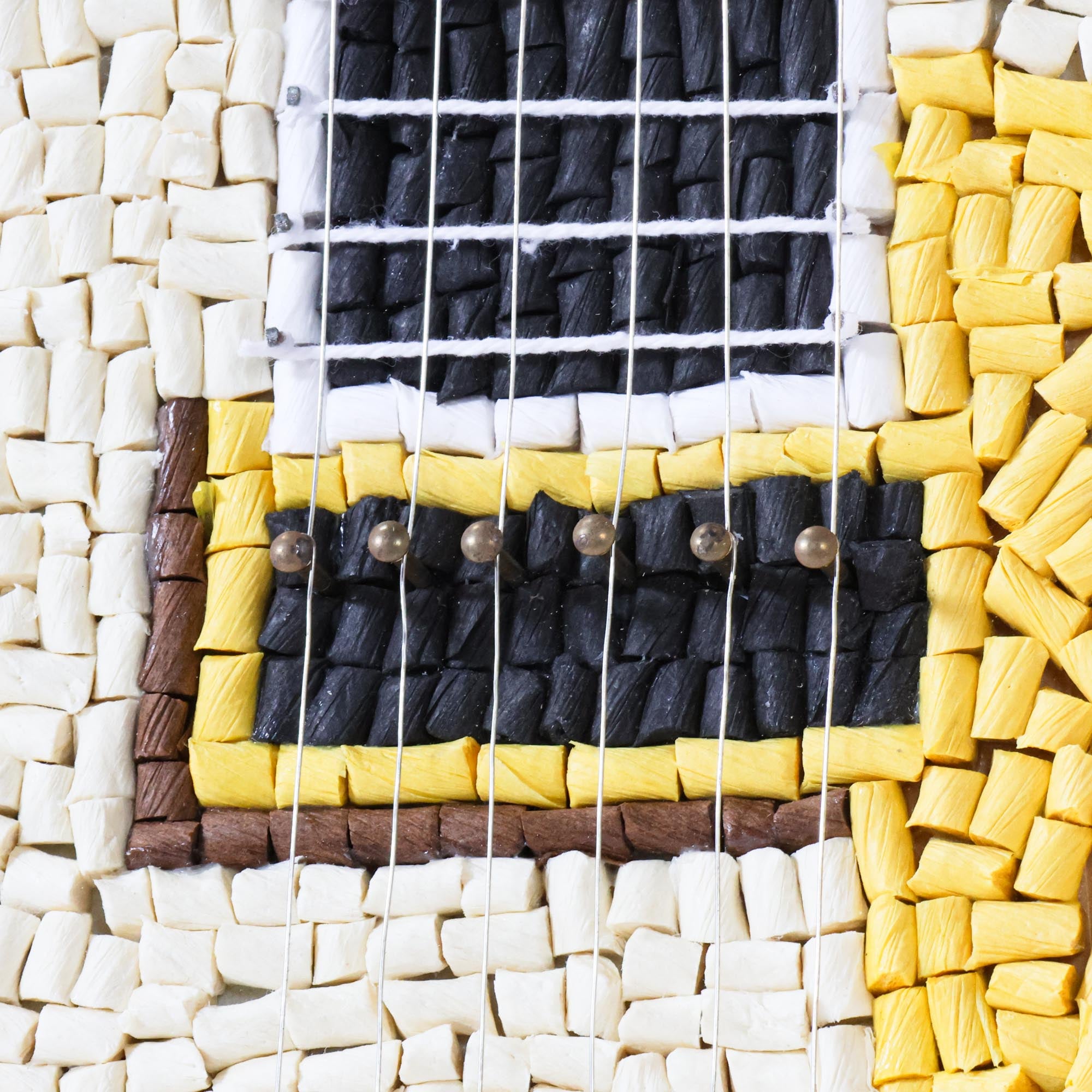 From the Tat Frederick studio, the Guitar Series features tiny pieces of painted rope that have been arranged by hand and mounted in an iconic guitar design. Hand placed wire, string and pins make up the other guitar details. Framed in wood with a plexiglass frame.