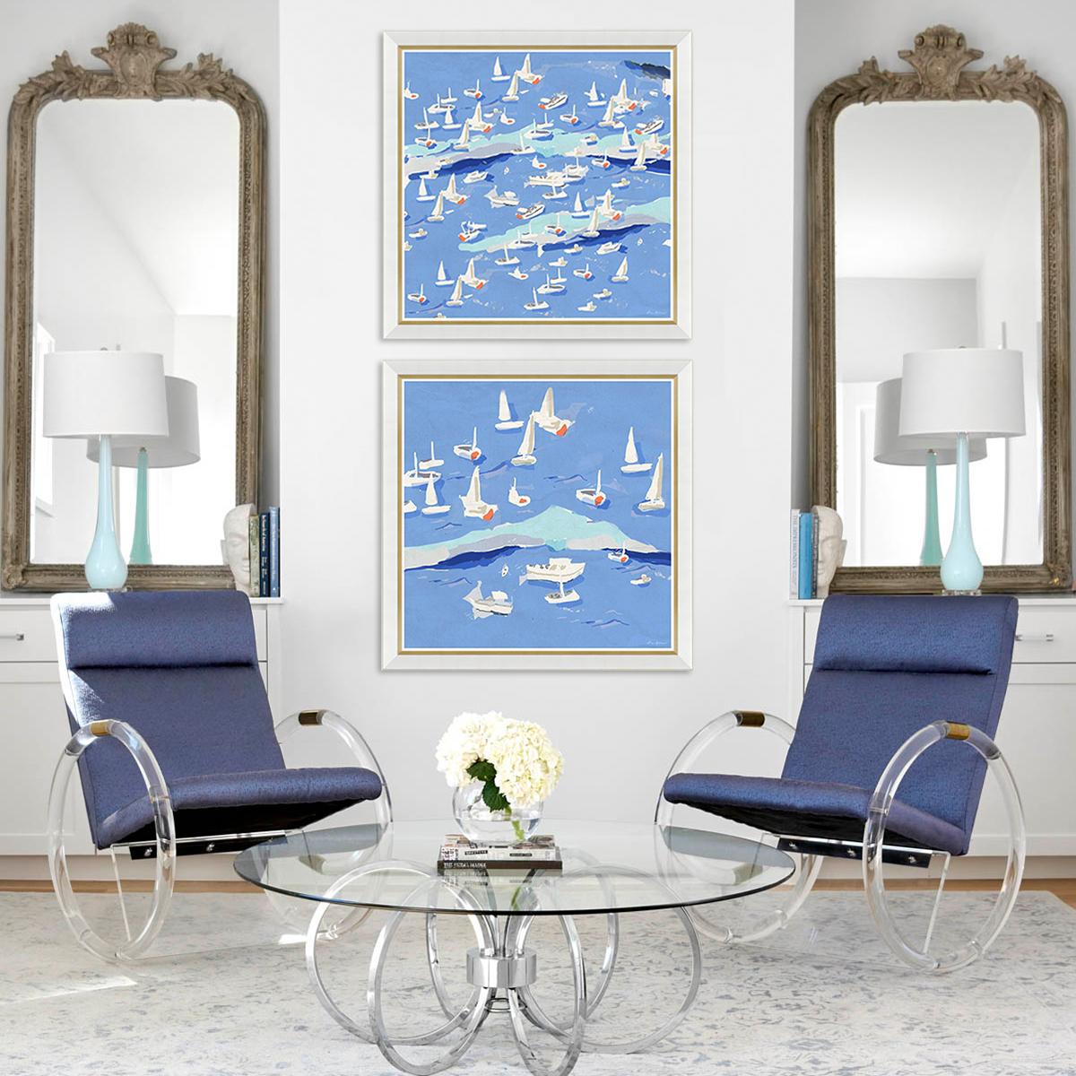 Giclée print of a coastal still life painting by Dana Gibson. 'Island Hopping I' is printed on archival paper and framed in a silver painted wood frame.