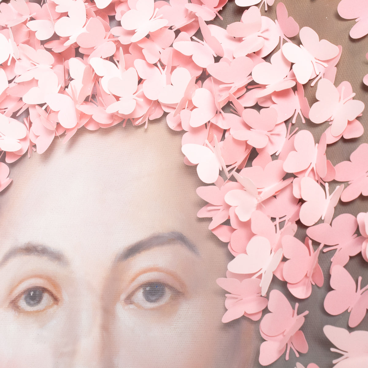 This elegant empress is printed on canvas with pink butterflies individually placed around her crown and collar.