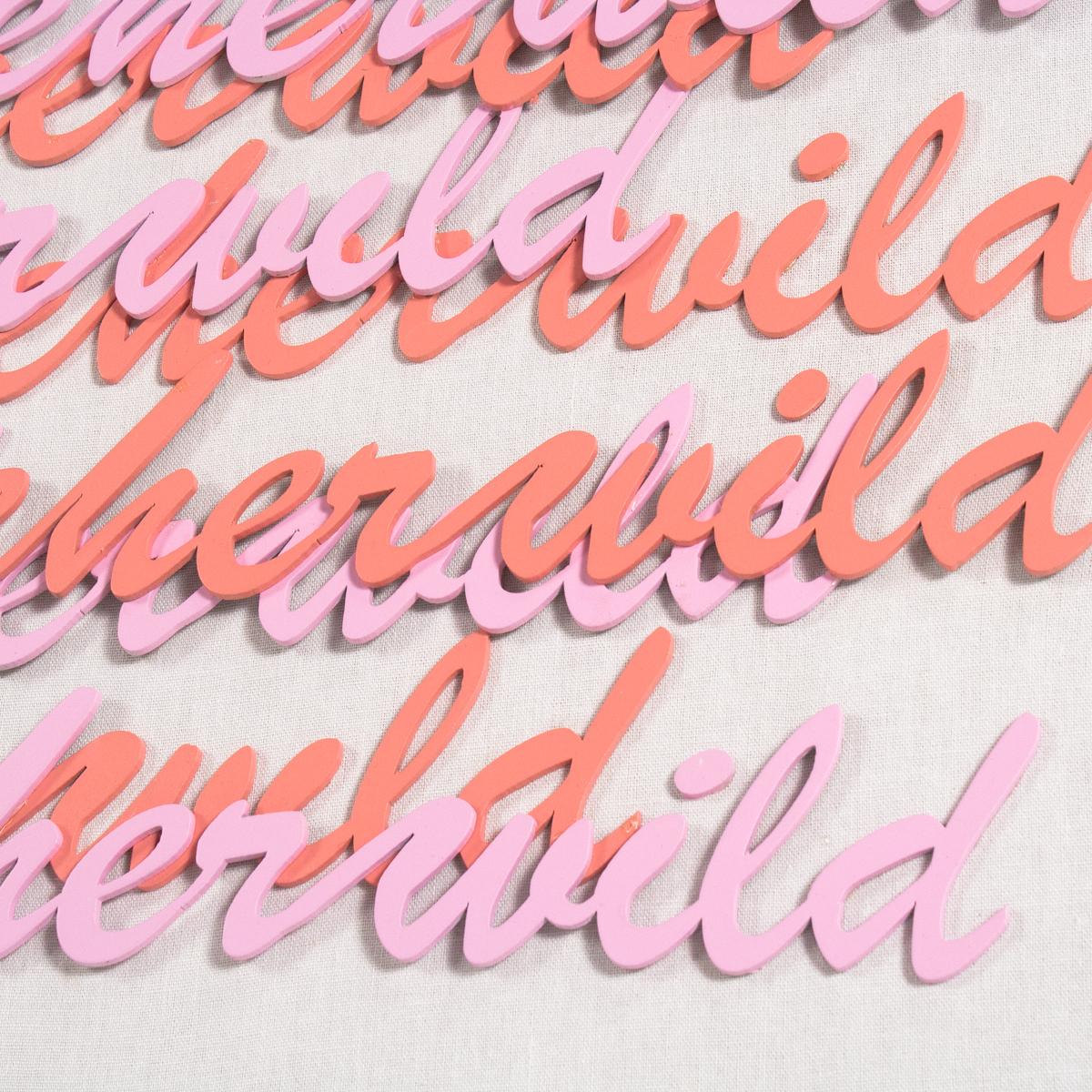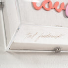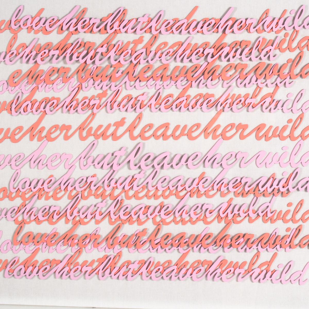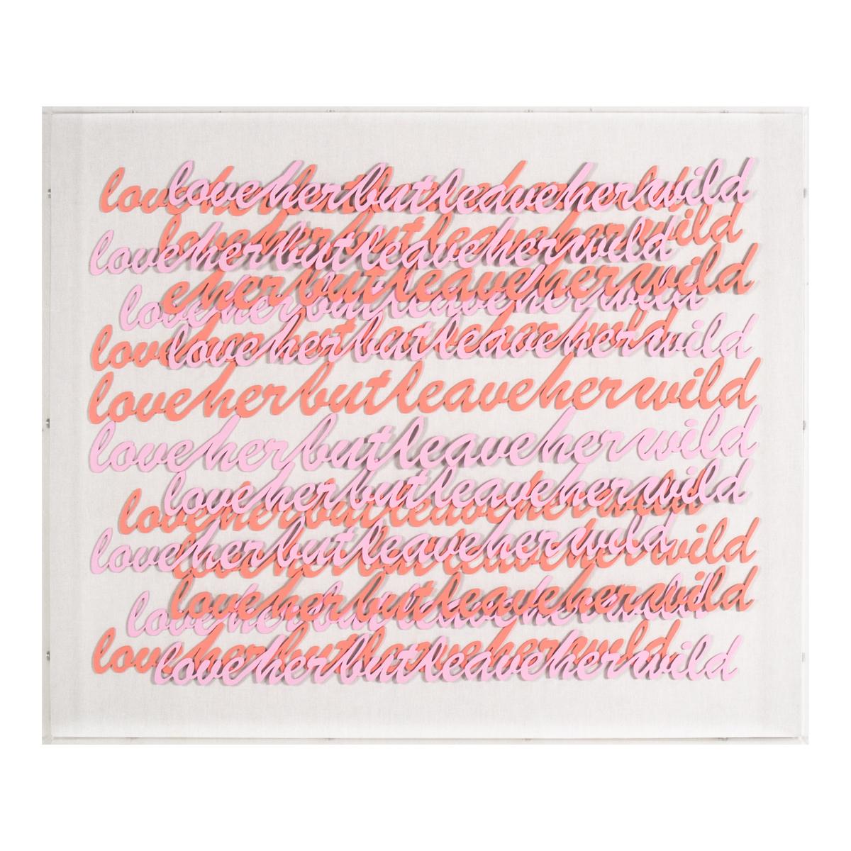Hand-cut and painted words form the famous Atticus Poetry quote, "love her but leave her wild". Arranged on white canvas and framed in an acrylic shadowbox.