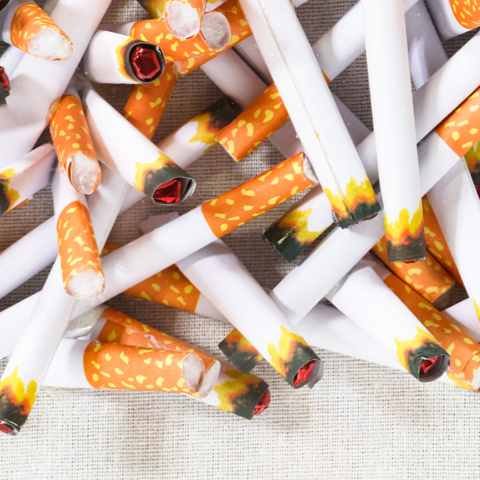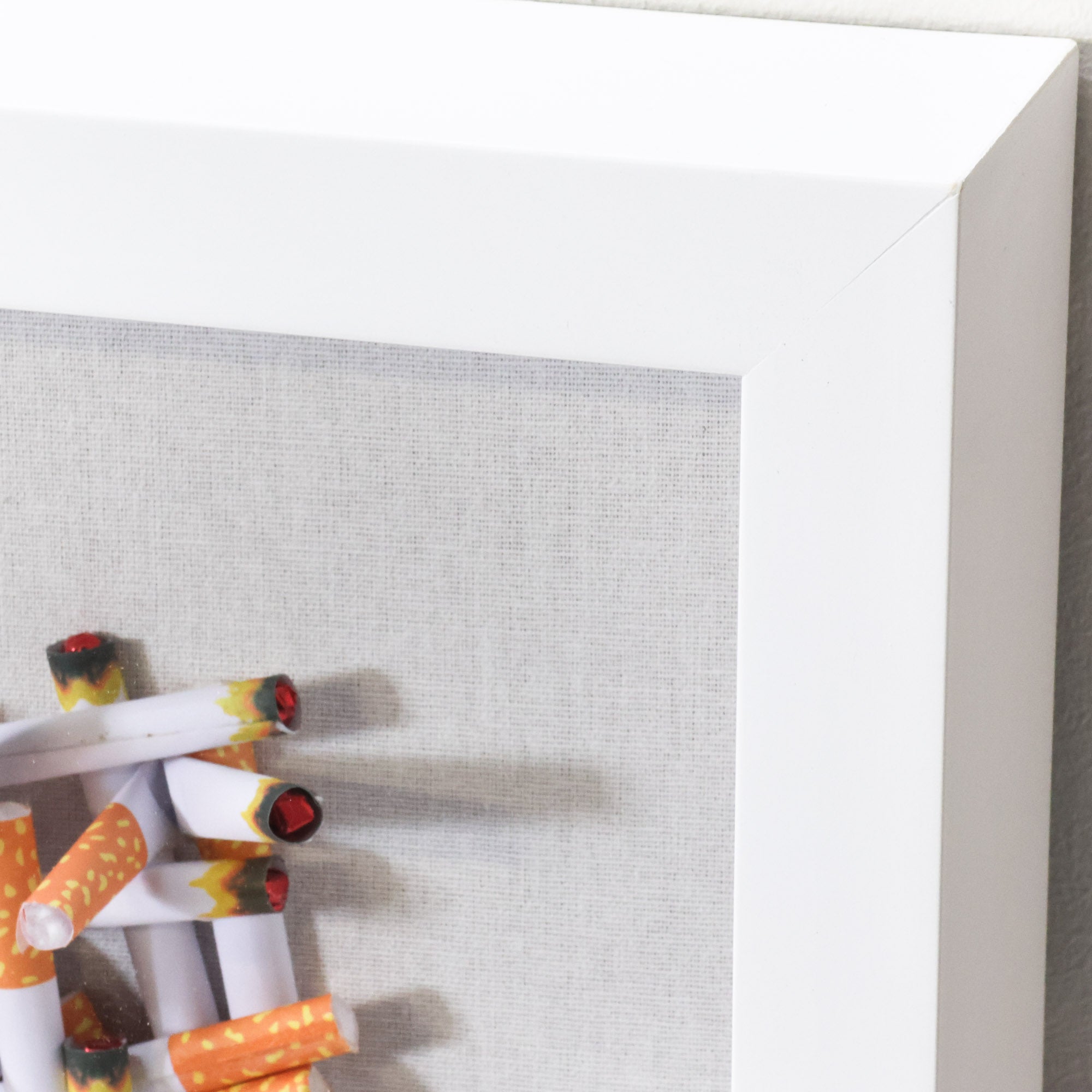 From the Tat Frederick studio, this piece features hand-placed paper cigarettes on canvas with metallic tips that make them appear lit. Framed in white with plexiglass.