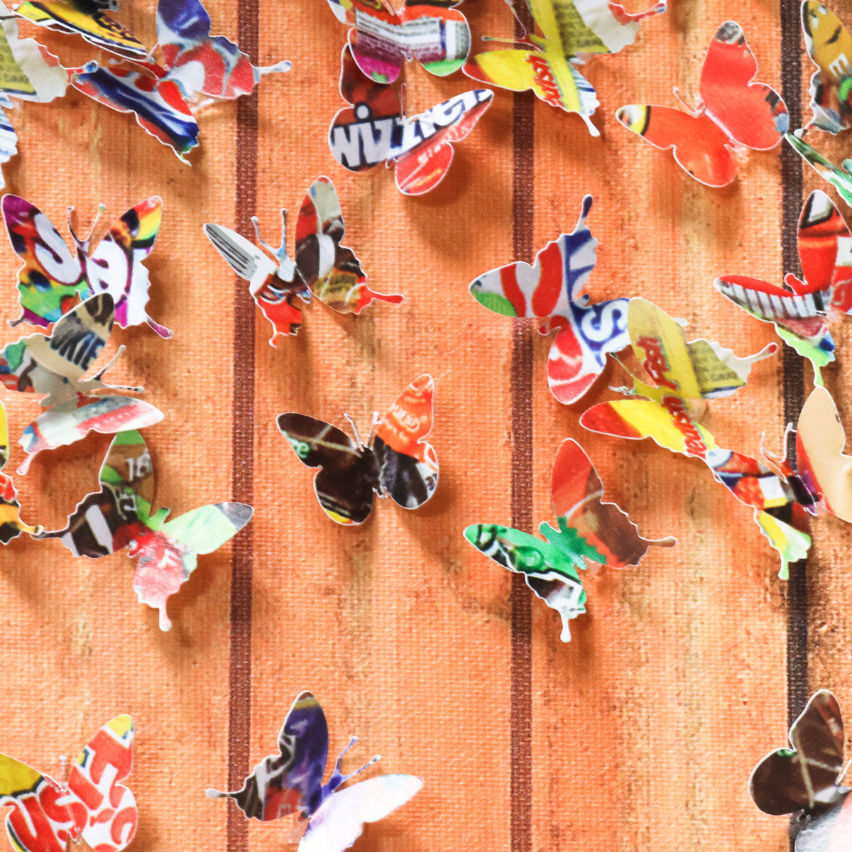 Love on the Fly features printed candy butterflies that are hand-cut and individually pinned to canvas. Each piece is handmade and will have some variations in color and finish. Framed in white lacquered wood with a plexiglass panel.