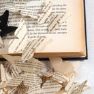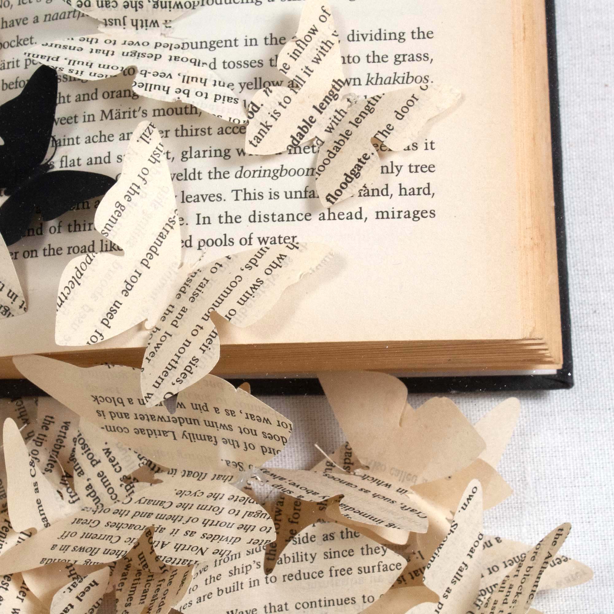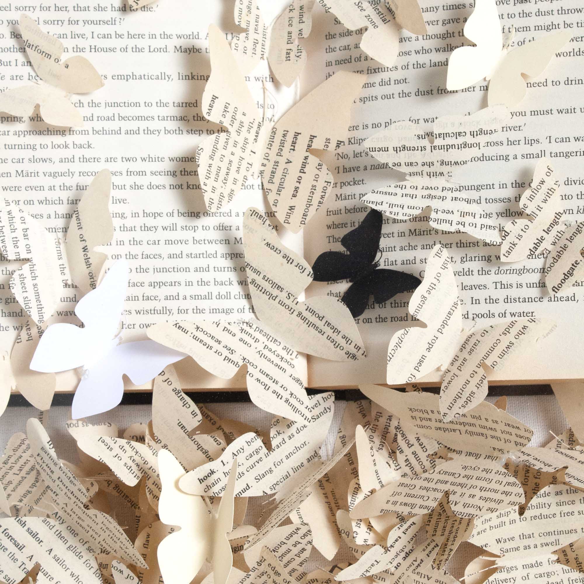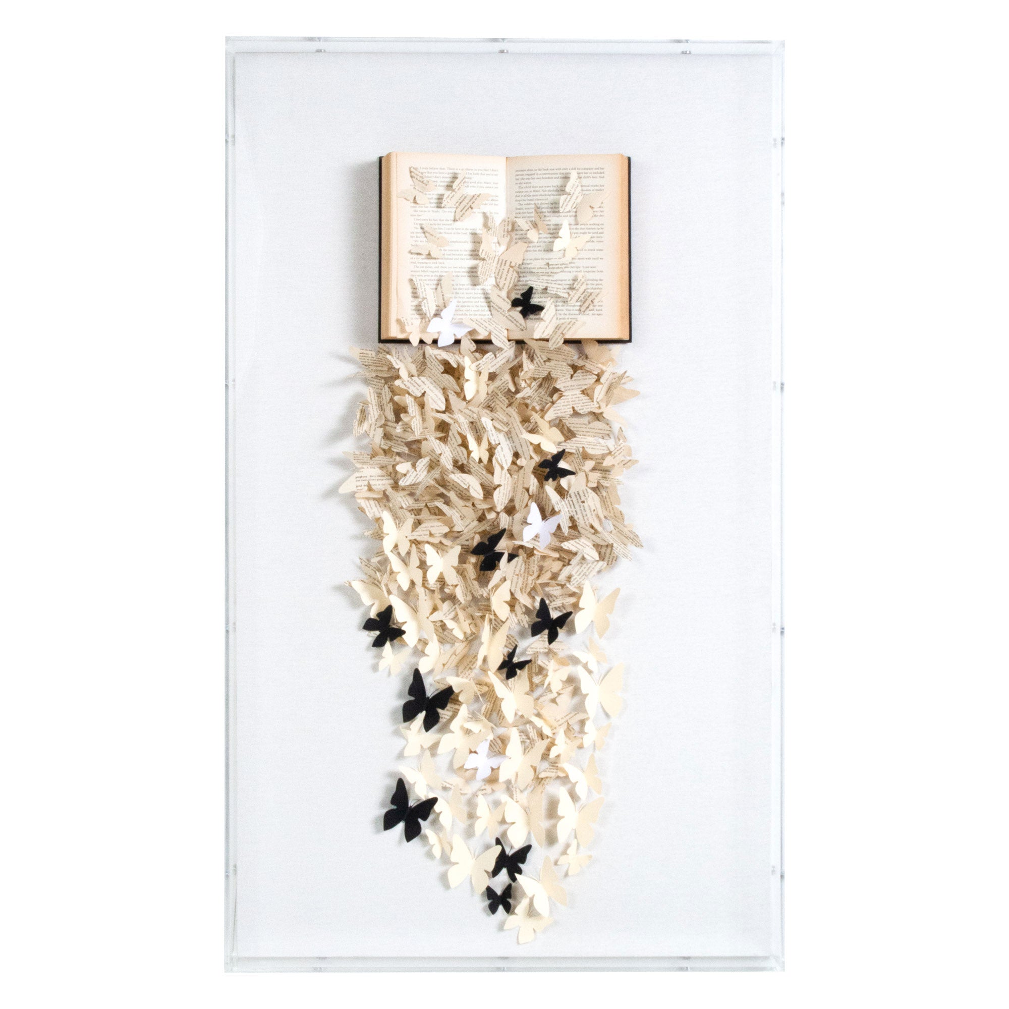An open book is flooded with hand cut butterflies in book pages. Mounted on a white linen canvas and framed in an acrylic shadowbox for an amazing 3D effect.