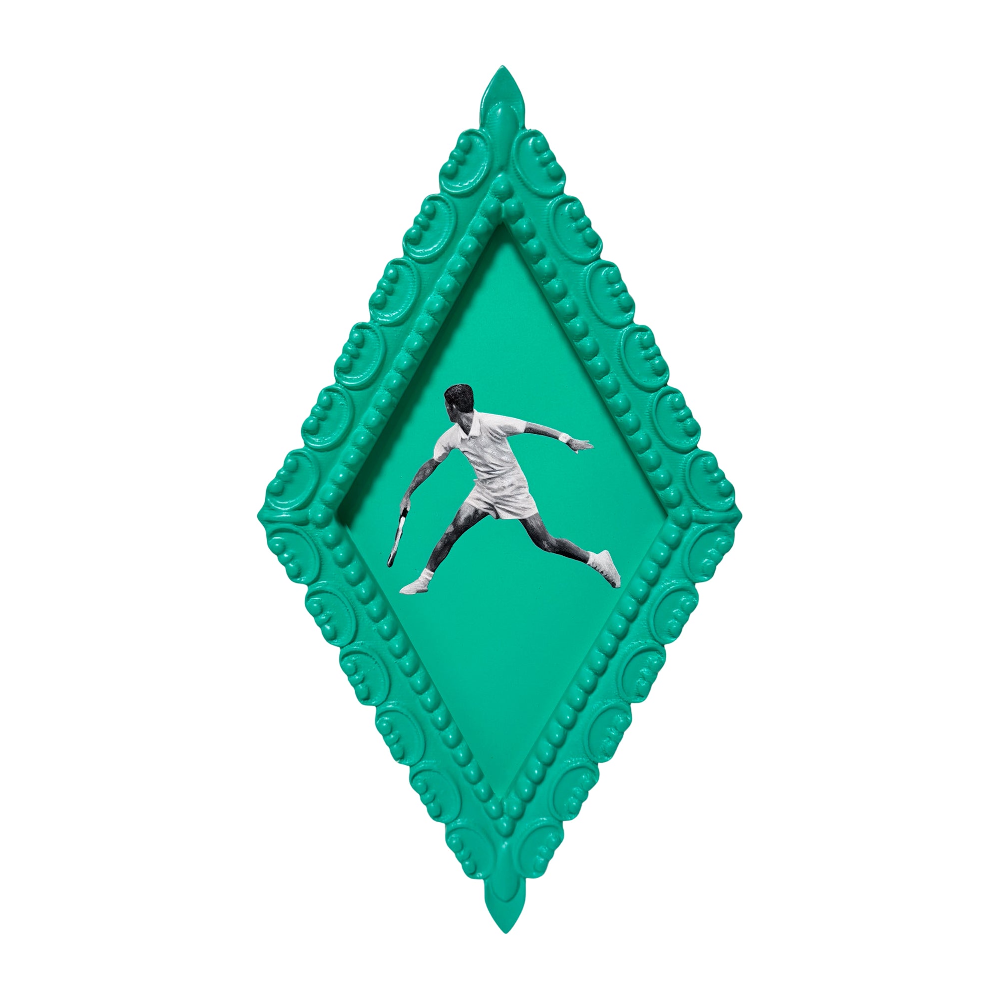 The Wimbledon Series captures the elegance and athleticism of tennis through hand-painted players frozen mid-serve, volley, and smash. Each figure is set against bold jade-green diamond frames, turning classic sport into pop-iconography.
