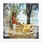 Slim Aarons photography of Gloria Schiff, the twin sister of Consuelo Crespi, with her pet dog and pet birds at Lyford Cay in the Bahamas, 1963.