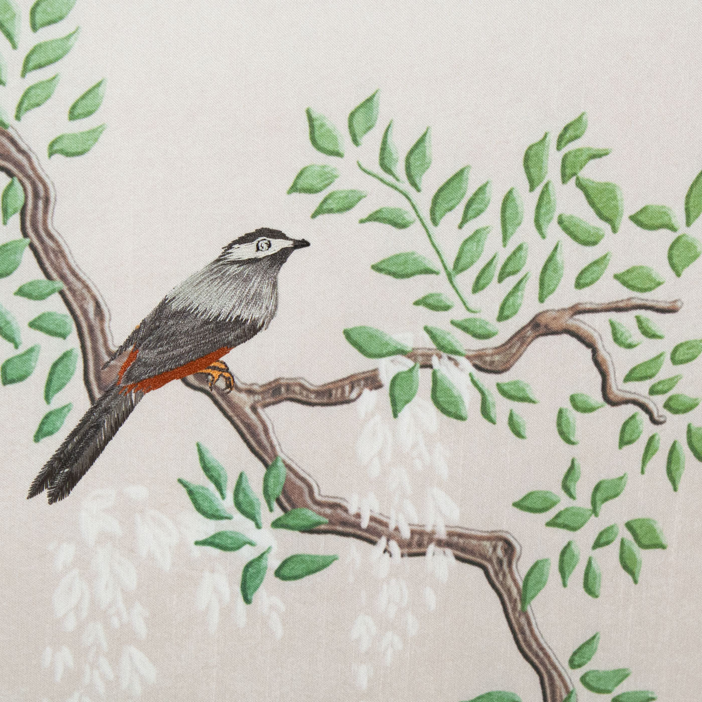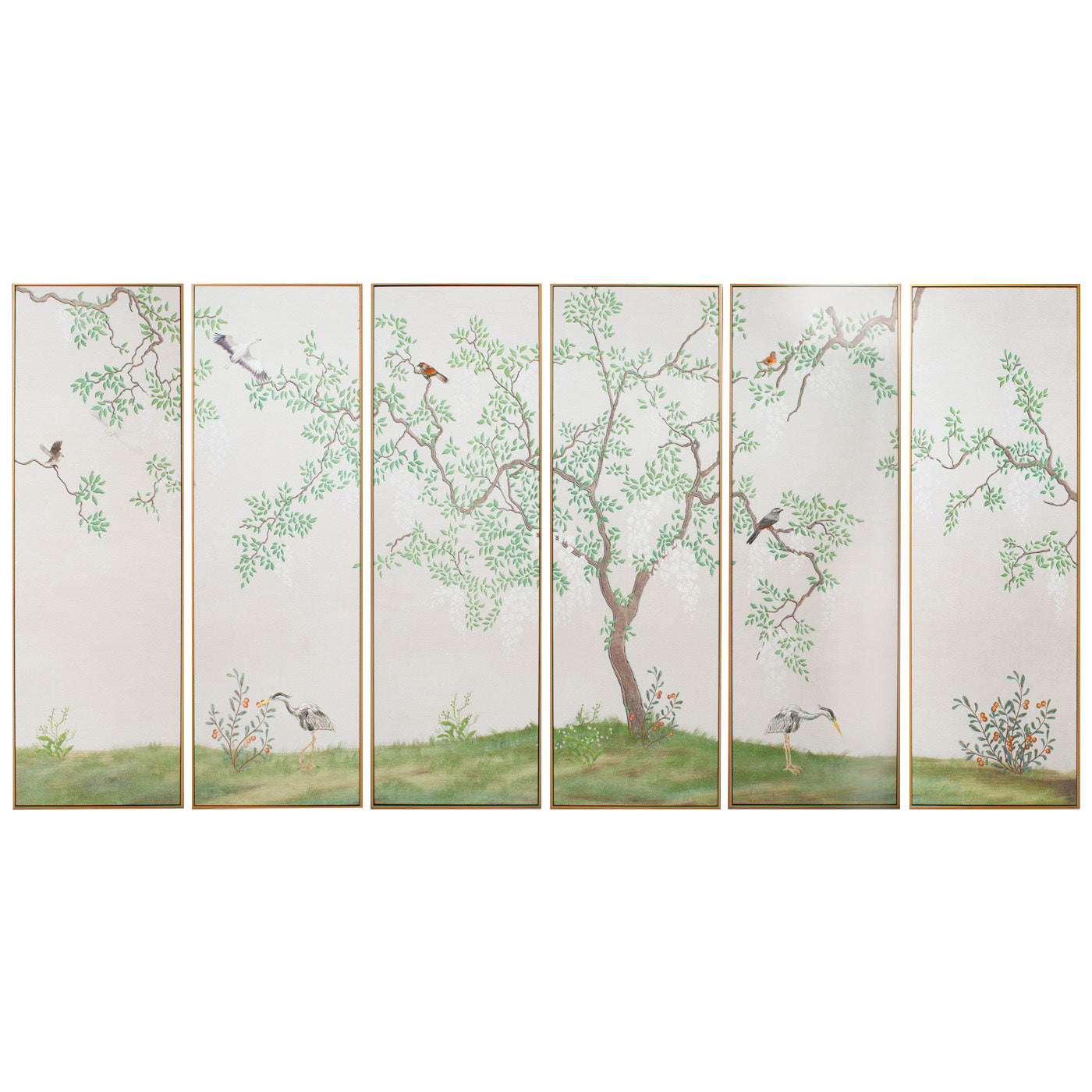 'Blackberry Farm' depicts an idyllic nature scene with 6 silk canvas panels and hand-embroidered birds. The result is a beautiful shimmery three-dimensional effect.