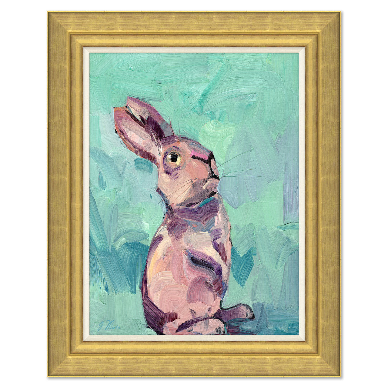 Named for the Lorraine region in France, this is one chic bunny. Canvas print of oil painting by Joseph Mota in gold frame with moulding.