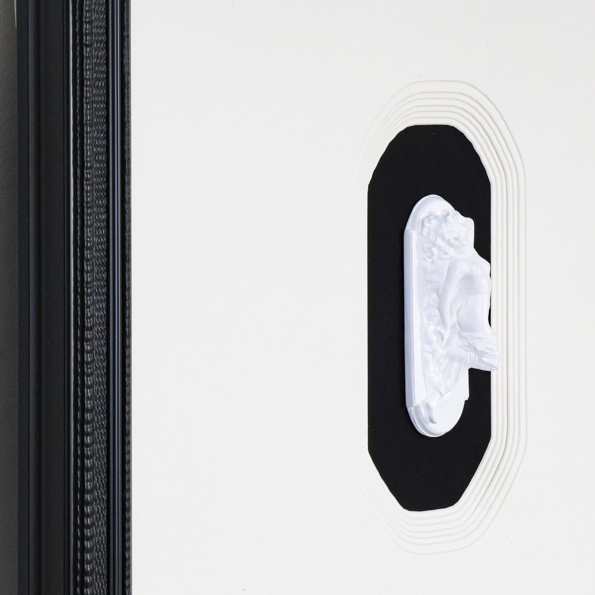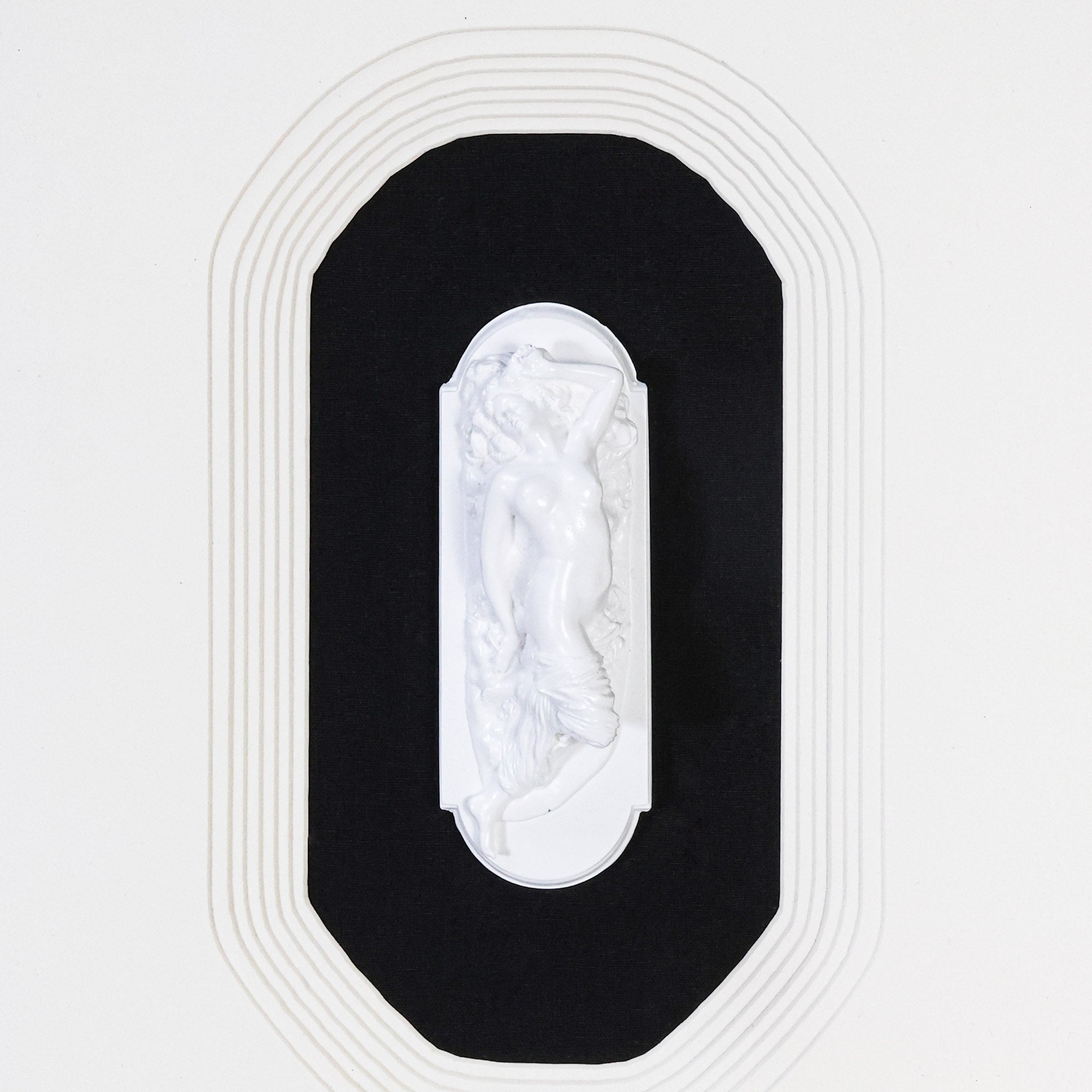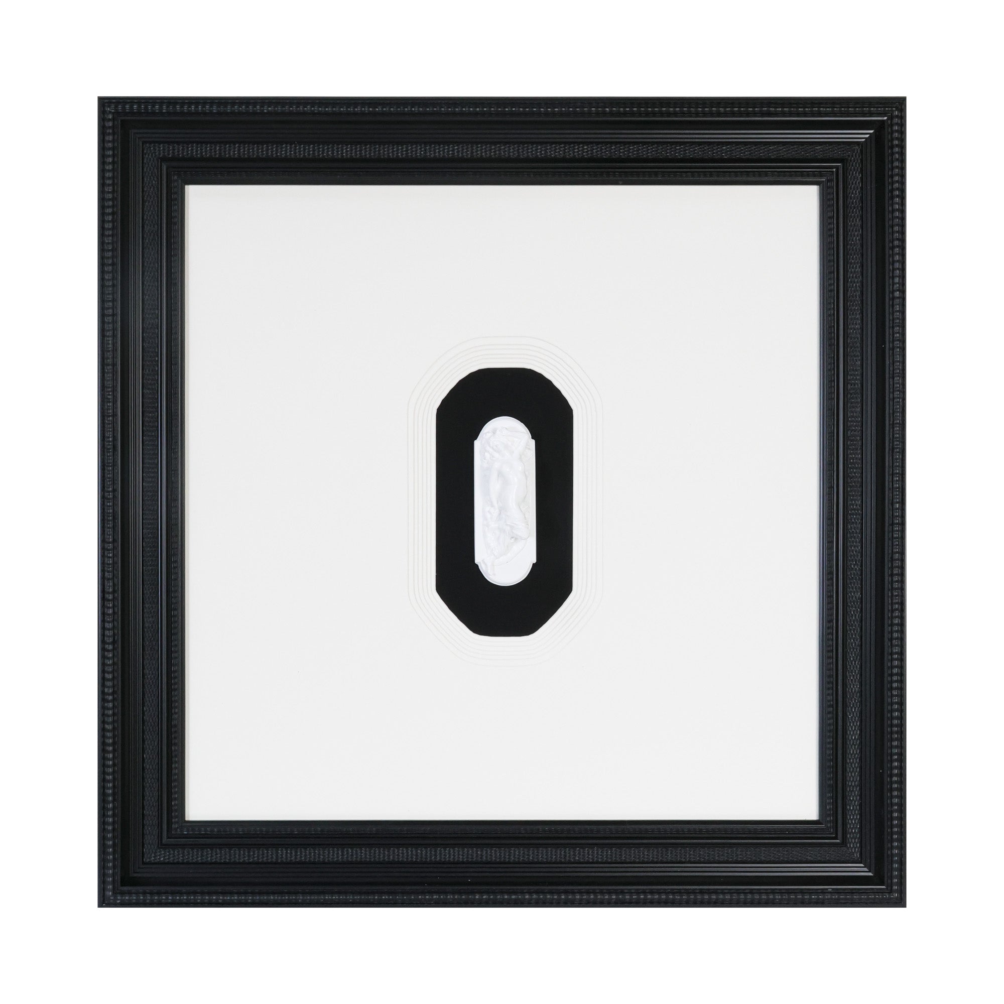 The Chiaroscuro series features roman sculptures crafted of resin with a black and white cardboard overlay and linen base. Framed in a thick traditional frame.