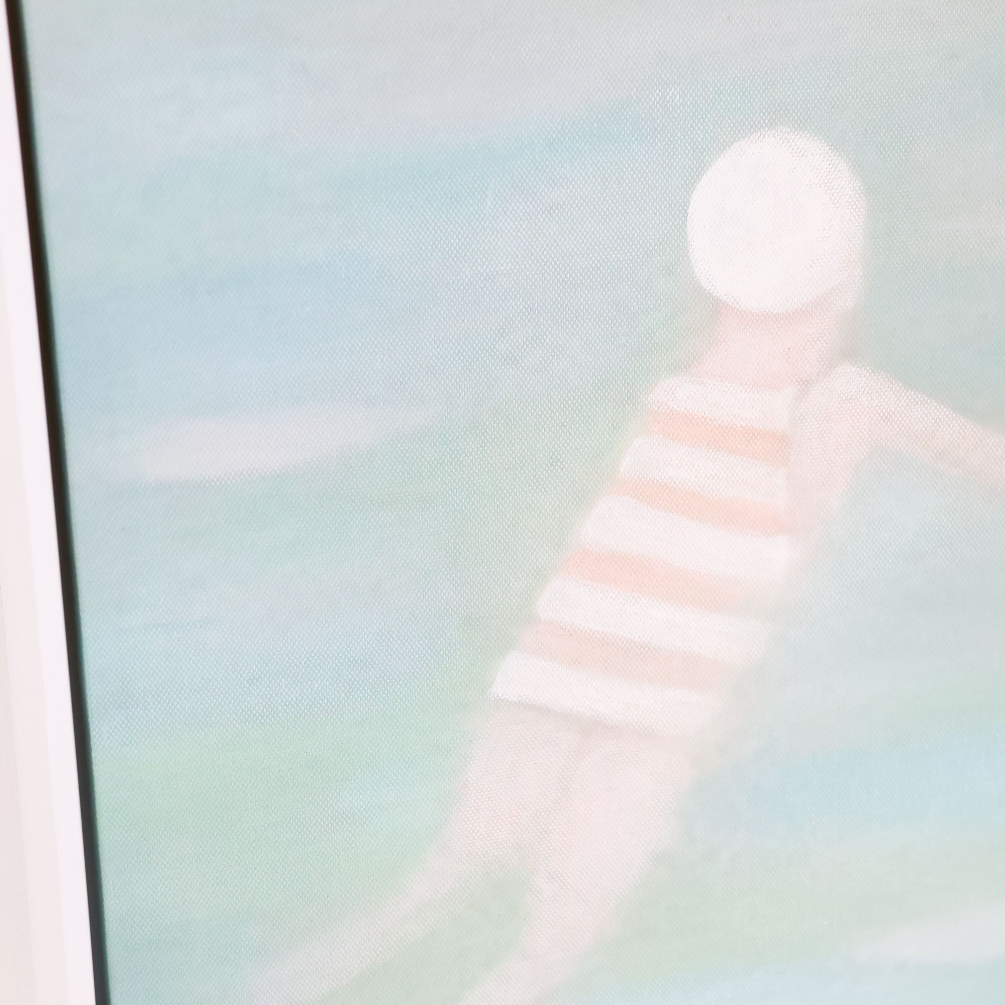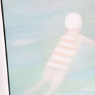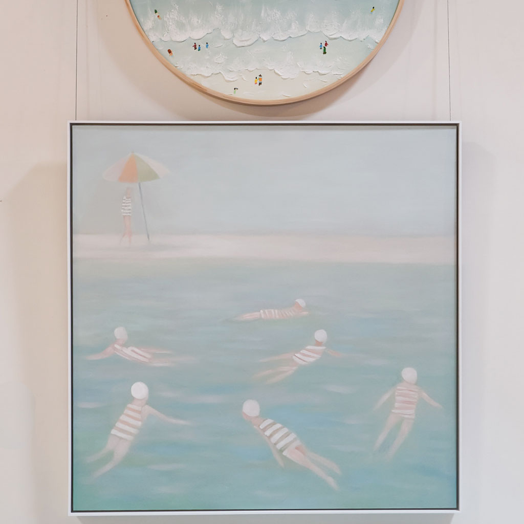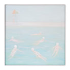 Fog Island pictures abstract striped swimmers floating in a watercolor haze, somewhere between sea and sky. The palette is pale and powdery, the vibe easily nostalgic.