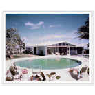 Gicleé print of a 1950's pool day by Tom Leonard. 'General Electric Wonder House' is printed on archival paper and framed in a white painted wood frame.
