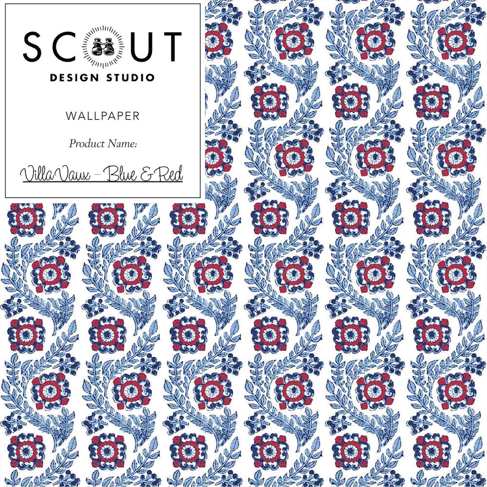 Villa Vaux Wallpaper in Blue and Red Sample