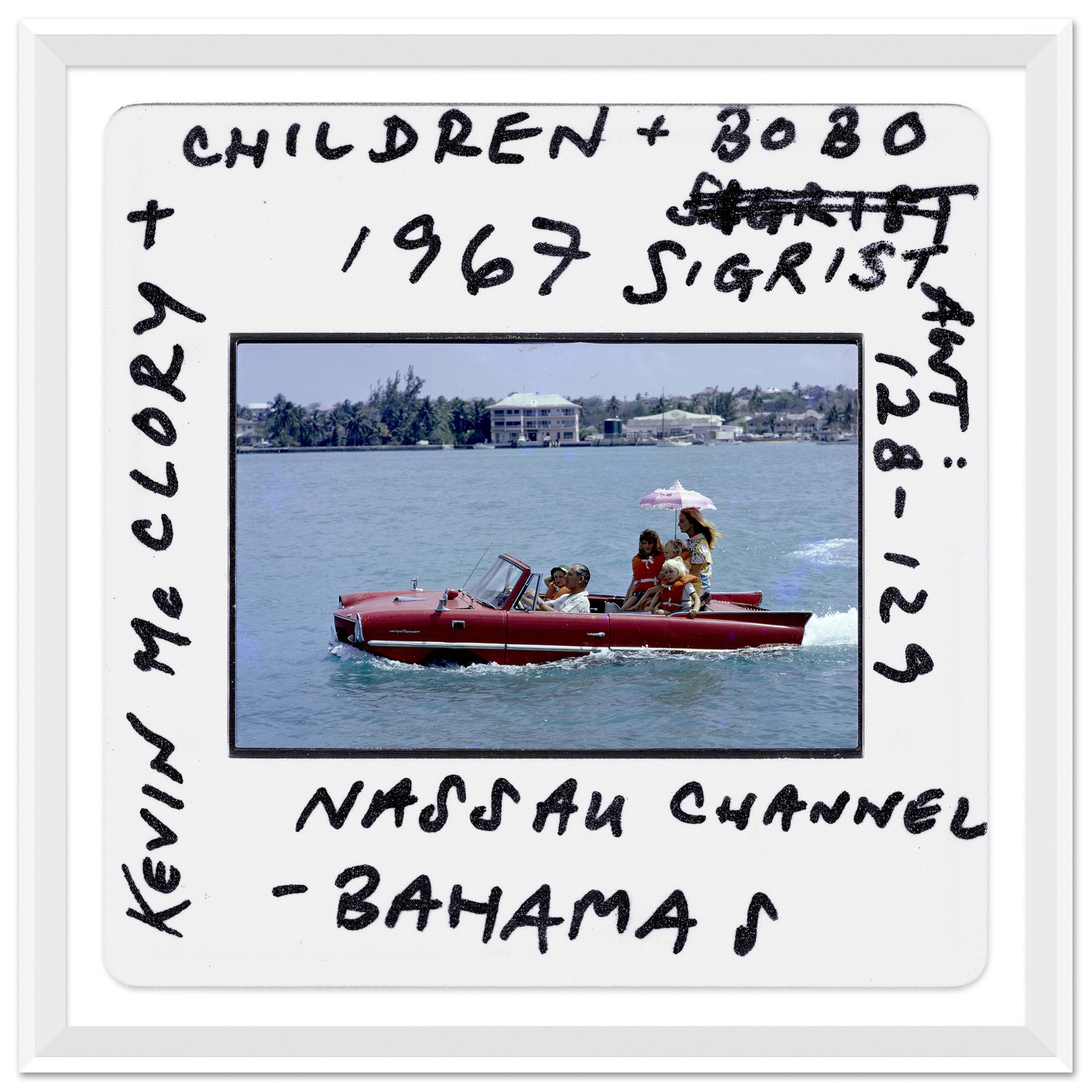 Photography by Slim Aarons of film producer Kevin McClory taking his wife Bobo Sigrist and their family for a drive in an ‘Amphicar’ across the harbor at Nassau. The children are Bianca Juarez (Bobo’s daughter from another relationship) and Siobhan, Branwell, and Saoirse McClory.