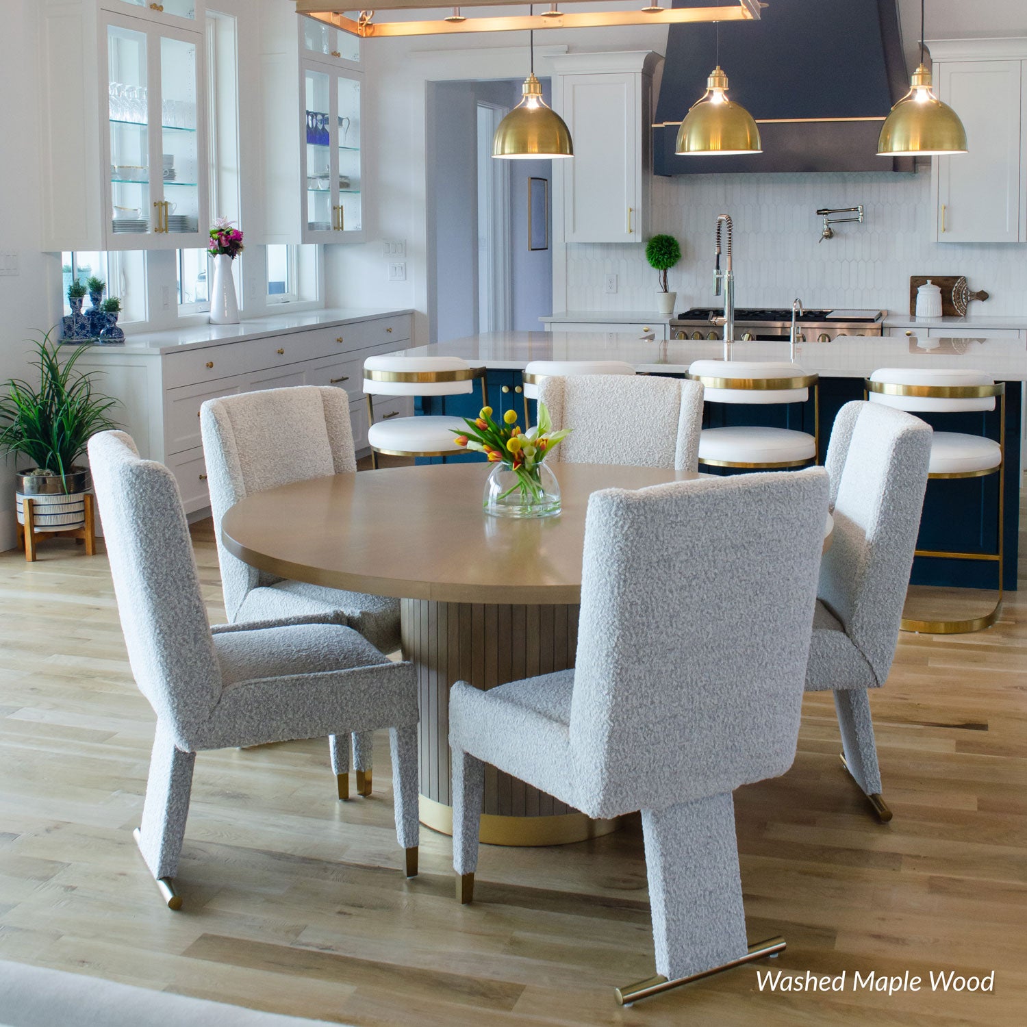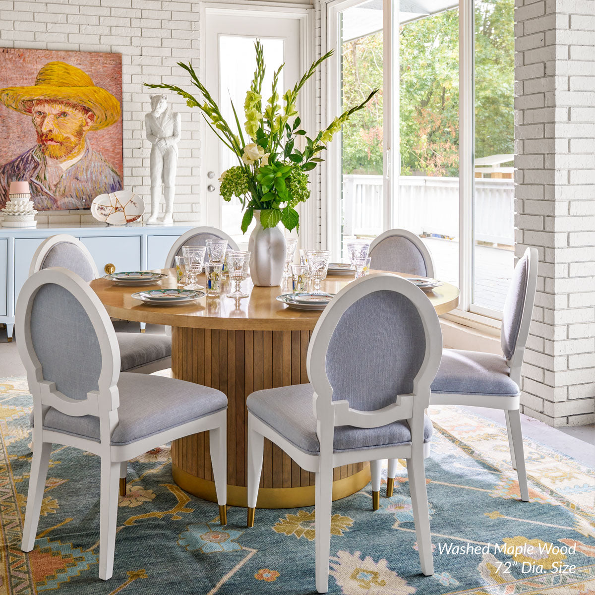 Our Anders Table features a paneled pedestal base with a luxe touch of painted brass to set it off. Maple wood with a special Scout wash gives it timeless character.