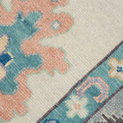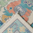 This custom oushak-inspired wool rug was designed by Scout and hand woven with a Turkish-style knot by artisans in India. The piece features a neutral background and border with an array of cool and warm-toned motifs.