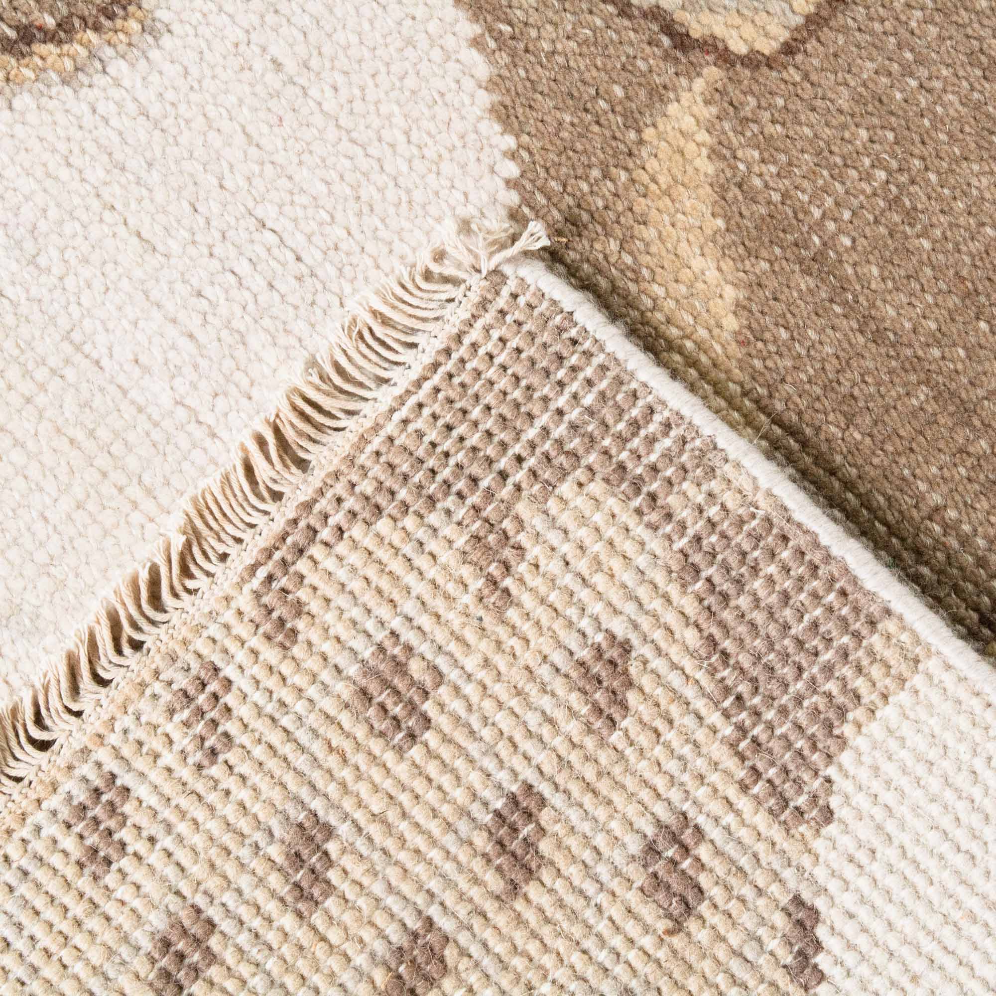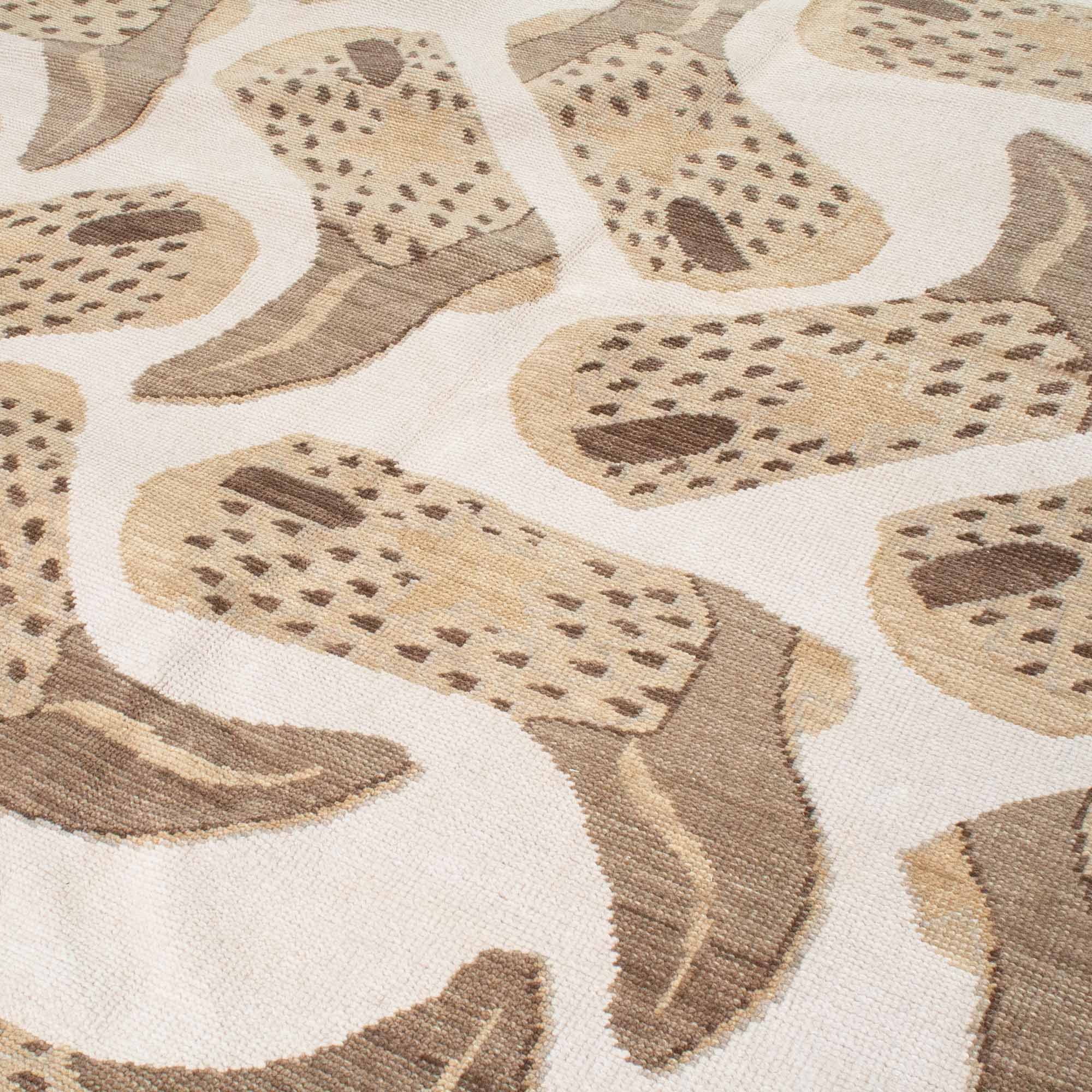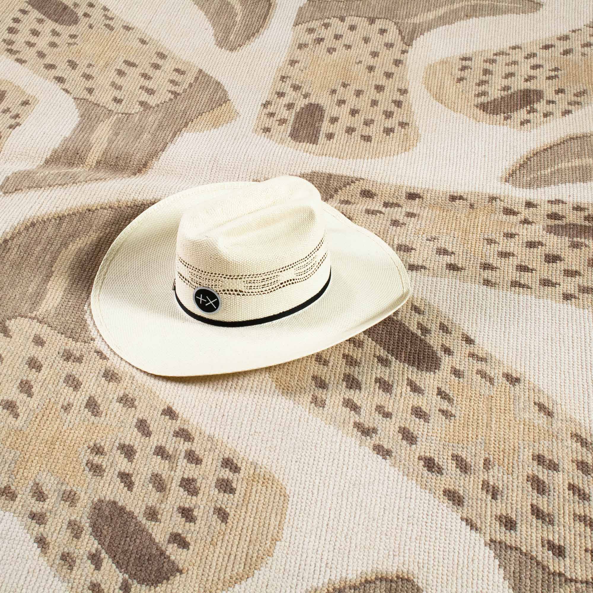 This custom oushak-inspired wool rug was designed by Scout and hand woven with a Turkish-style knot by artisans in India. The piece features an ivory background and an array of classic brown cowboy boots.