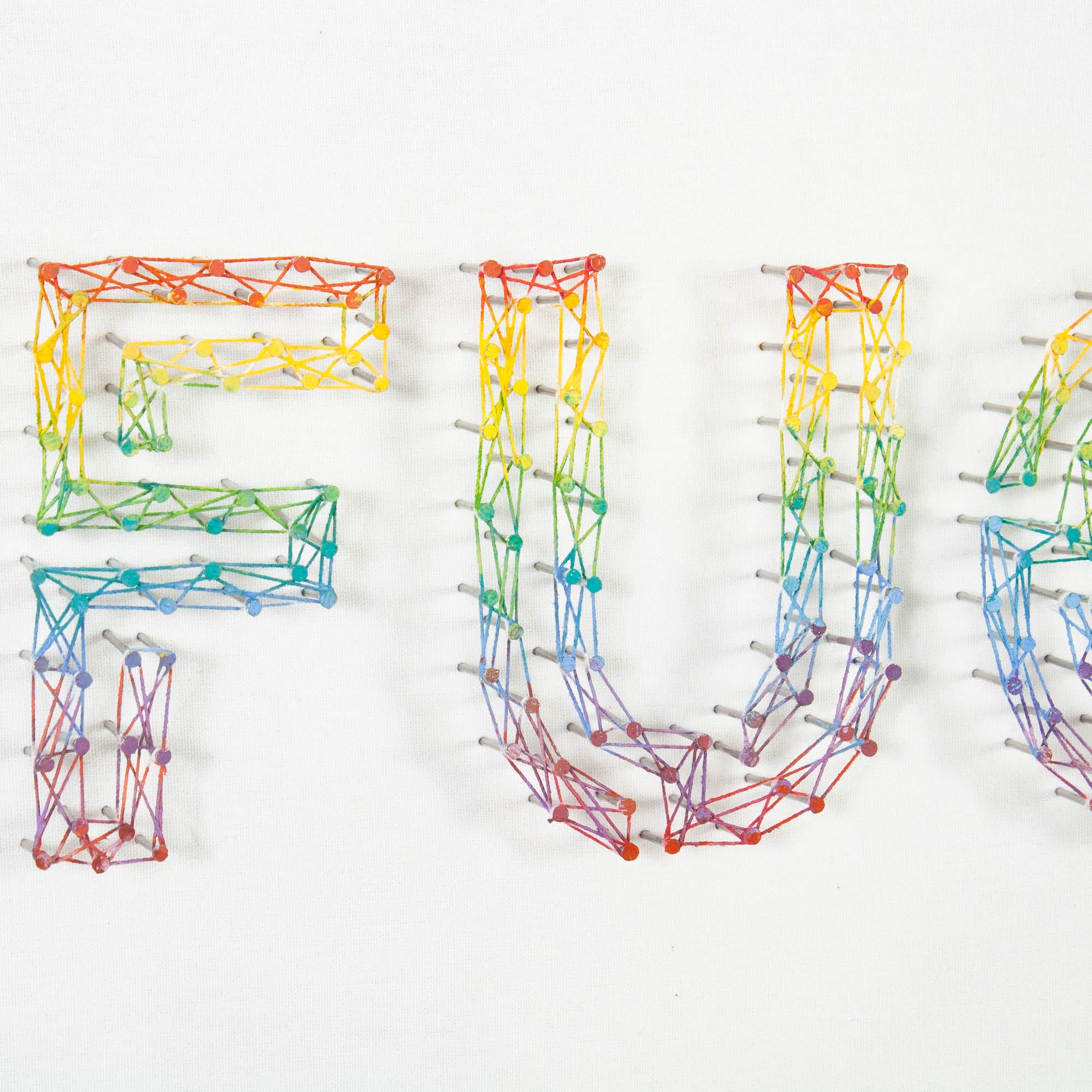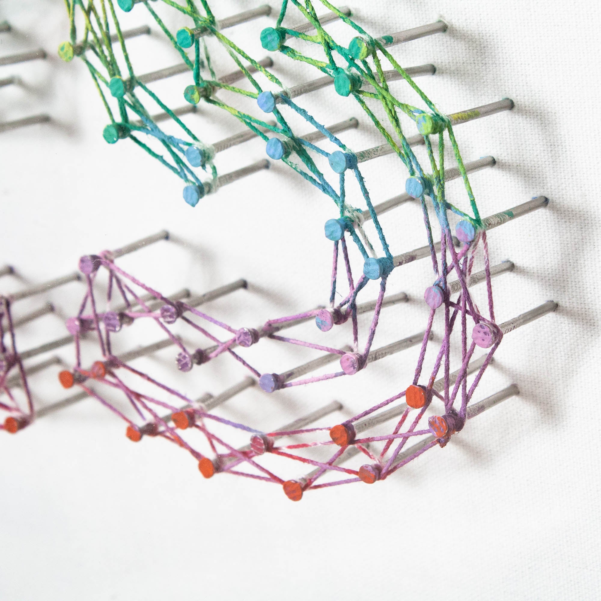 From the Tat Frederick studio, 'C'est La Fucking Vie' features multi color strings, hand wrapped onto nails. Each nail is hammered into canvas with care and painted along with the string to form a rainbow effect. Framed in an acrylic shadowbox.