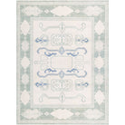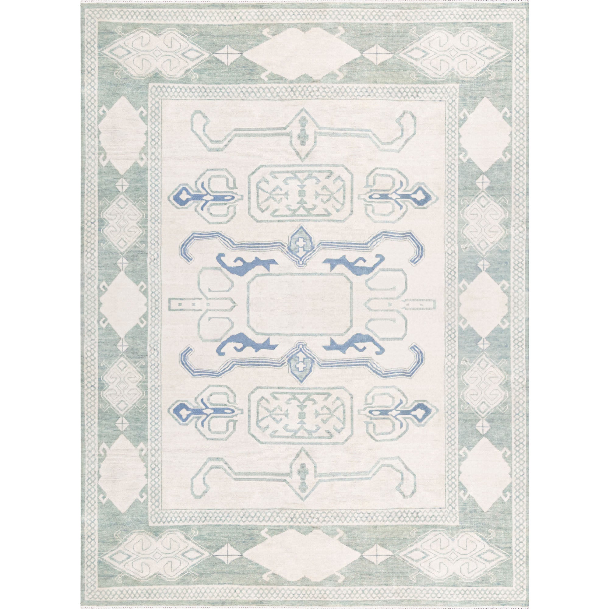 This custom oushak-inspired wool rug was designed by Scout and hand woven with a Turkish-style knot by artisans in India. The piece depicts a pattern comprised of blue, muted green & ivory.