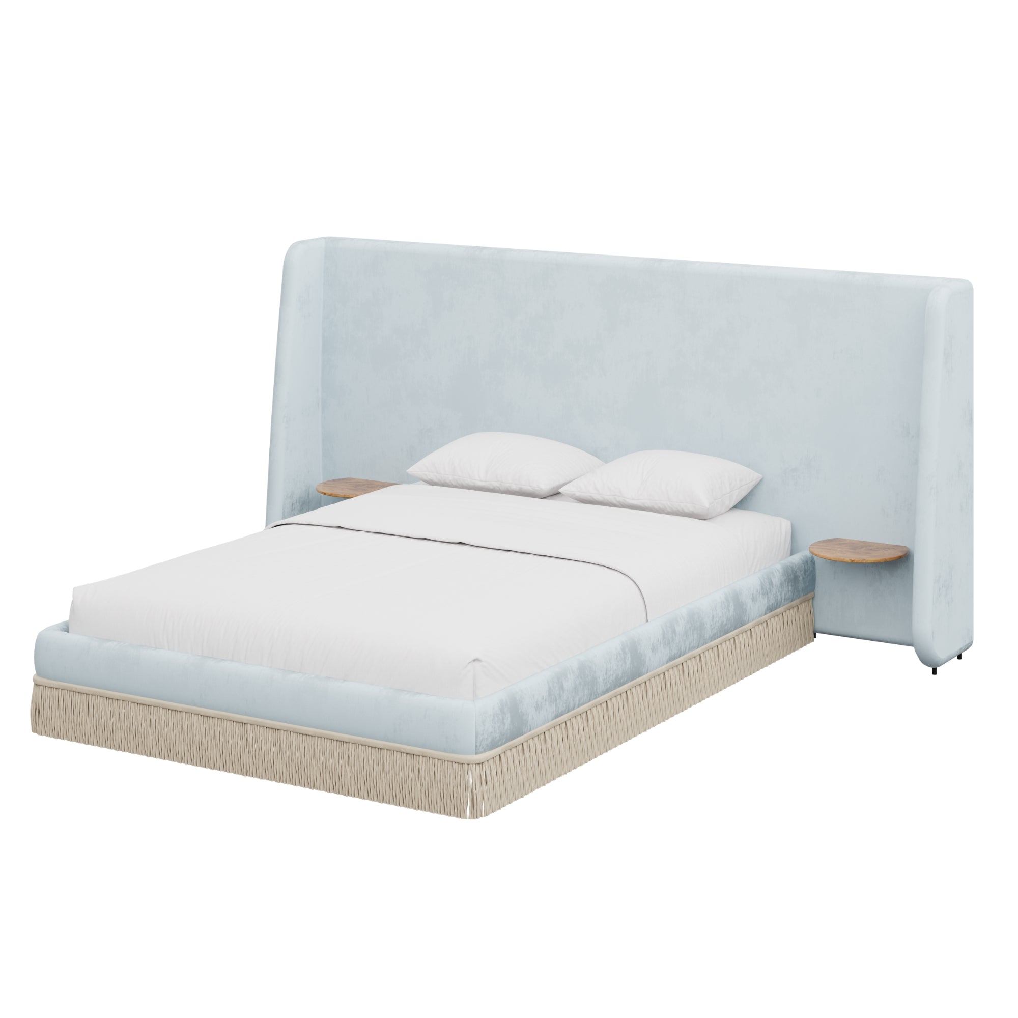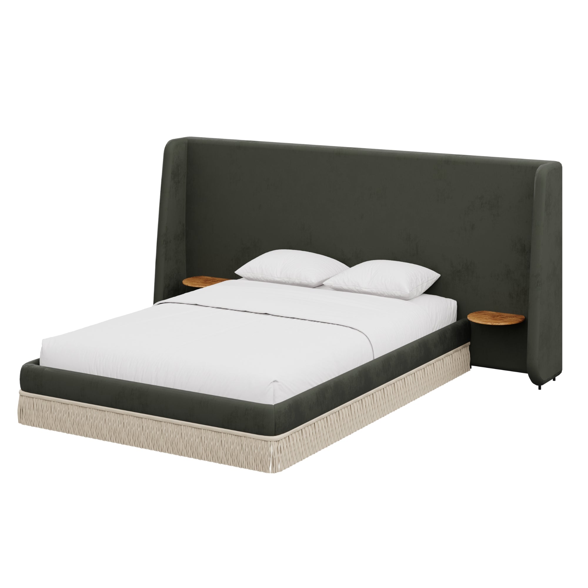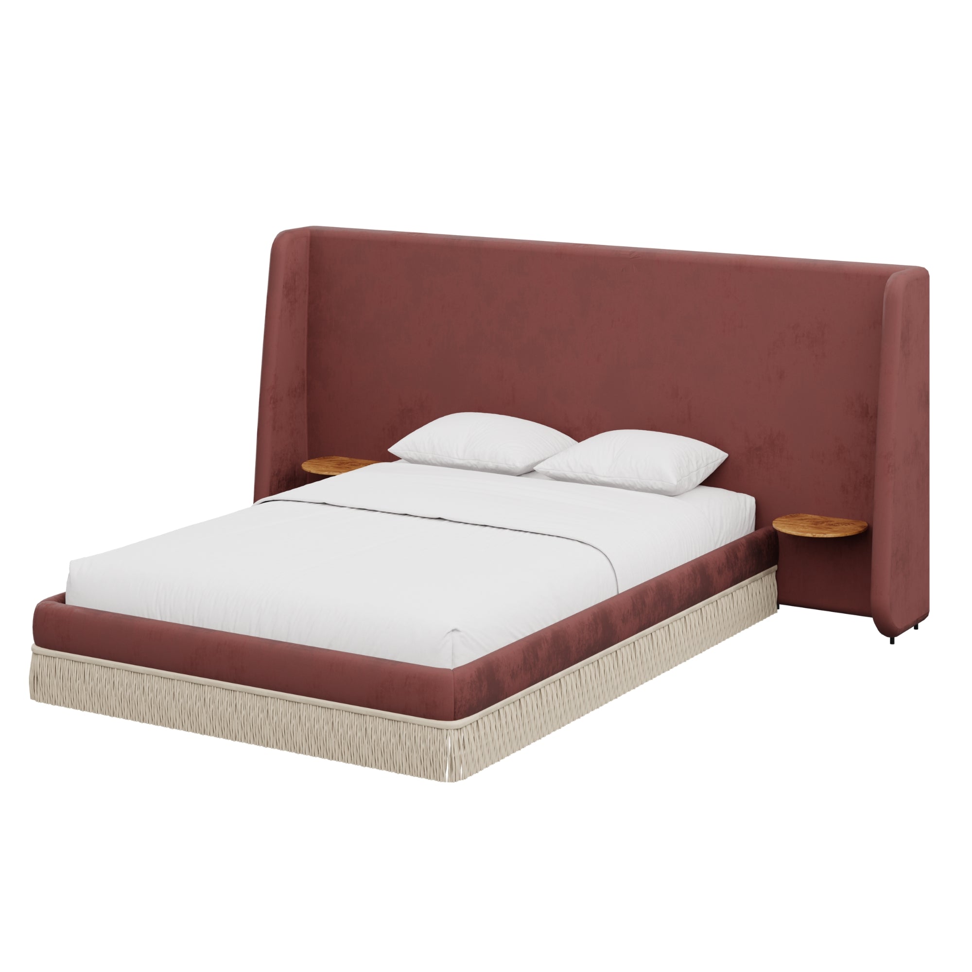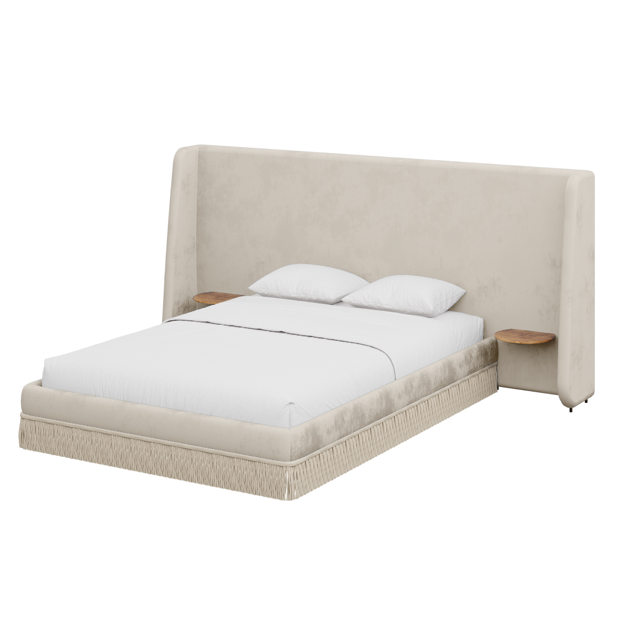 Floating golden pecan mappa burl nightstands are seamlessly integrated into the headboard—practicality, meet panache. Made to order in the fabric of your choice, our custom Boudoir Bed features a buillon fringe skirt and grand, winged headboard.