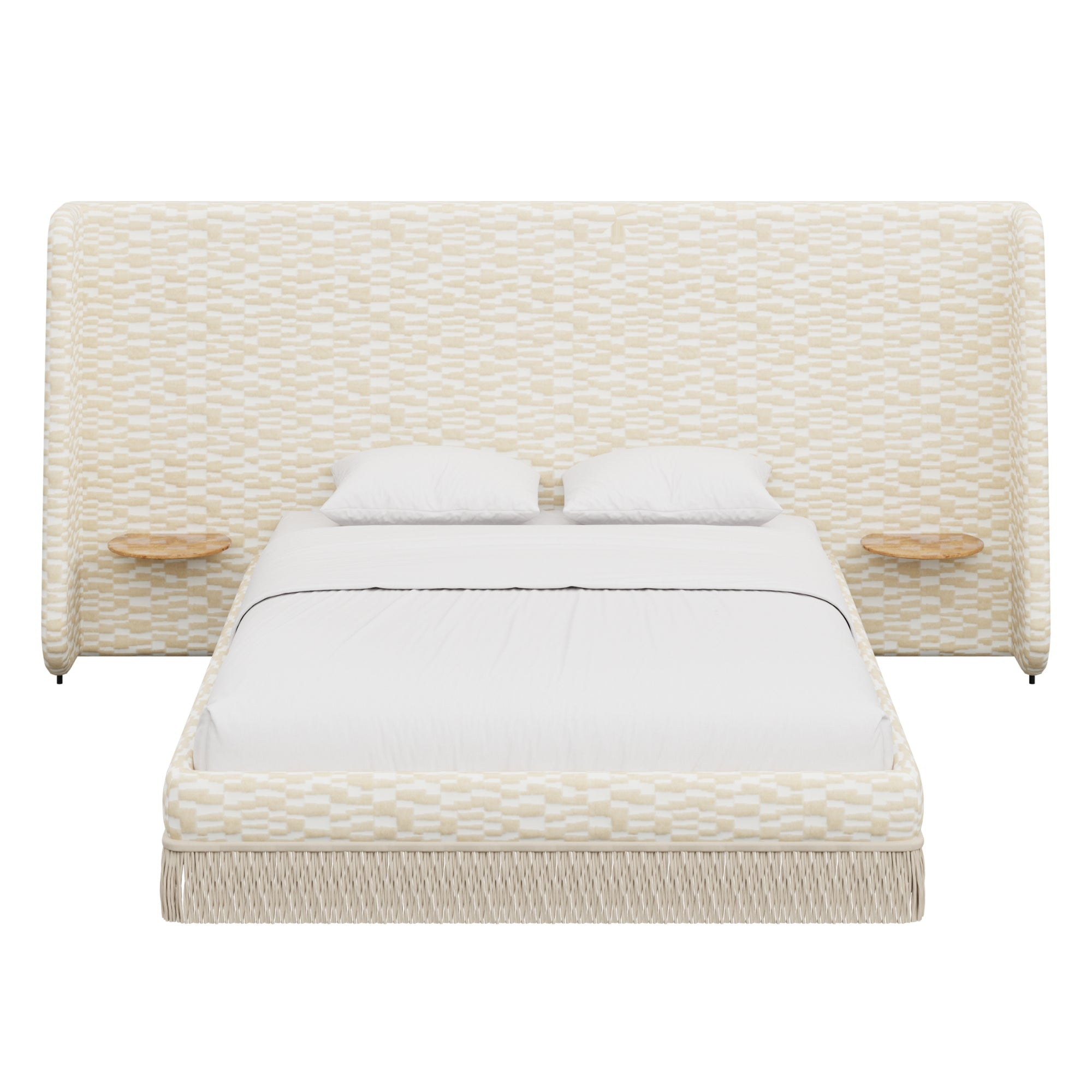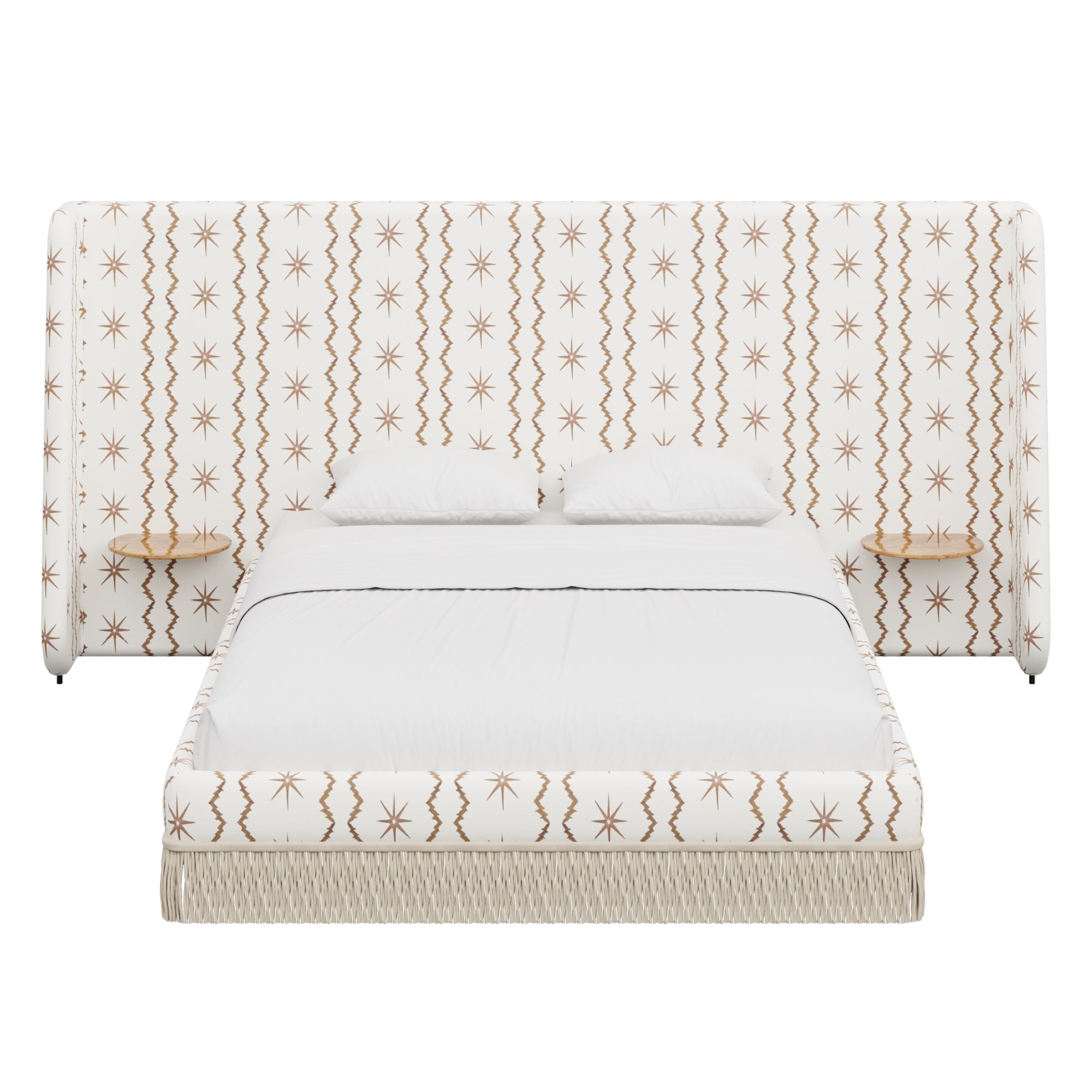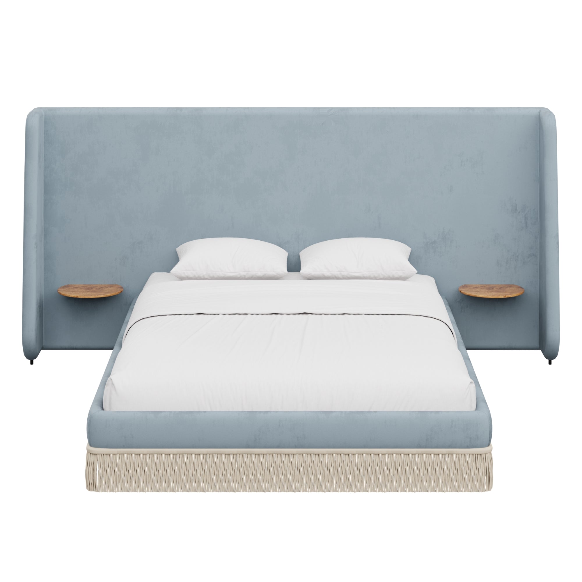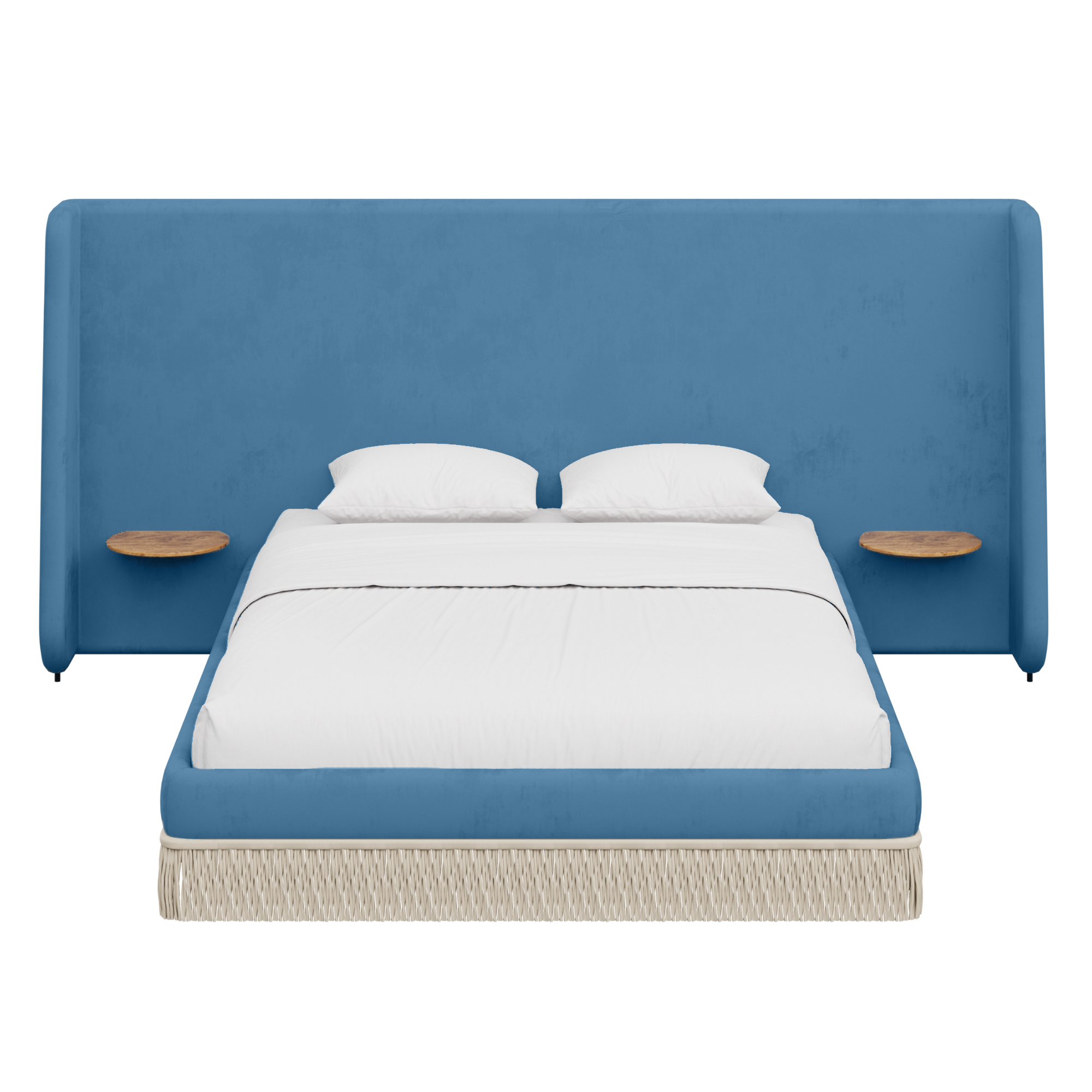 Floating golden pecan mappa burl nightstands are seamlessly integrated into the headboard—practicality, meet panache. Made to order in the fabric of your choice, our custom Boudoir Bed features a buillon fringe skirt and grand, winged headboard.