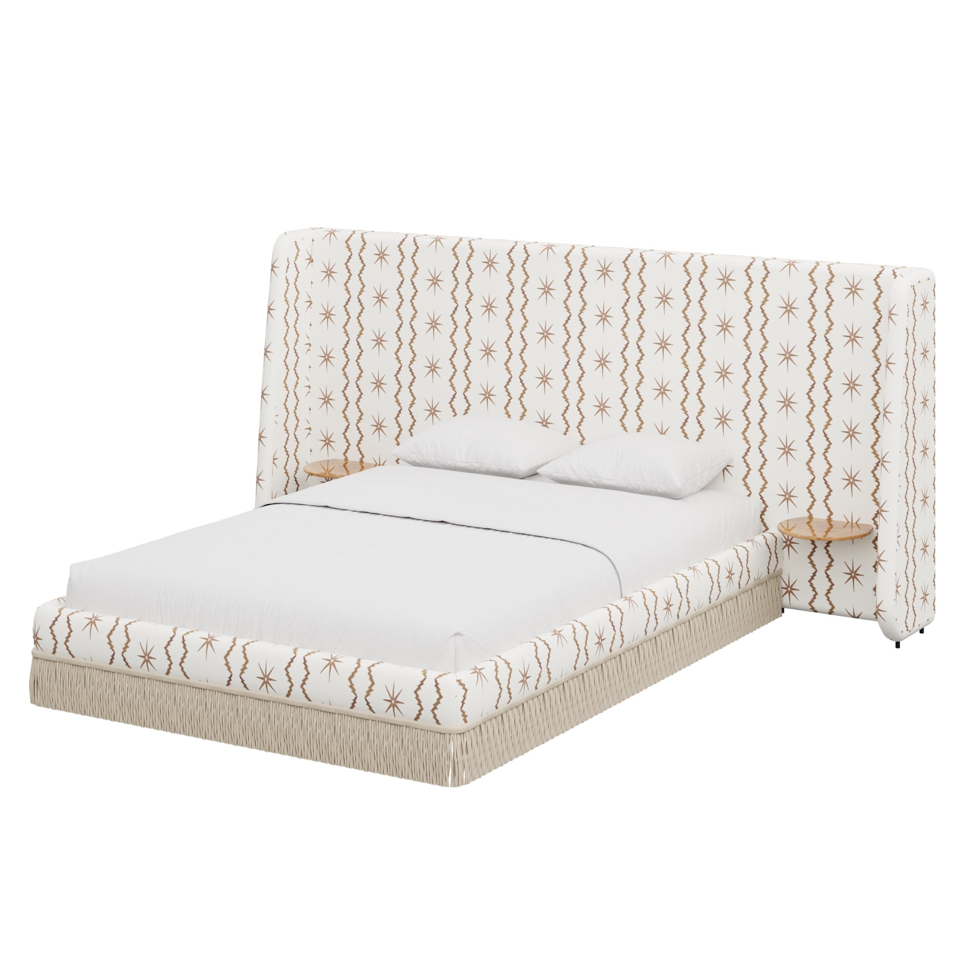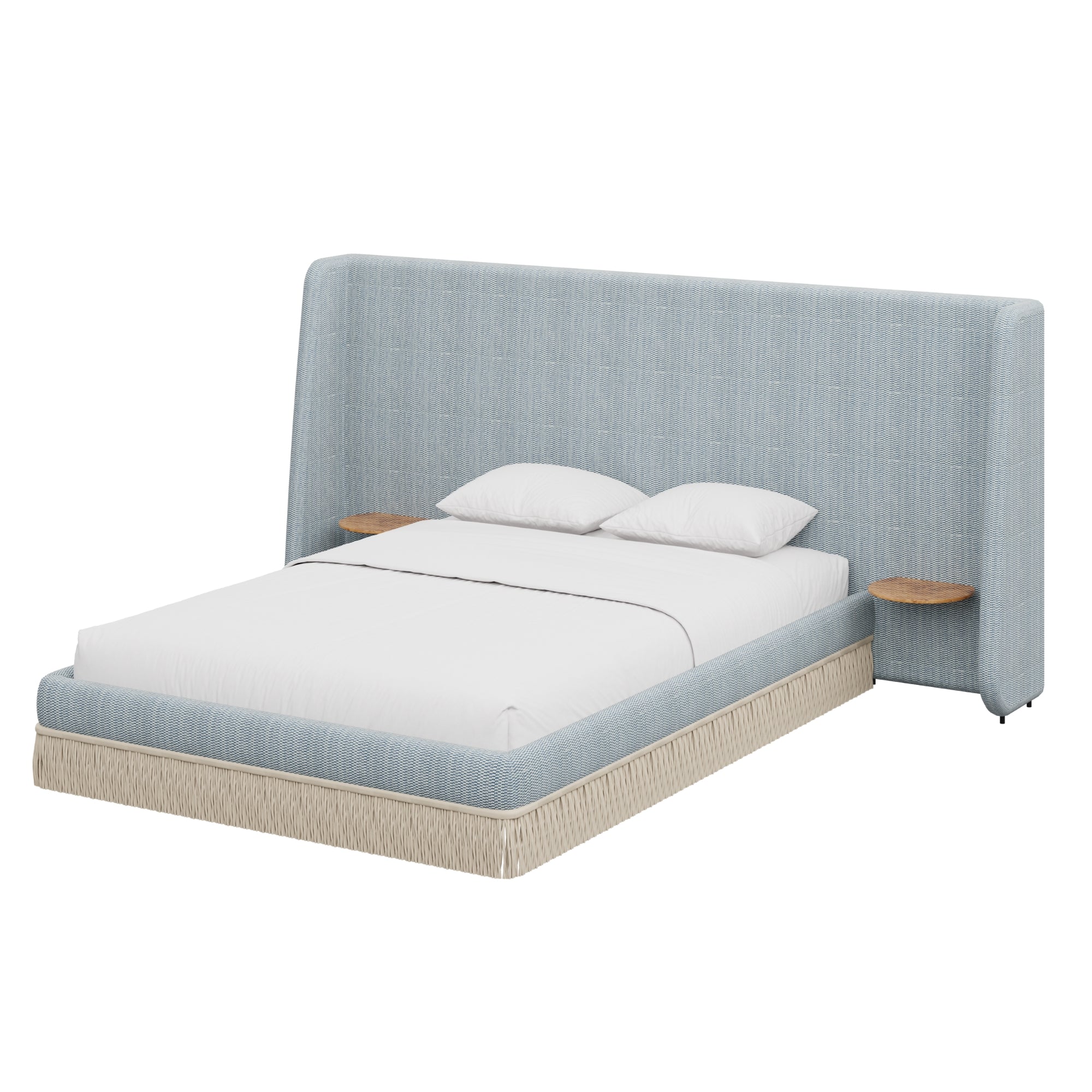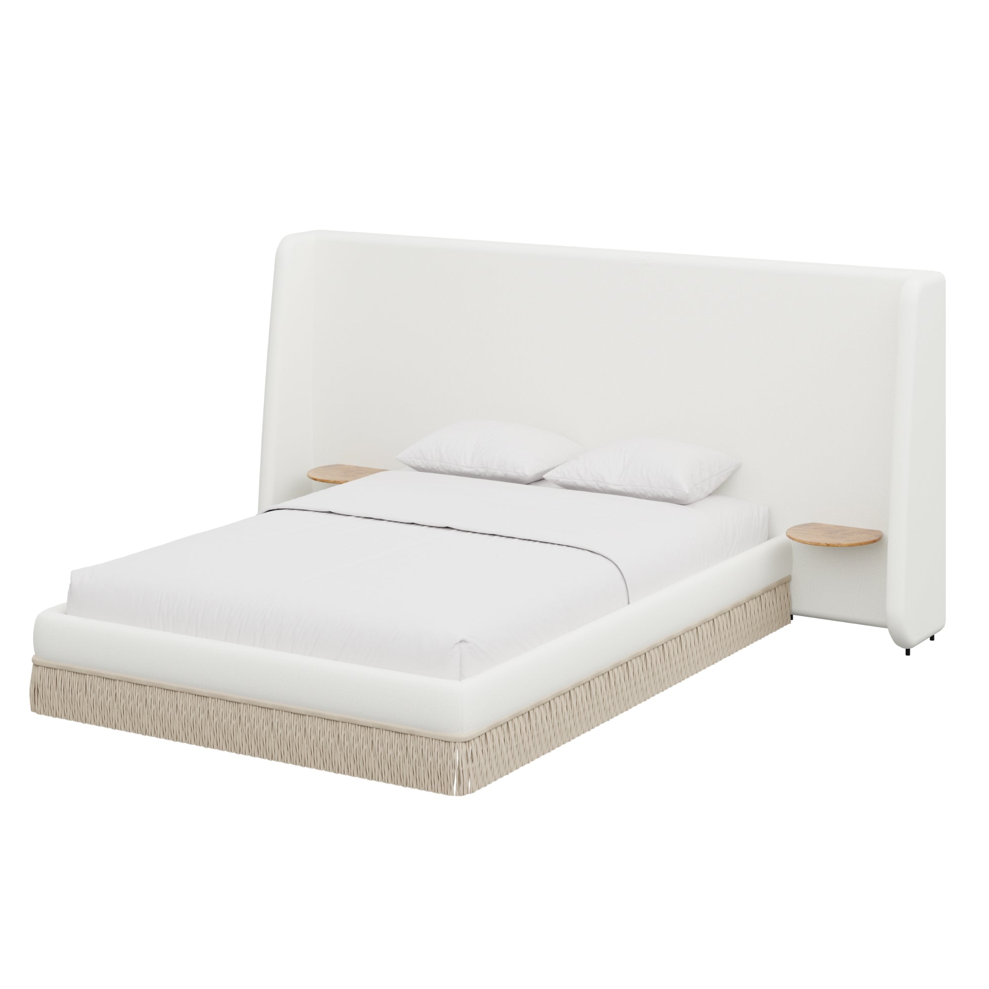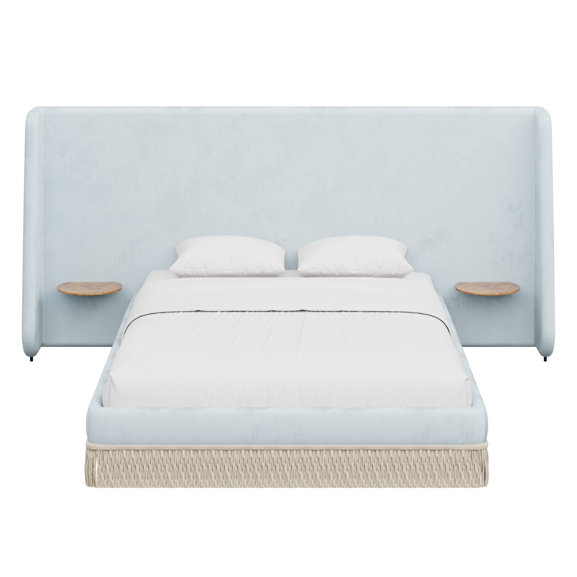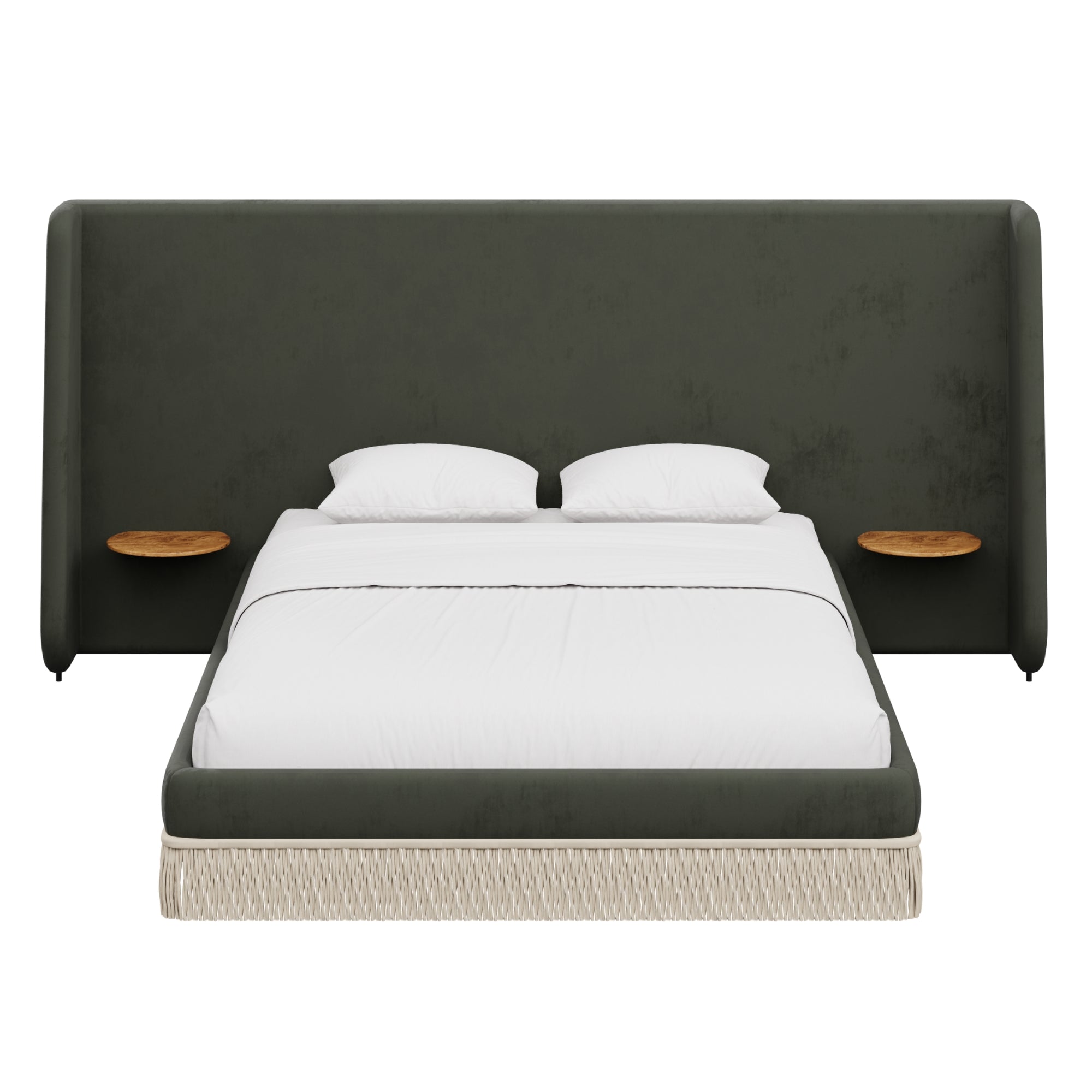 Floating golden pecan mappa burl nightstands are seamlessly integrated into the headboard—practicality, meet panache. Made to order in the fabric of your choice, our custom Boudoir Bed features a buillon fringe skirt and grand, winged headboard.