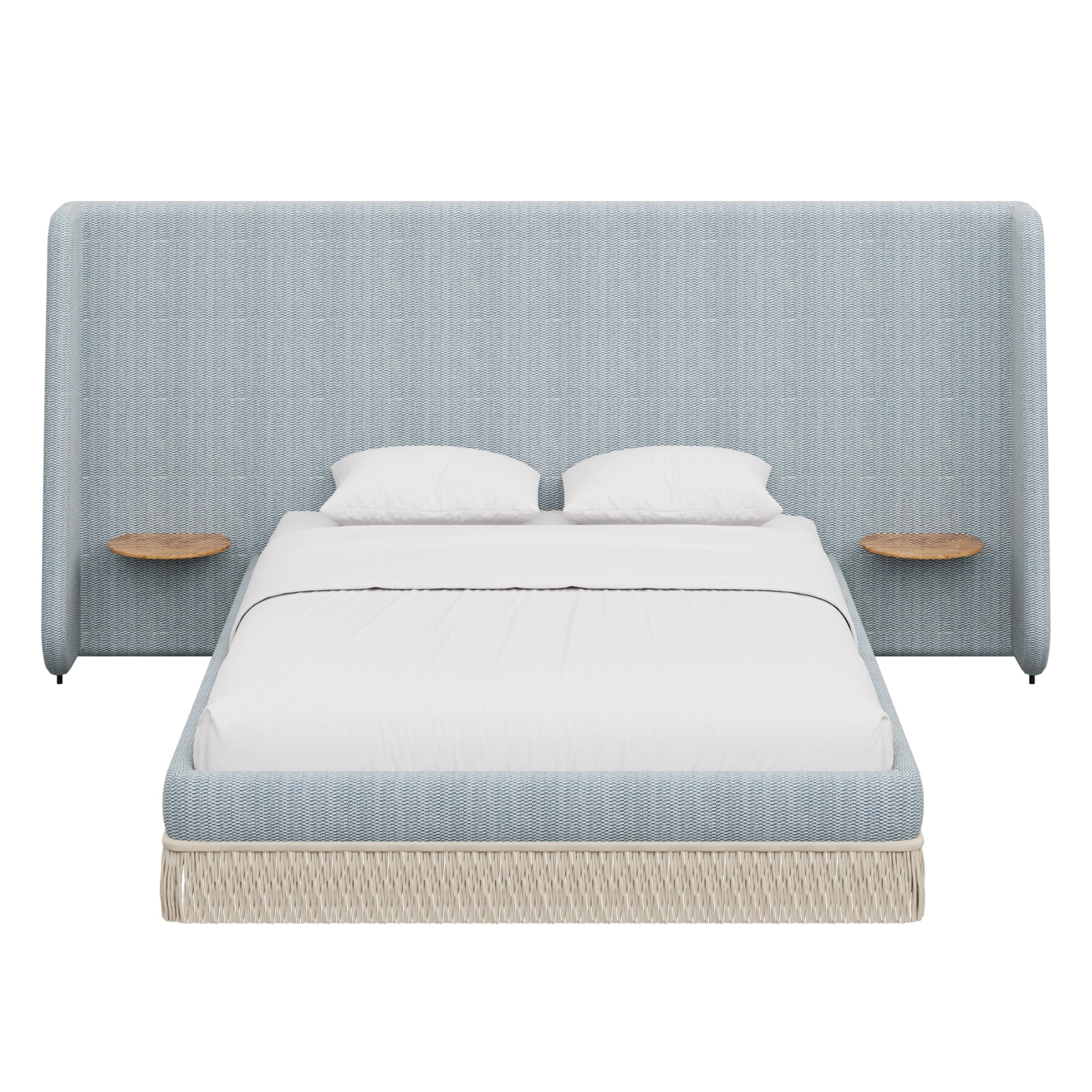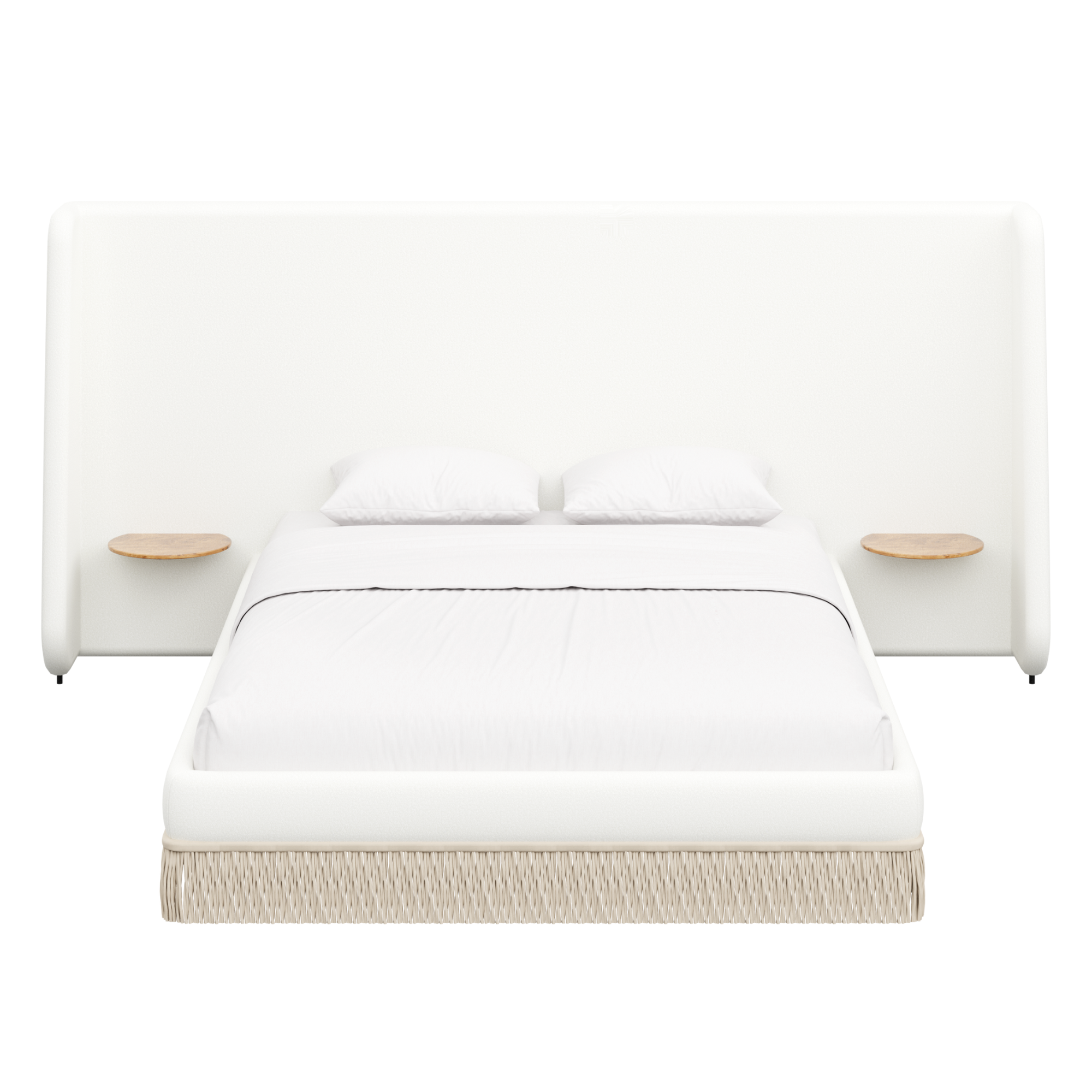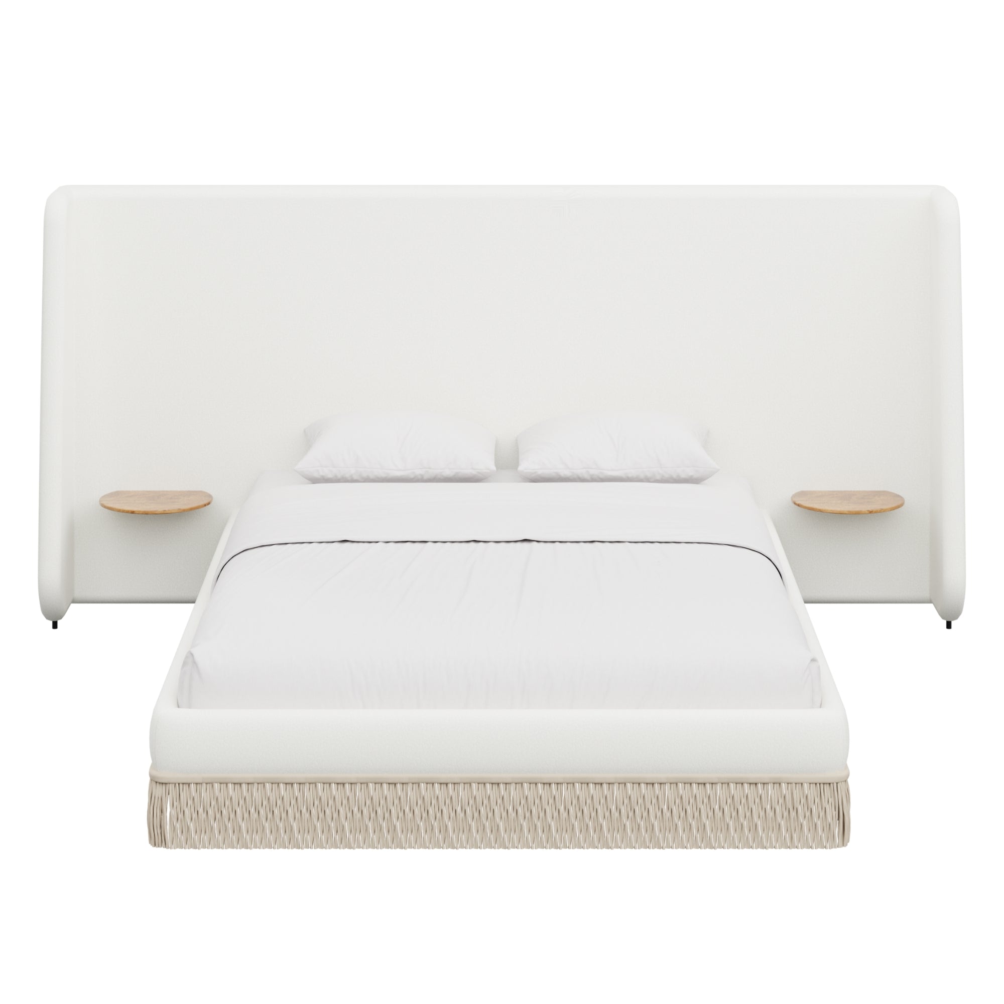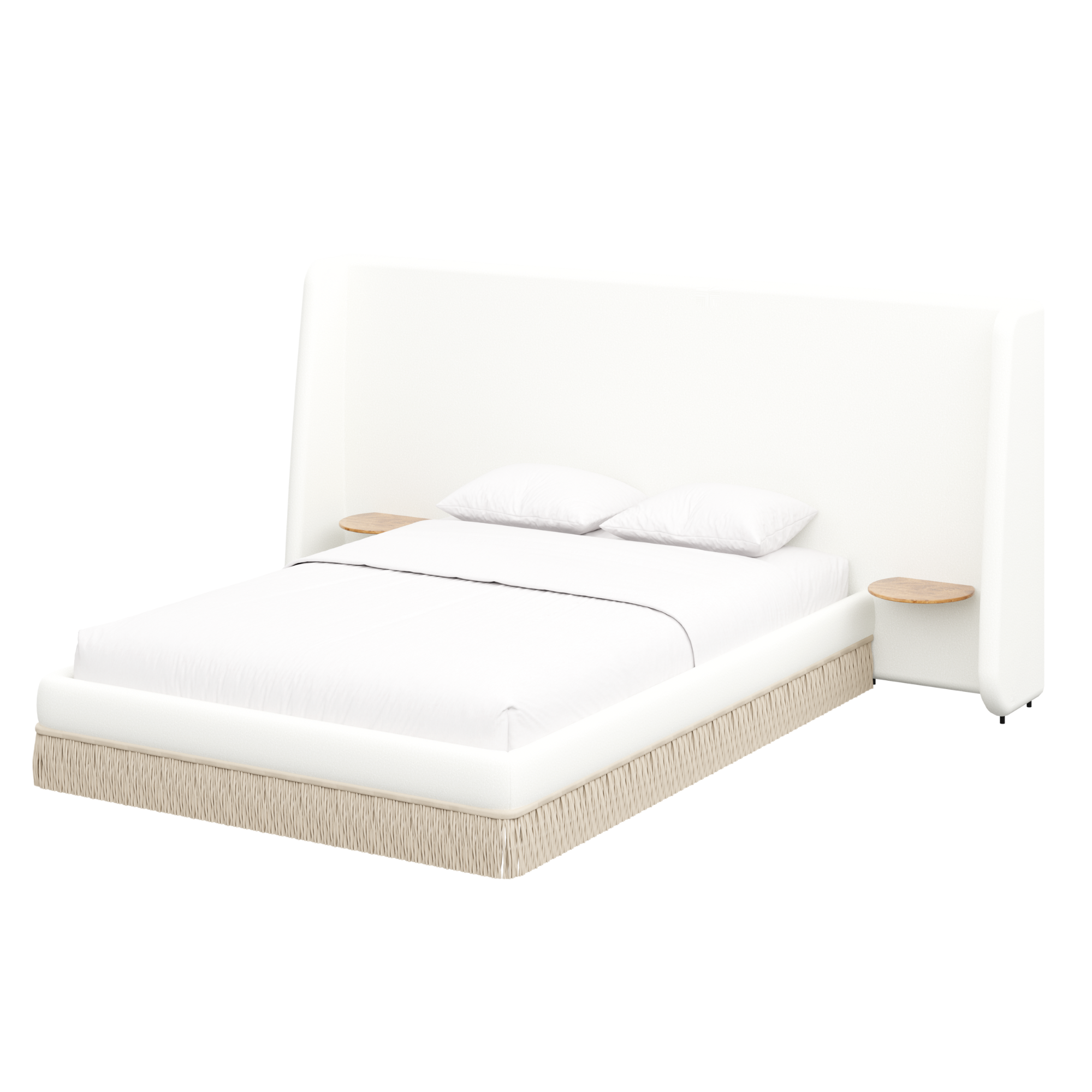 Floating golden pecan mappa burl nightstands are seamlessly integrated into the headboard—practicality, meet panache. Made to order in the fabric of your choice, our custom Boudoir Bed features a buillon fringe skirt and grand, winged headboard.