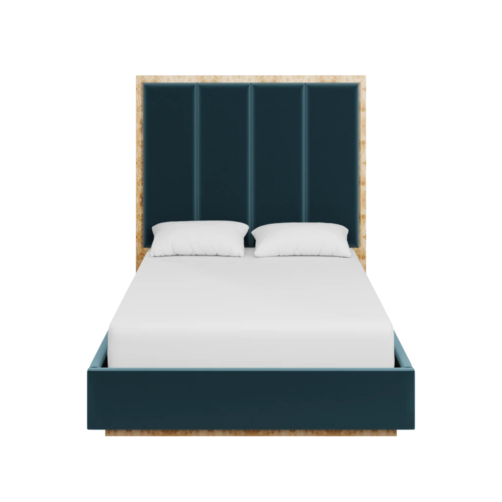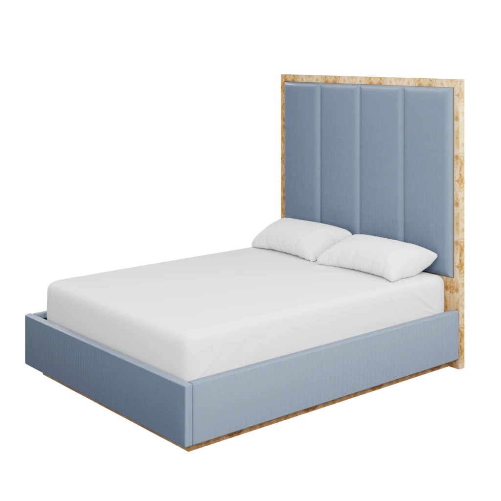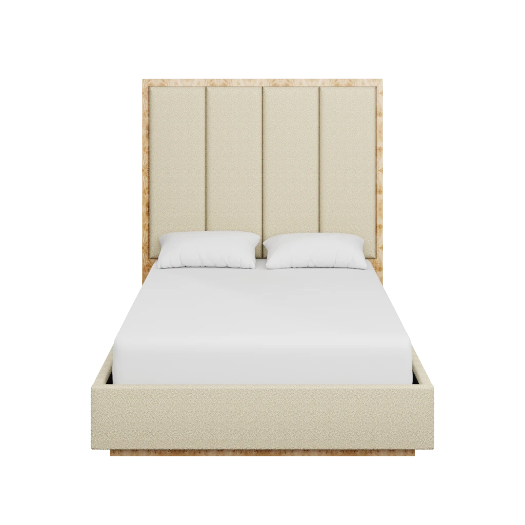 Made to order in the fabric of your choice, our custom Brant Bed boasts an organic burl back and base in our Golden Pecan Mappa Burl, with upholstered side railing and panels on the back.