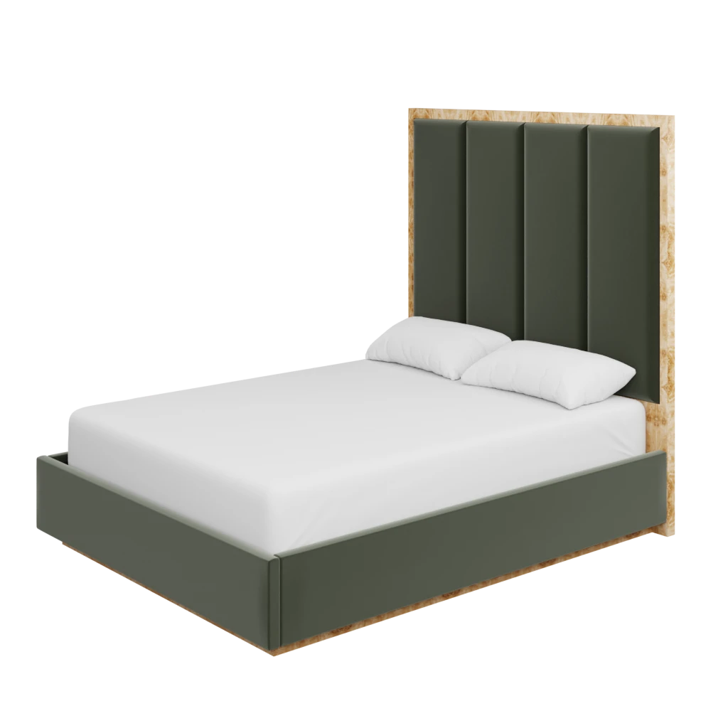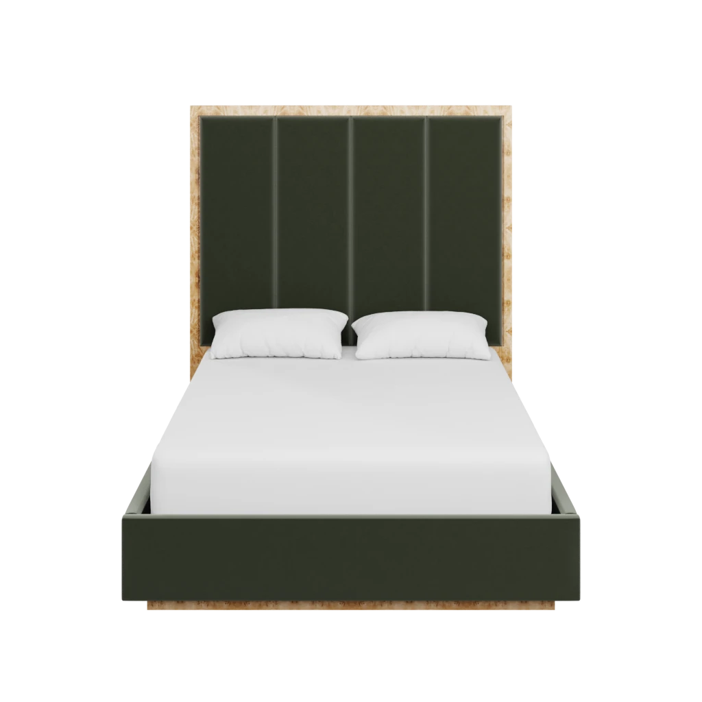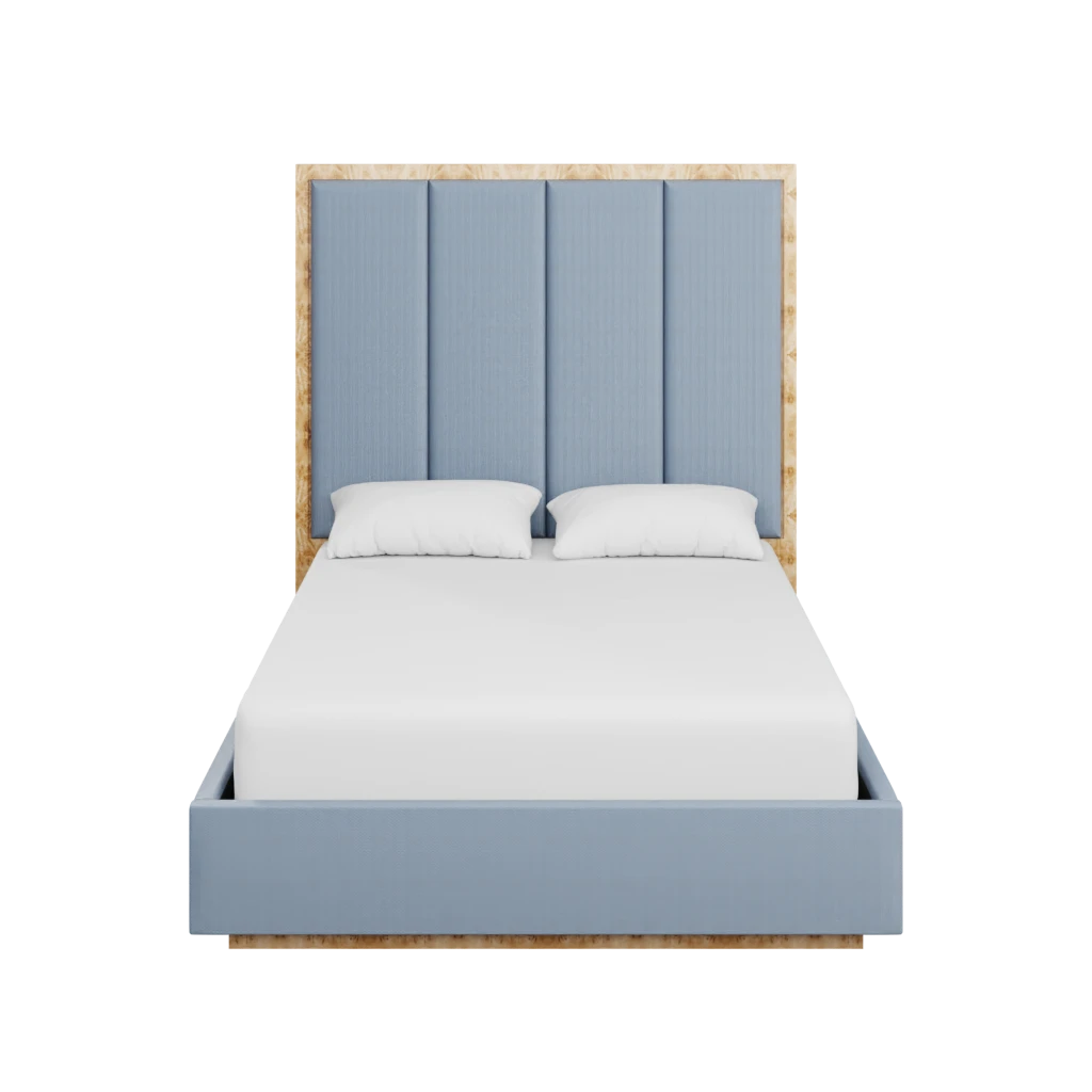 Made to order in the fabric of your choice, our custom Brant Bed boasts an organic burl back and base in our Golden Pecan Mappa Burl, with upholstered side railing and panels on the back.