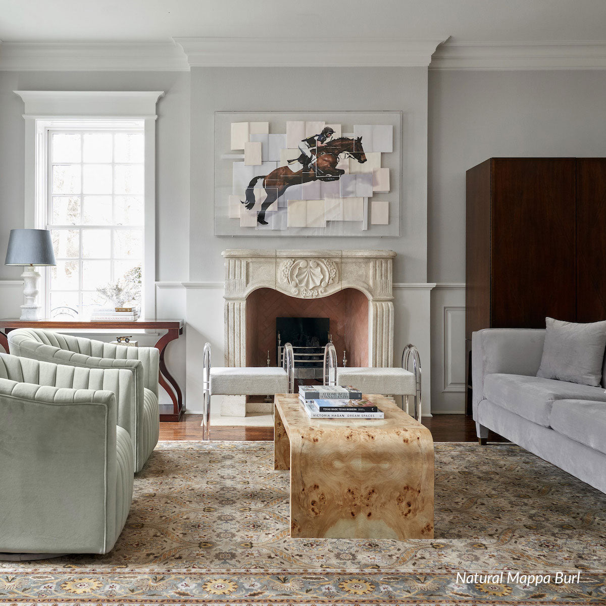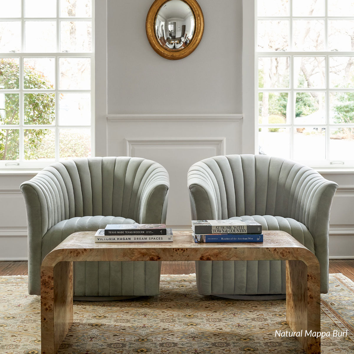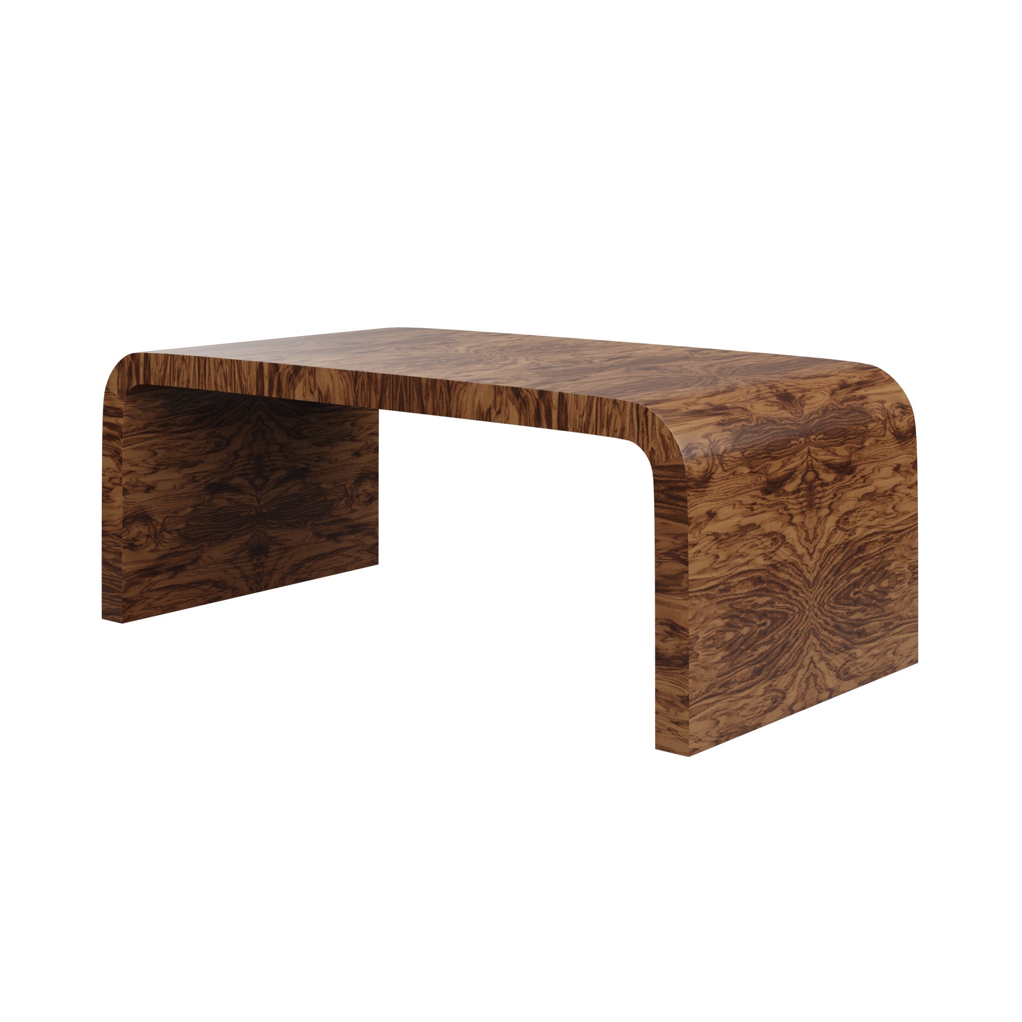 Our Janus Coffee Table features a simple design that curves into a waterfall edge. Its clean shape lends itself to styling versatility with a stunning burl finish. Learn more about the beauty of burl here!