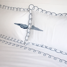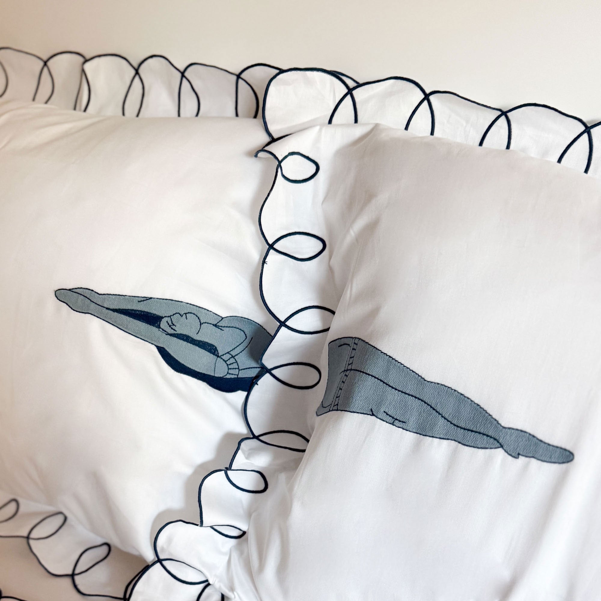 This duvet set dives right in. Featuring custom embroidered swimmers and loopy navy trim that borders the duvet, this bedding brings a playful plunge to polished design.