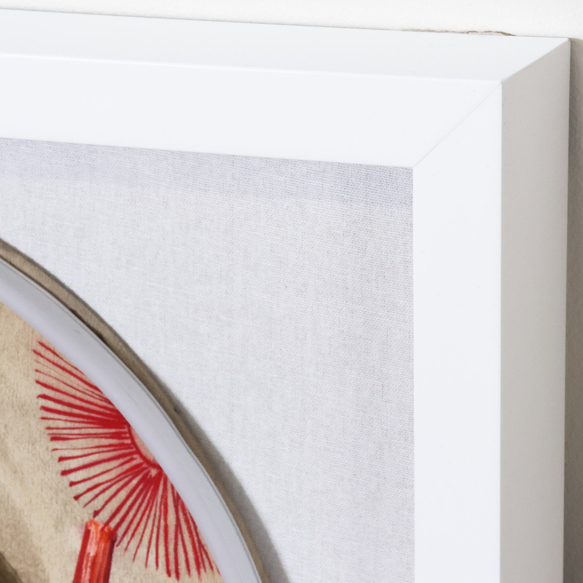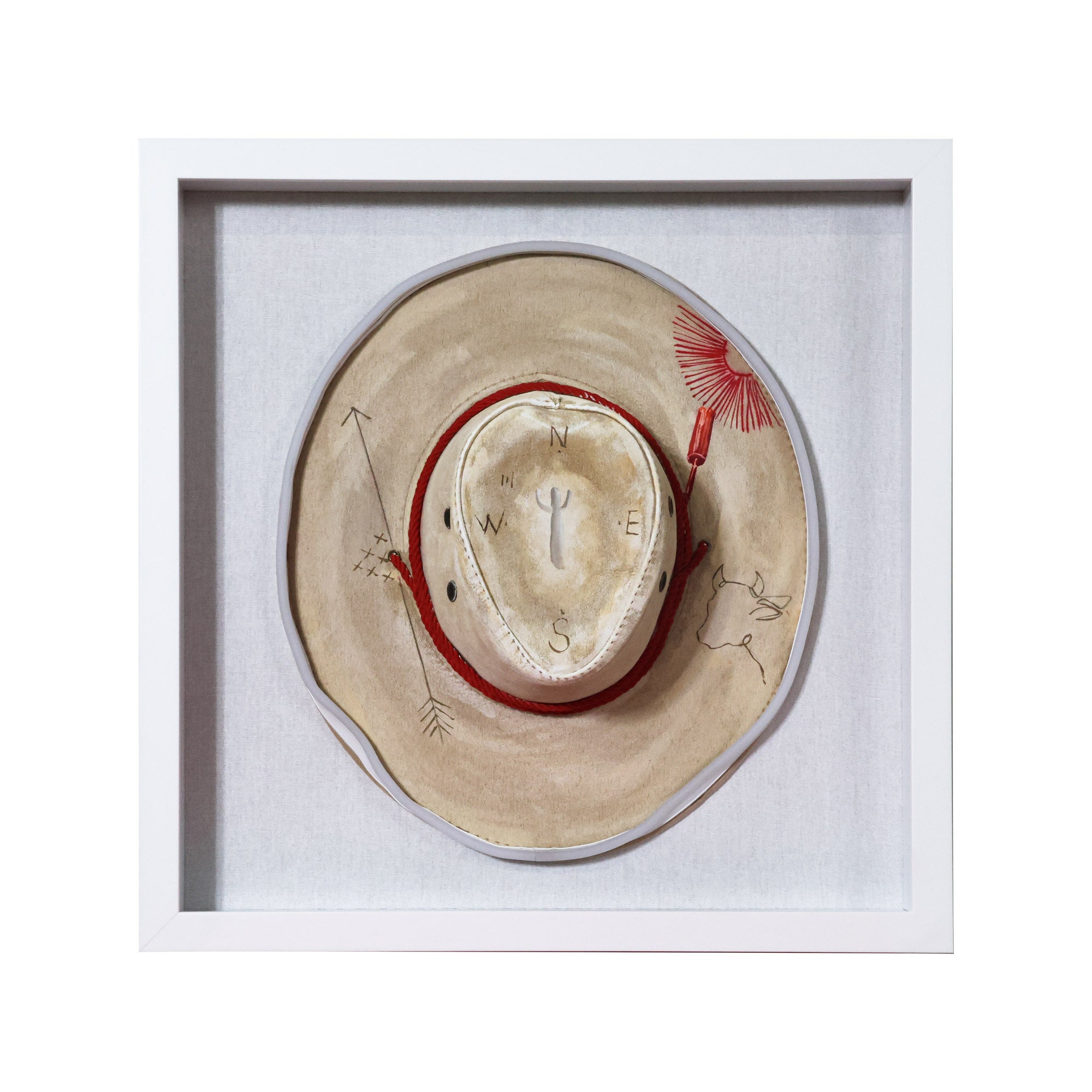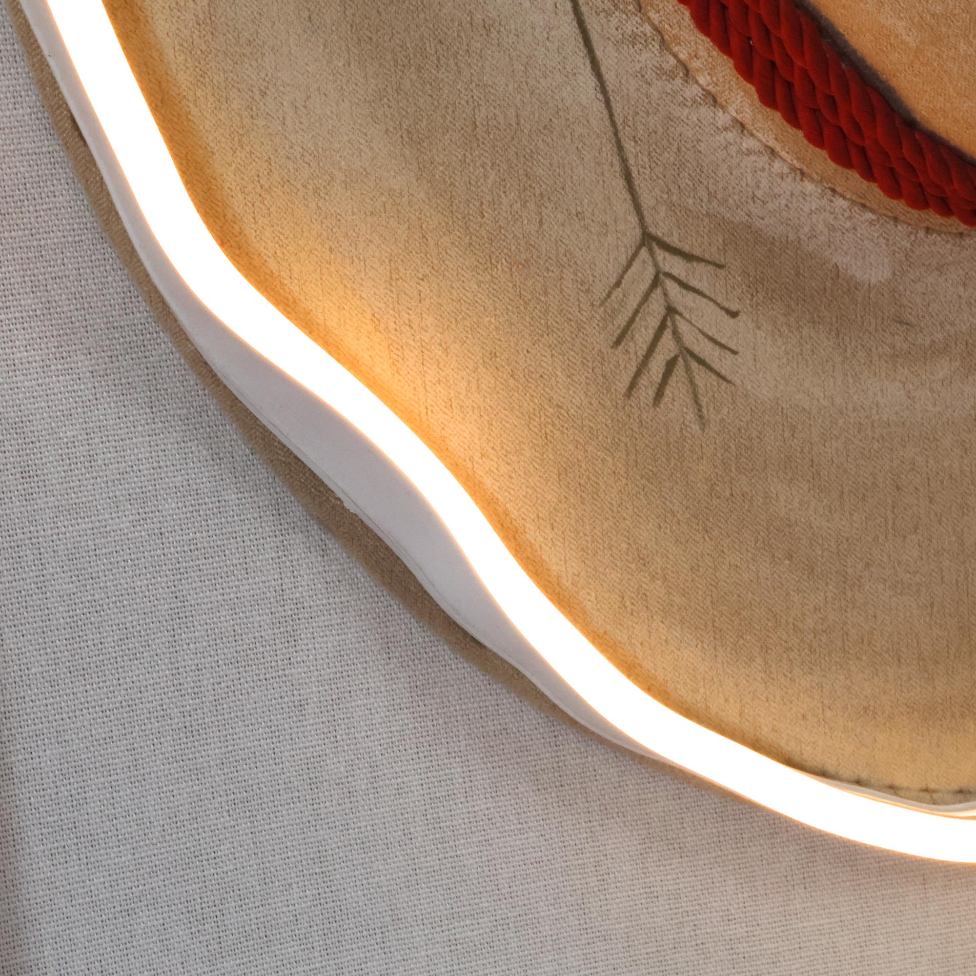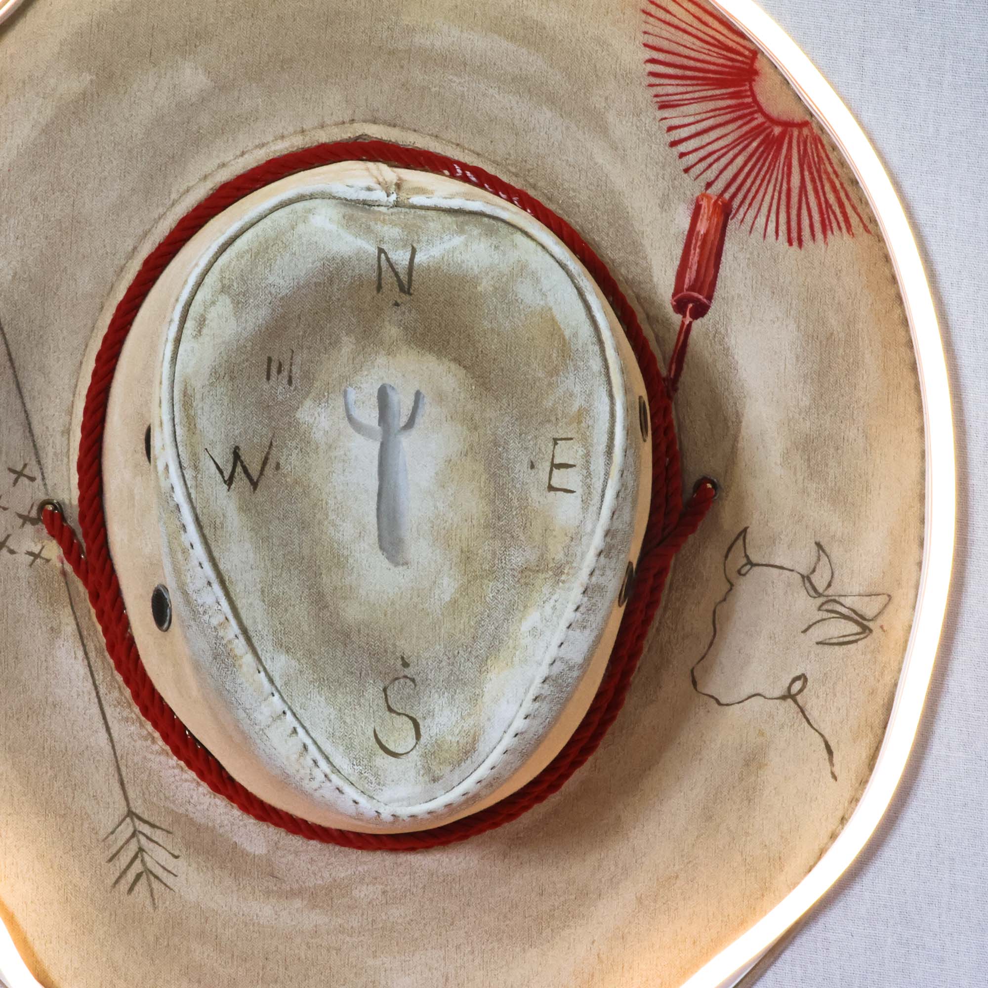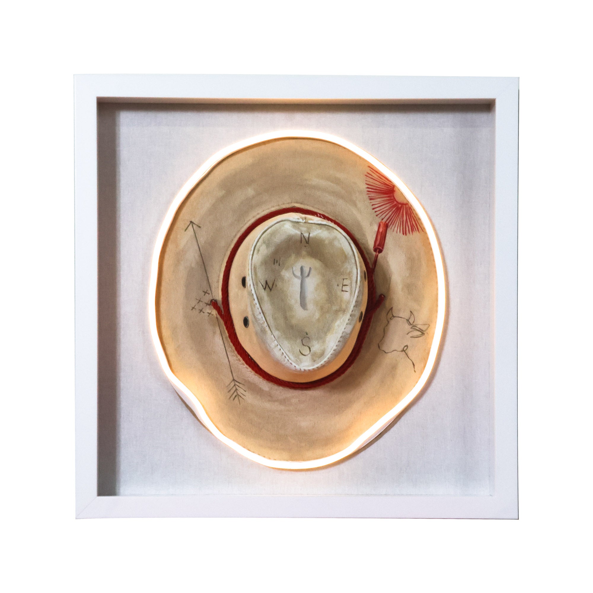 New from the Tat Frederick studio, Electric Cowboy Petite features an array of colorful cowboy hats. Once each hat is hand-stitched and hand-painted, neon lights are applied around the edges with glue. Framed in white with a black cord.