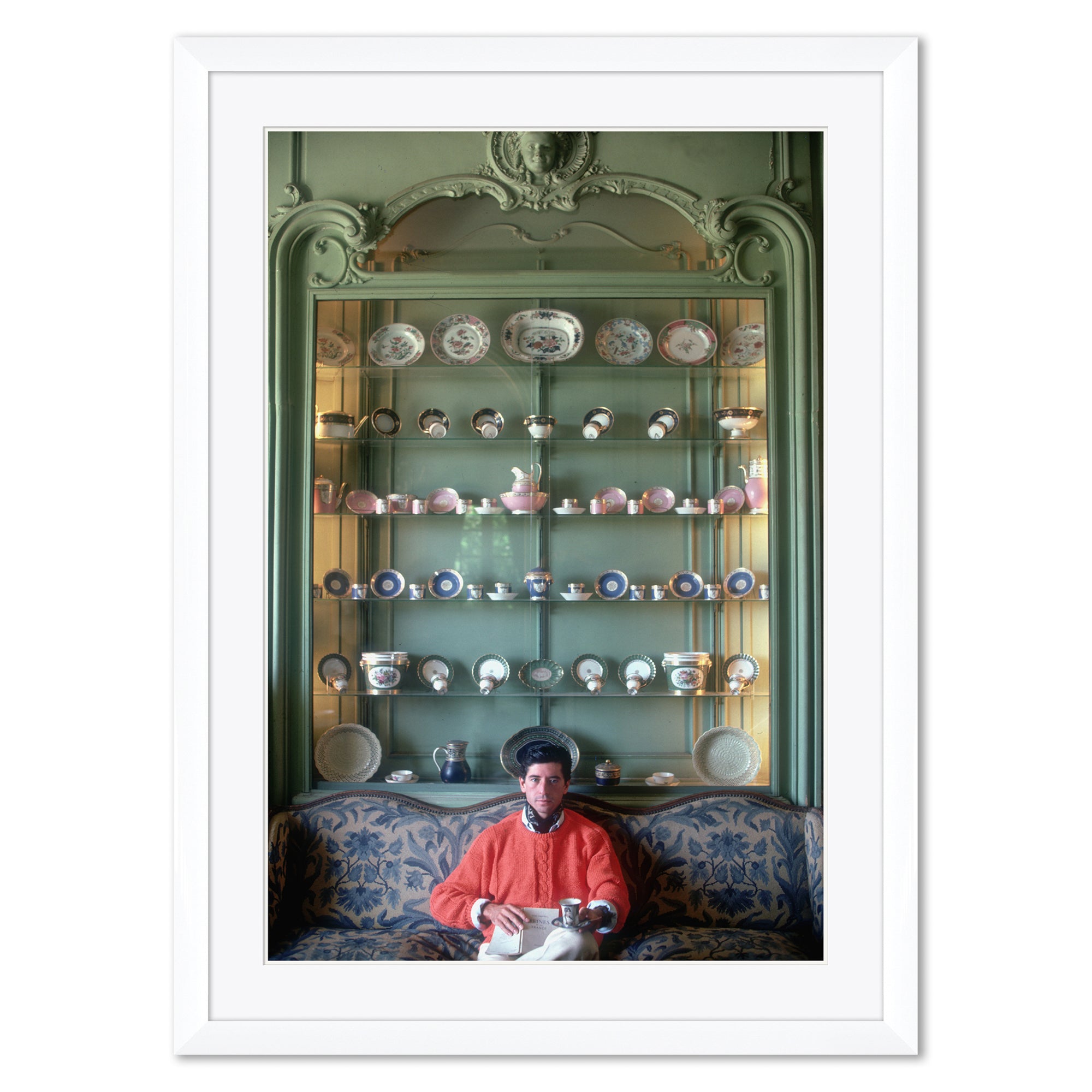 Slim Aarons photography of Michel, Comte d'Arcangues, against a wall of porcelains at his chateau d'Arcangues, Biarritz, France, circa 1986.