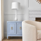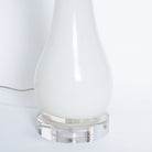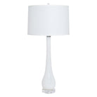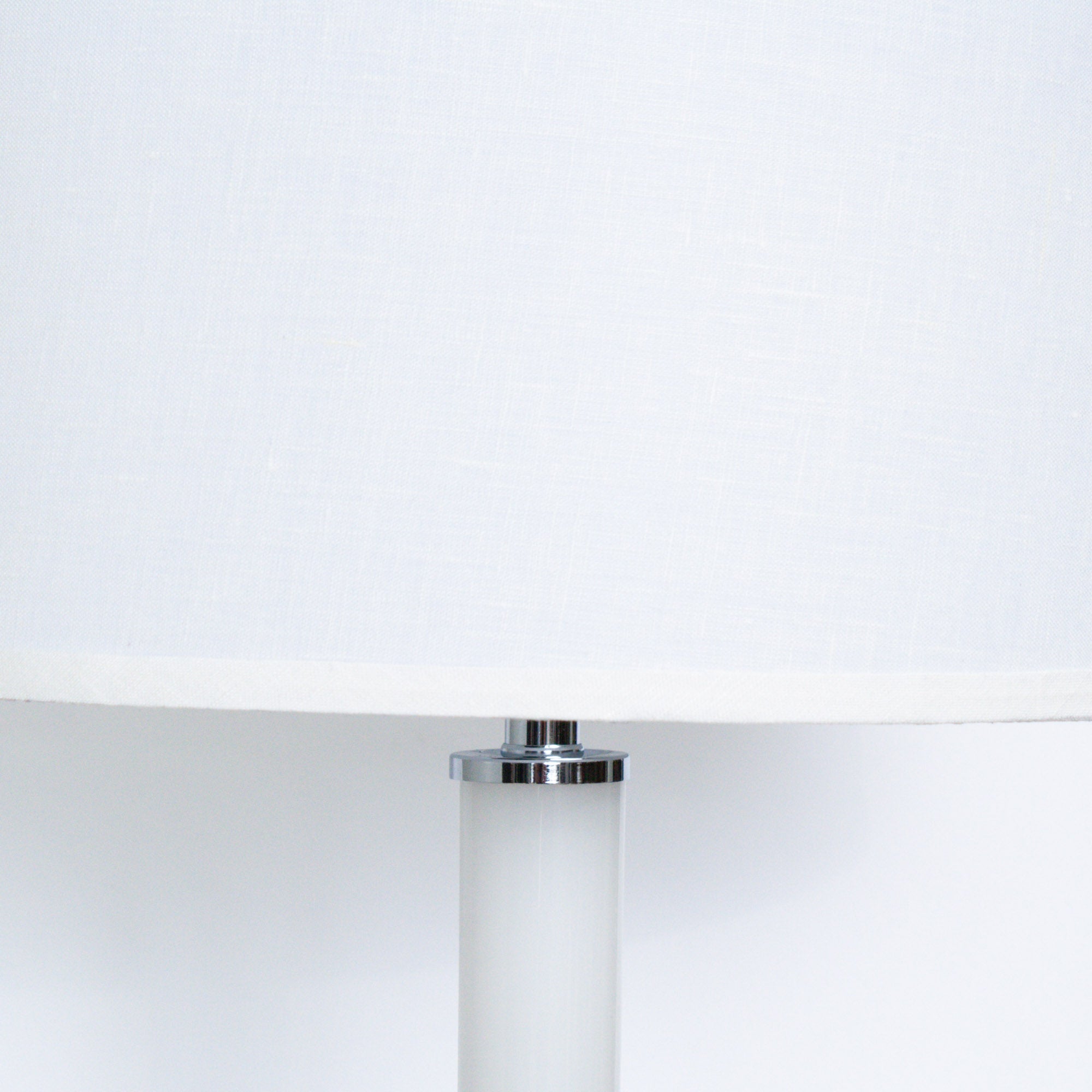 This gorgeous Italianate hand blown glass lamp features an acrylic base and a white linen shade with a round acrylic finial. You can't go wrong with the white color and graceful design of this lamp.