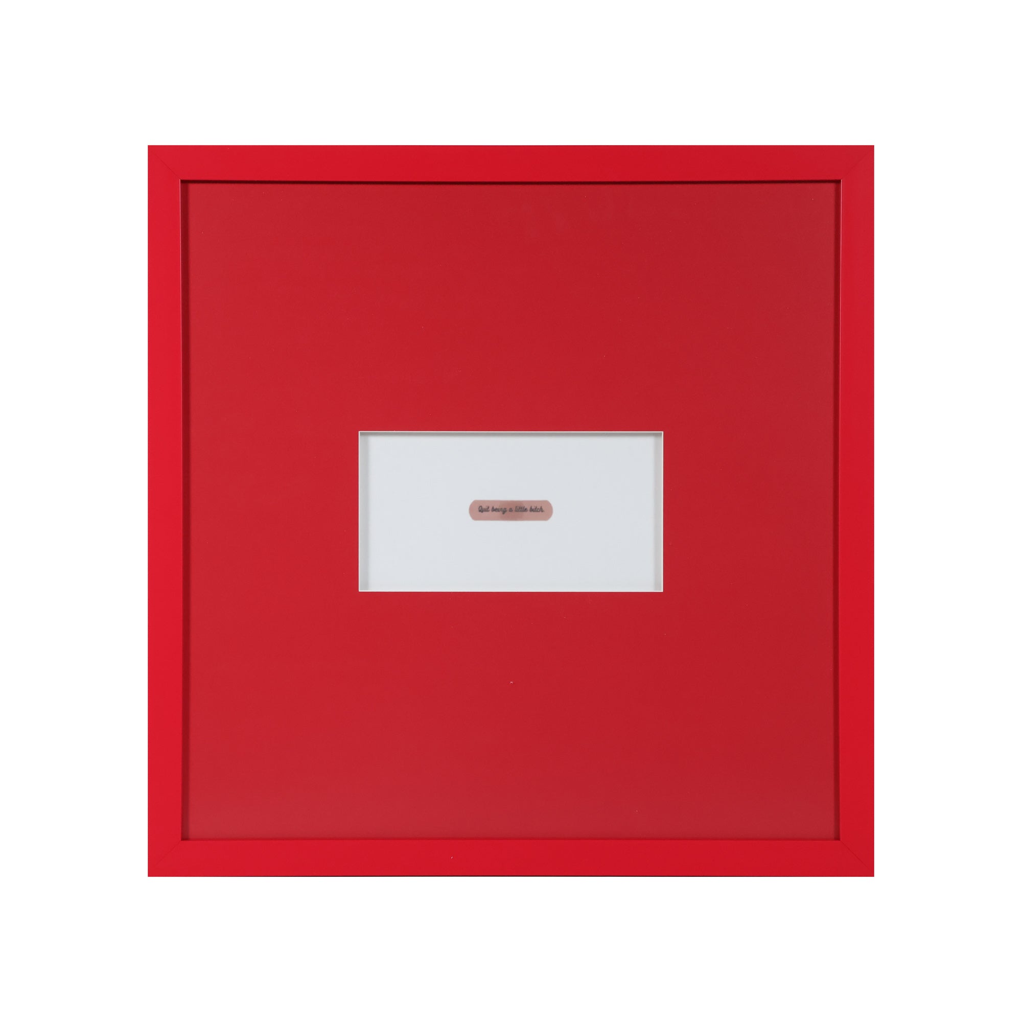 From the Tat Frederick studio, Just Quit features a bandaid with the phrase "Quit being a little bitch" written on it. This isn’t just art, it’s an attitude adjustment in a bright red frame.