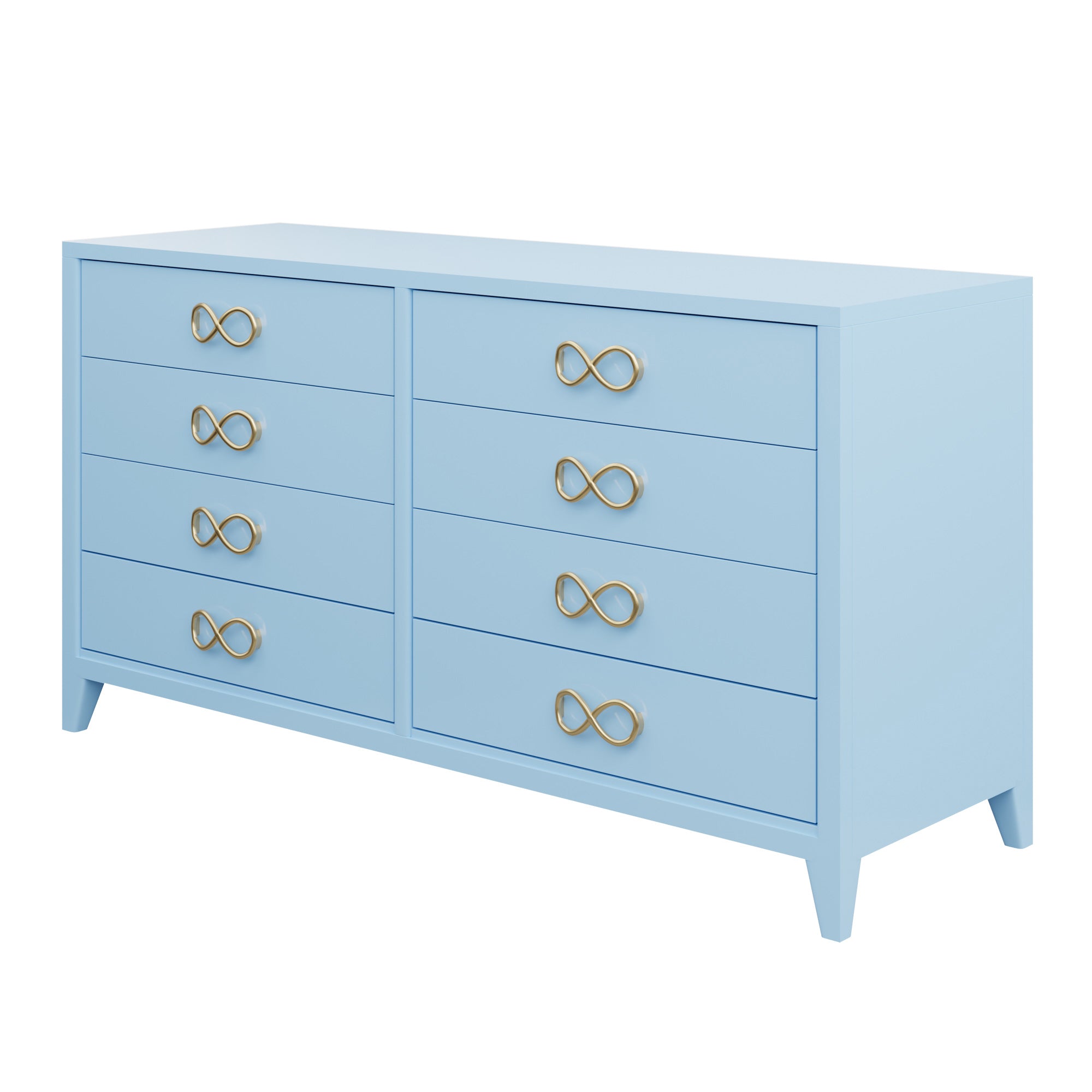 Dressed up with infinity bow hardware, this 8-drawer dresser is a simple showstopper. Robin egg blue lacquer in a matte finish keeps it on the fun side. The Magritte is perfect for a nursery, bedroom, or even the entryway.