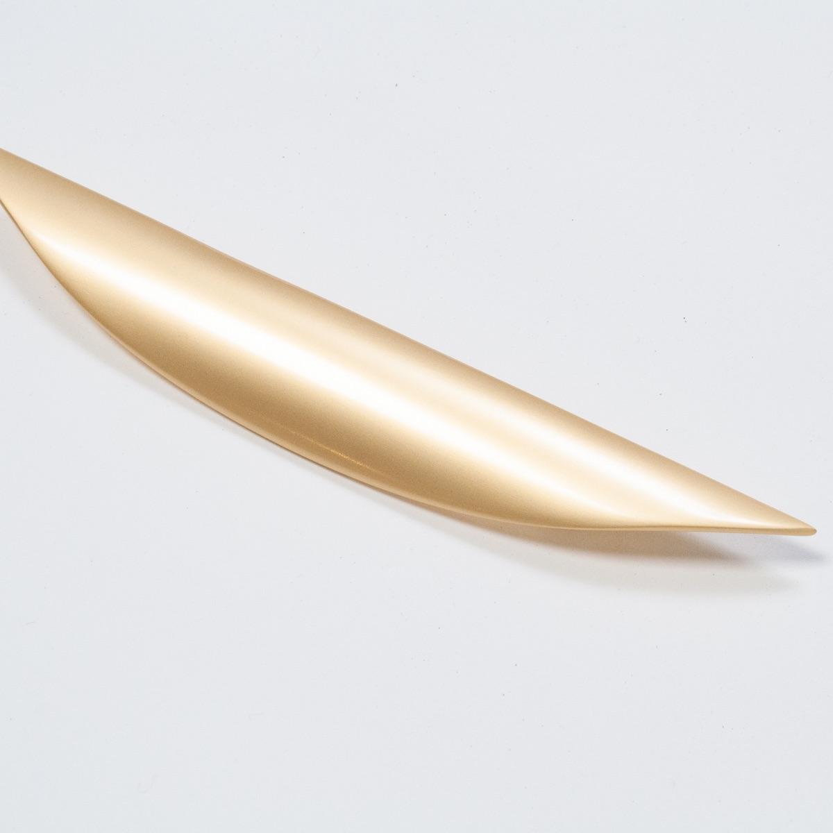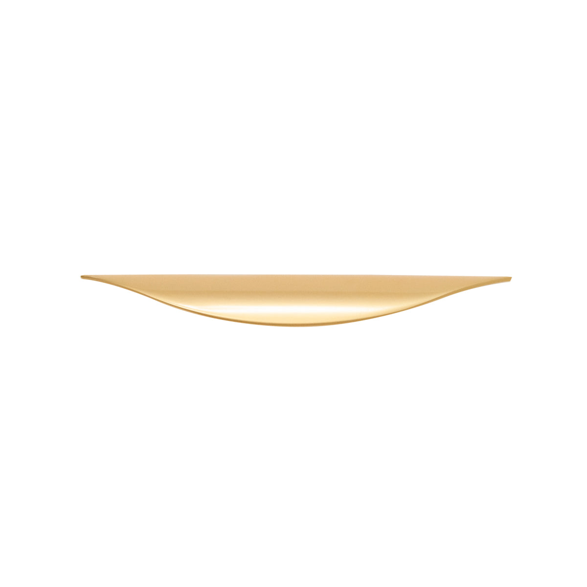 Modern cup handle hardware with a gold finish. Use for dresser drawers or cabinets.
