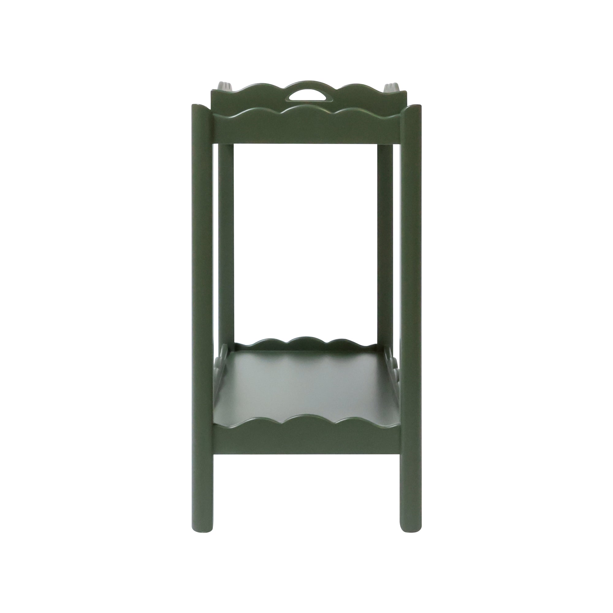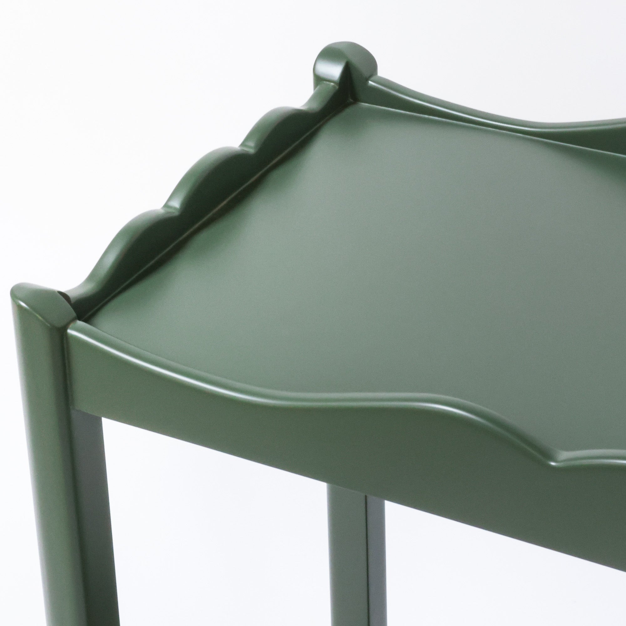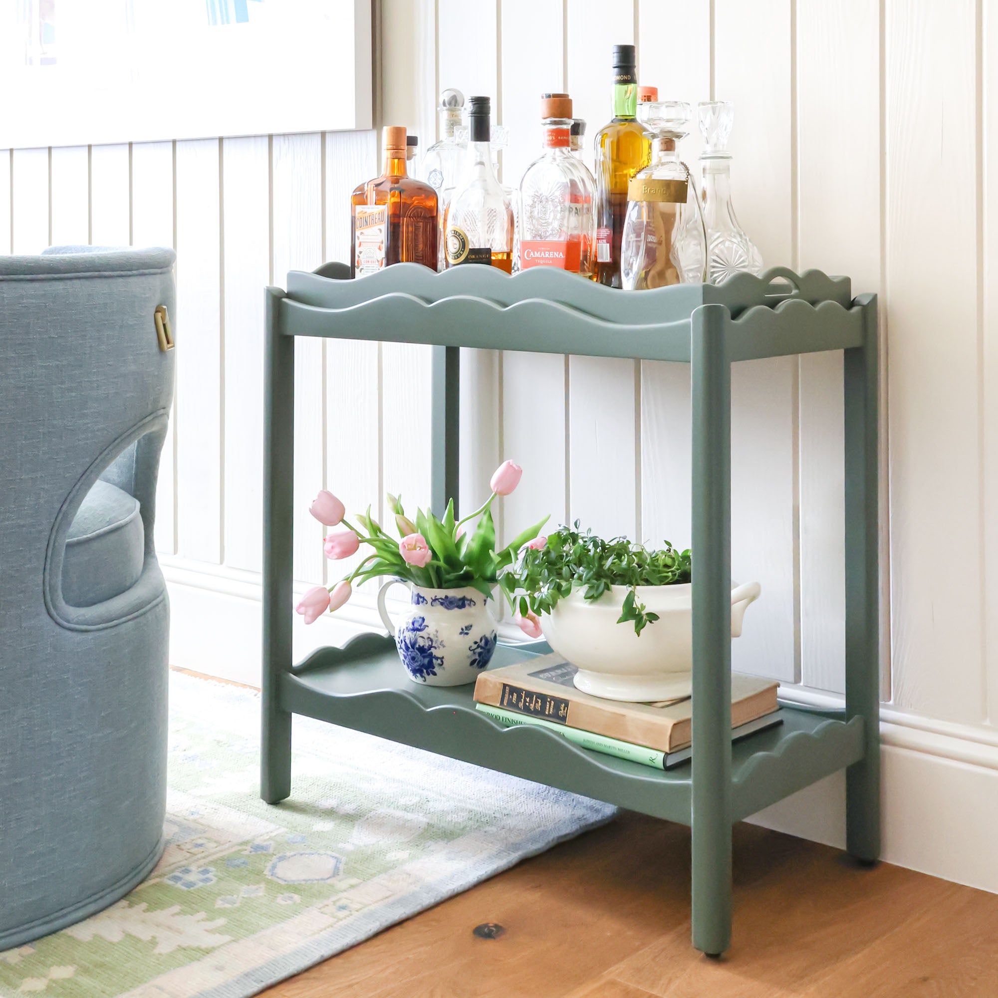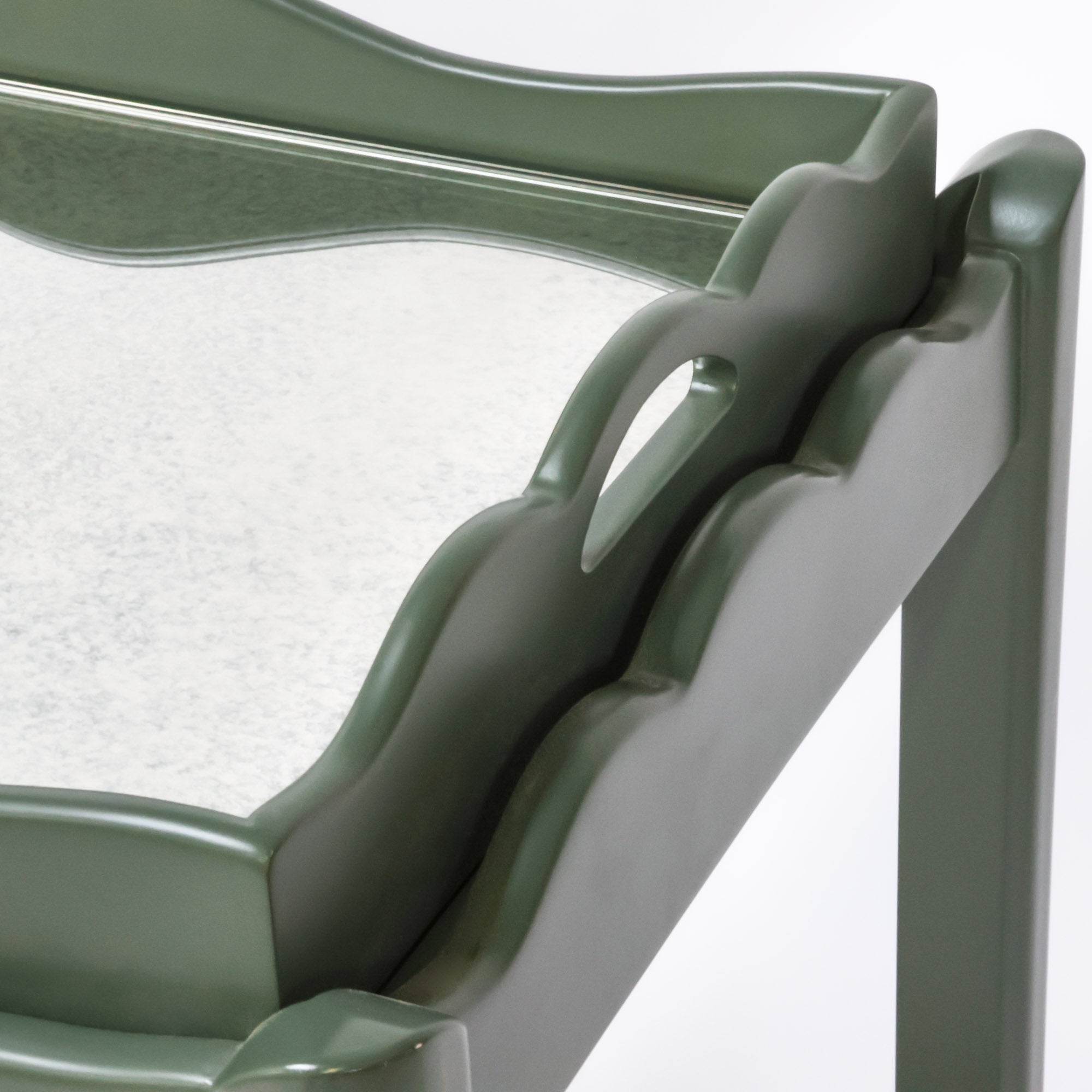 Featuring graceful curves that contrast with four straight legs, Patara's two-tiered design is the perfect perch for your favorite bottles and glasses. A removable tray featuring an antiqued mirror adds a striking flair to this high-society debutante, while matte Deep Sage lacquer keeps things classy.
