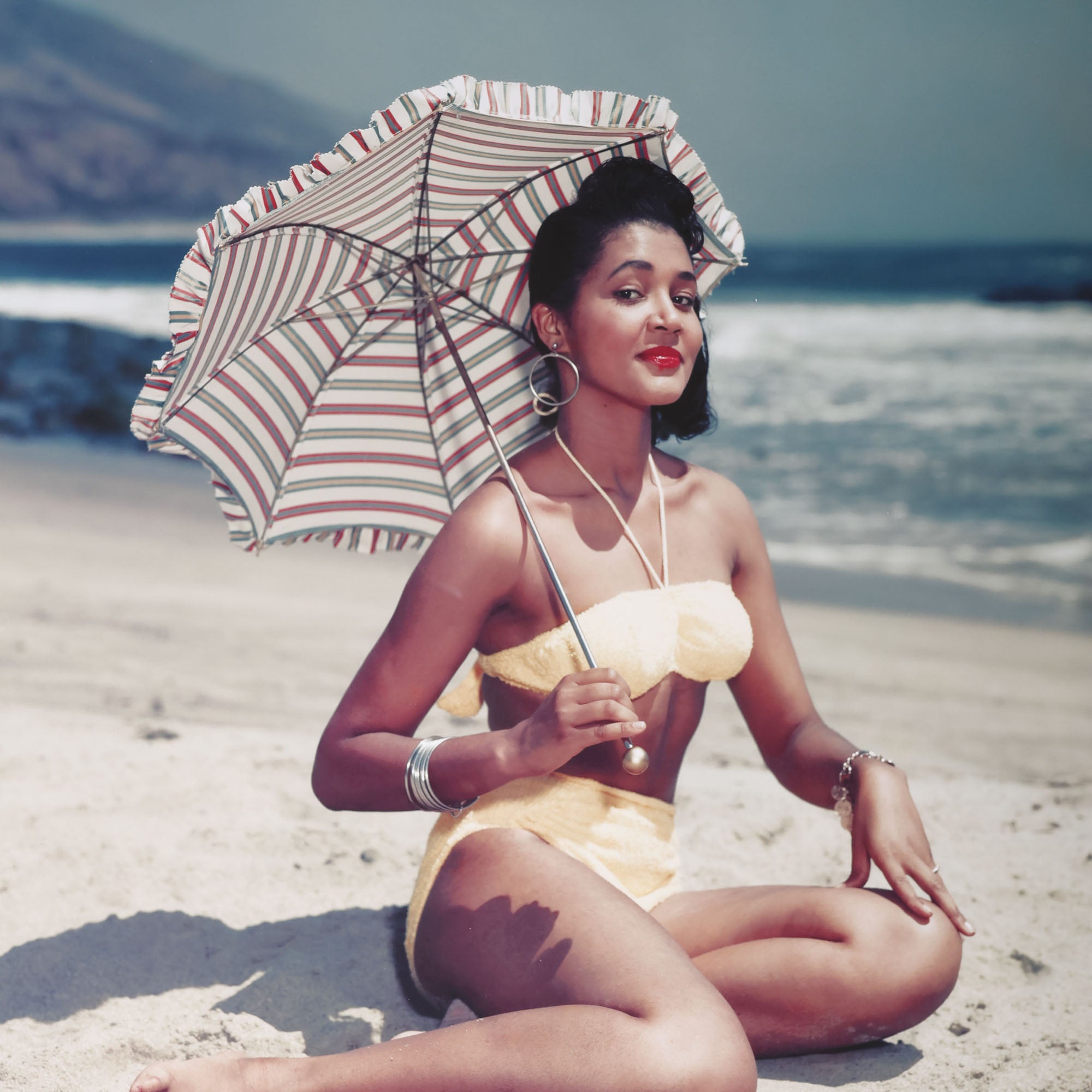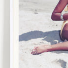 This vintage Tom Kelley photograph from the 1950s features a young woman sitting on the beach with an umbrella. Printed on archival paper with a white ivory matte and white frame.
