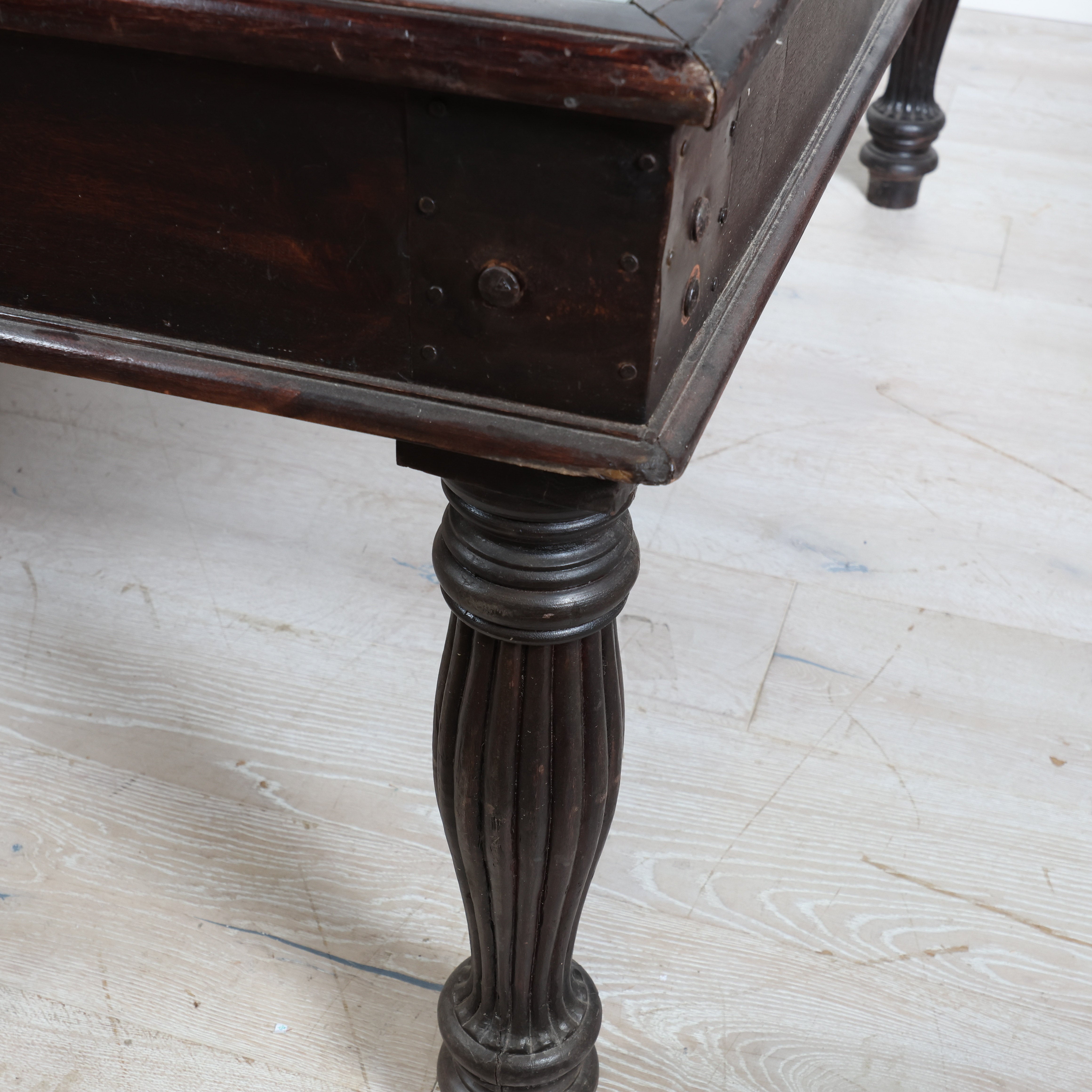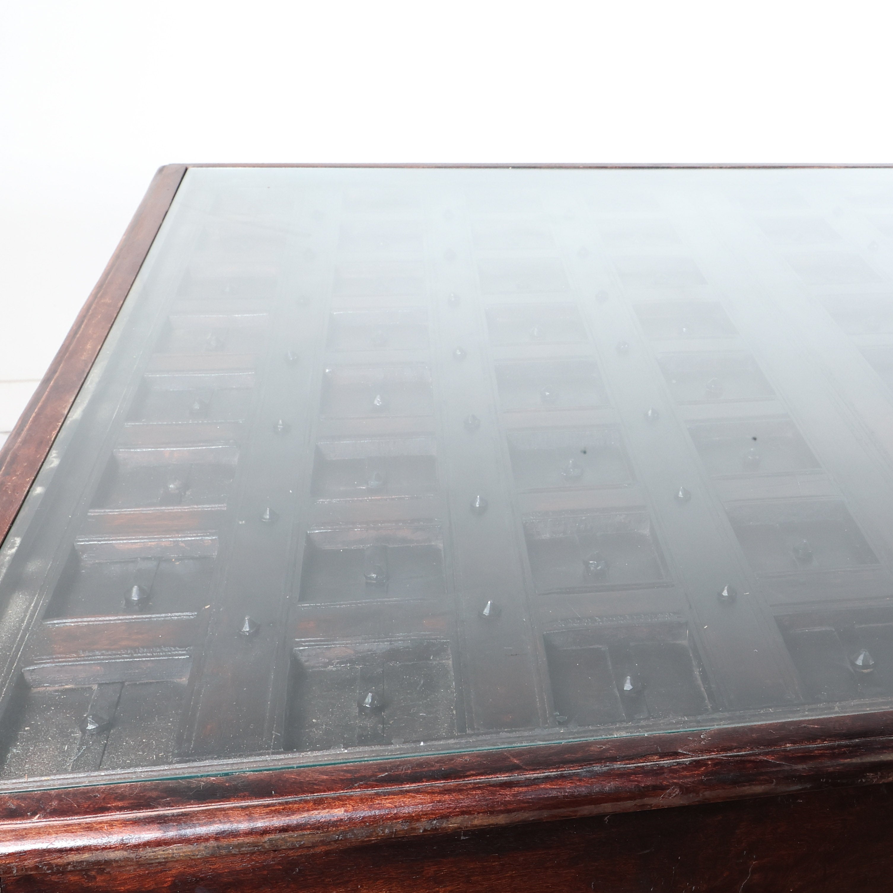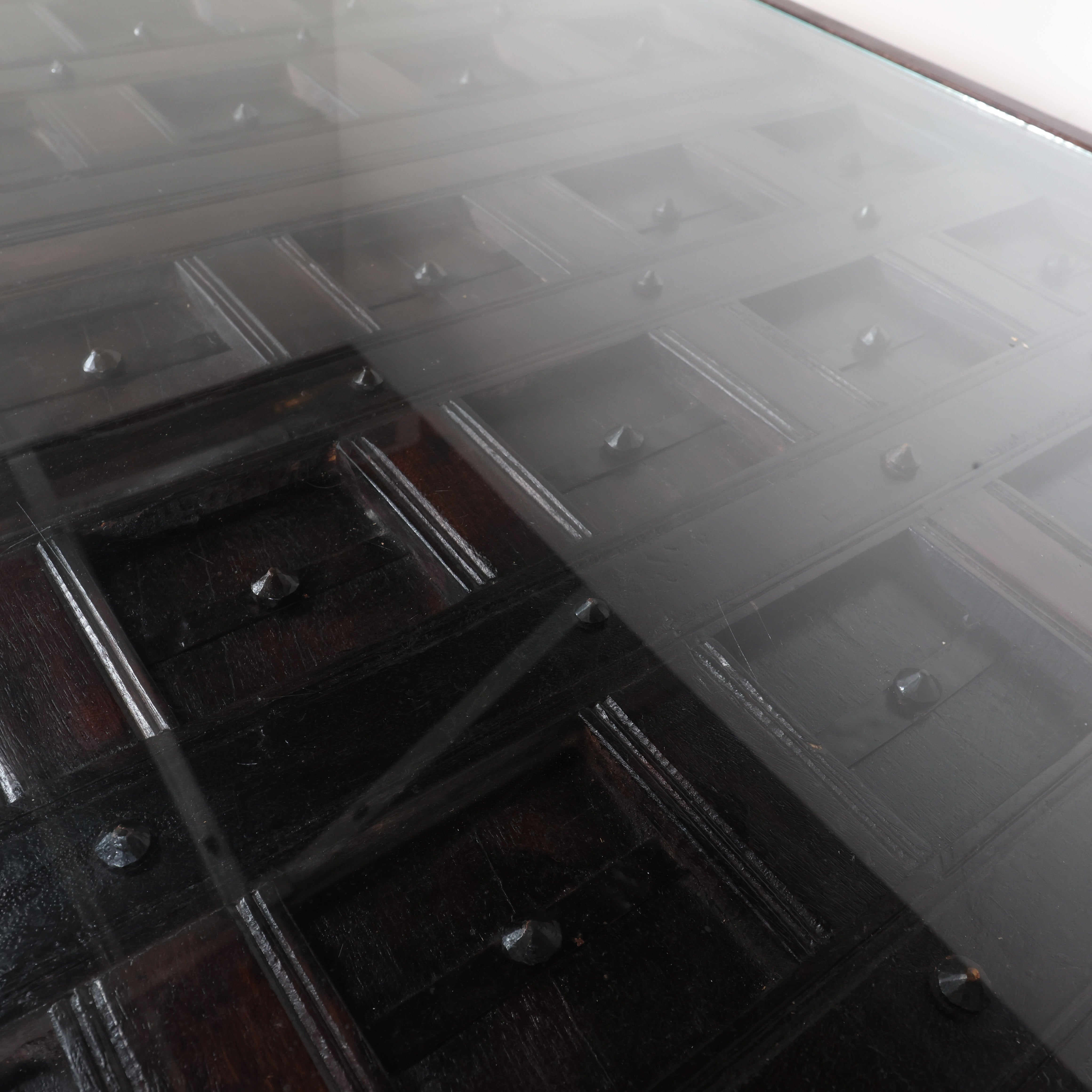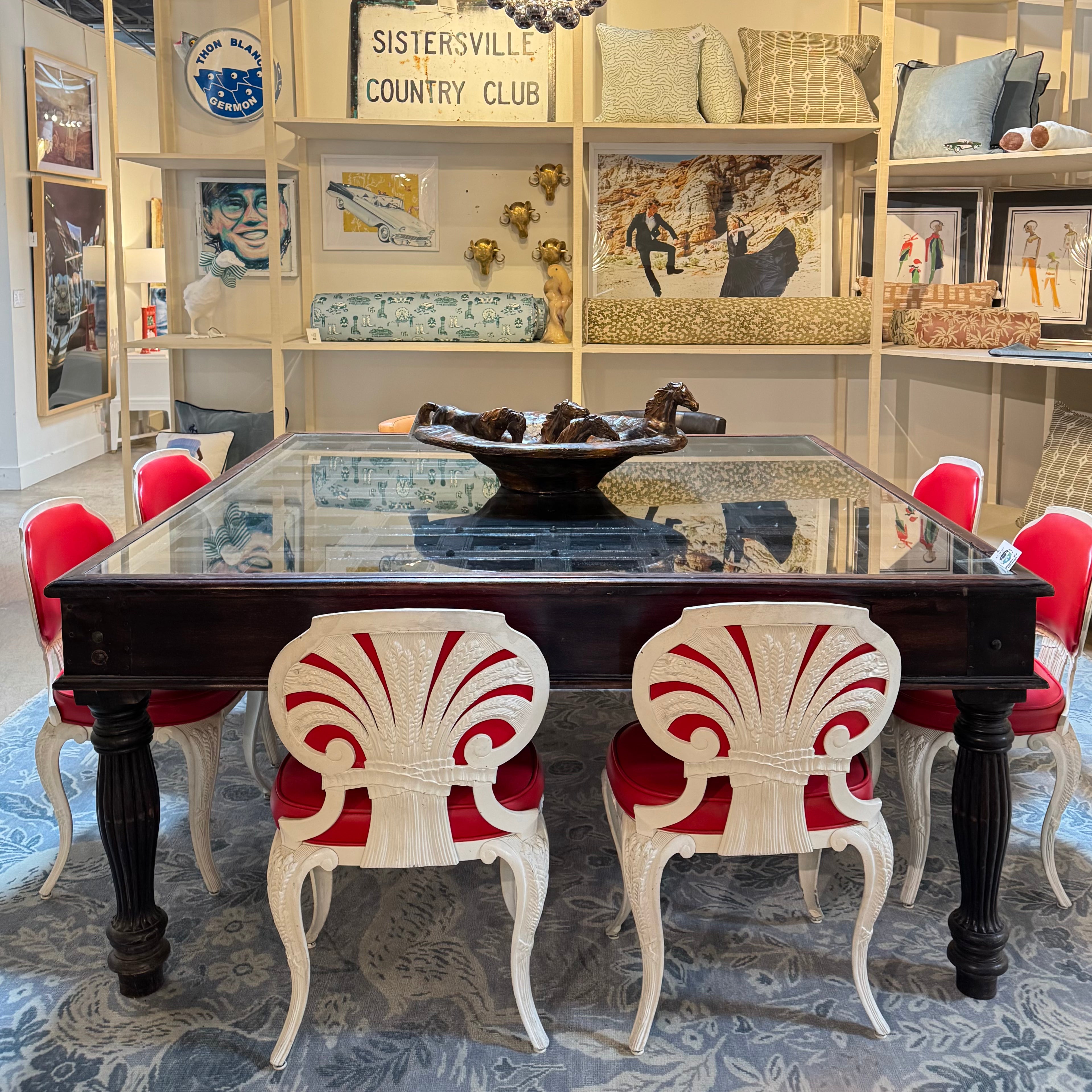 Very unique square wood table with a glass top that reveals a beautifully carved dimensional grid pattern beneath. The dark wood base features turned legs and rich tones that highlight the depth of the carved detailing. The glass top protects the surface while letting the craftsmanship below take center stage. Another reason why we love this table is because it's super easy to have conversations with every person when sitting at a square table.