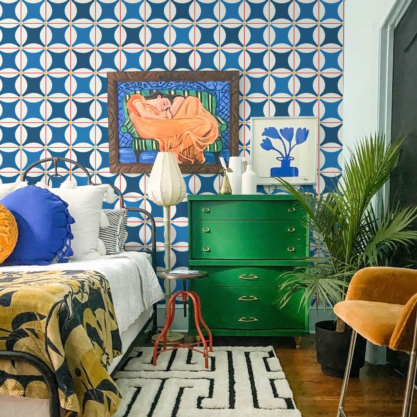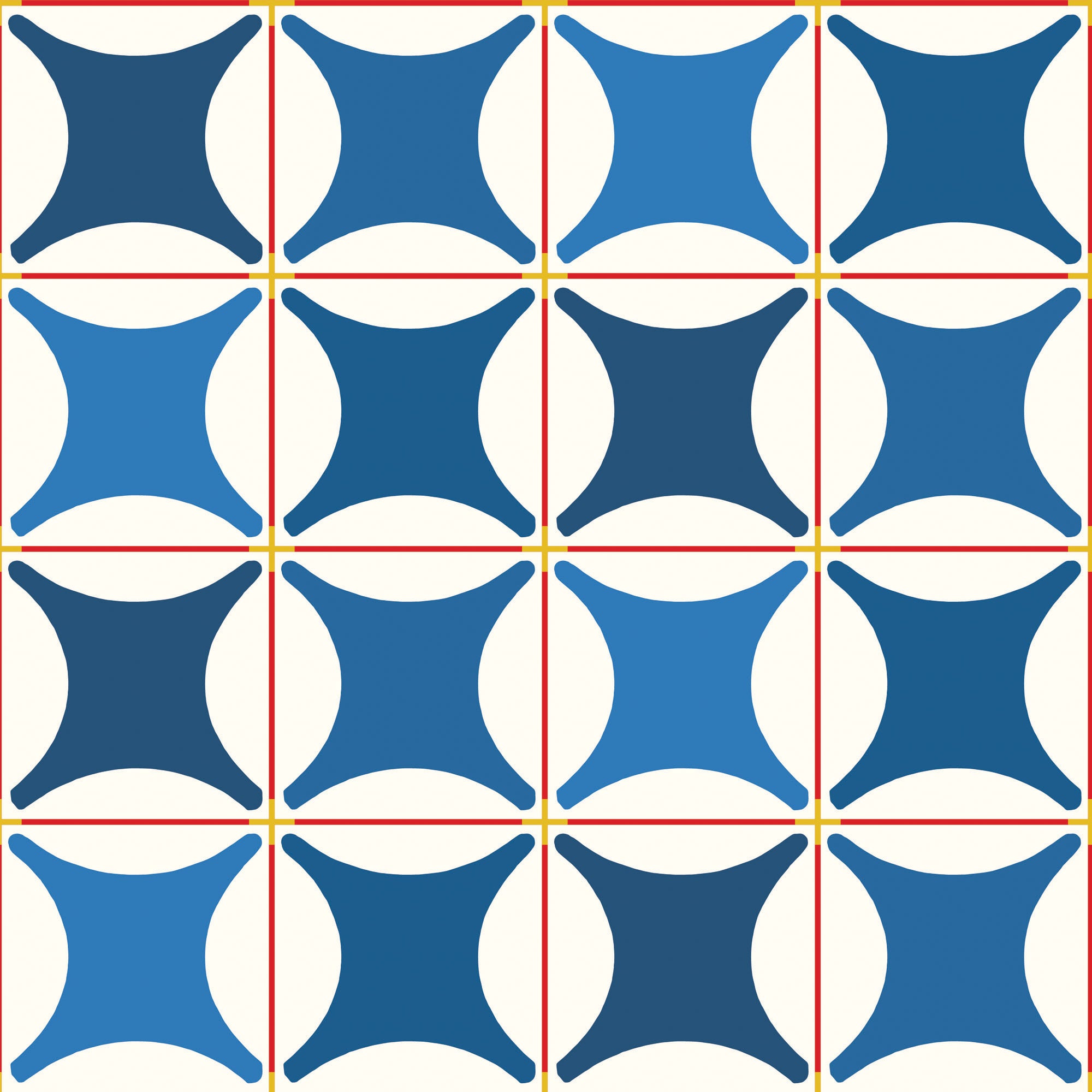 The Traveler Tile pattern features a straightforward tile-like repeating pattern that draws inspiration from classic bathhouse design but introduces fresh saturated colors that complement the known and loved aesthetic. A collaboration between Mitchell Black and Natalie Papier, this design's clean lines and regular repeats create an eye-catching design that embodies the beauty of pattern itself.