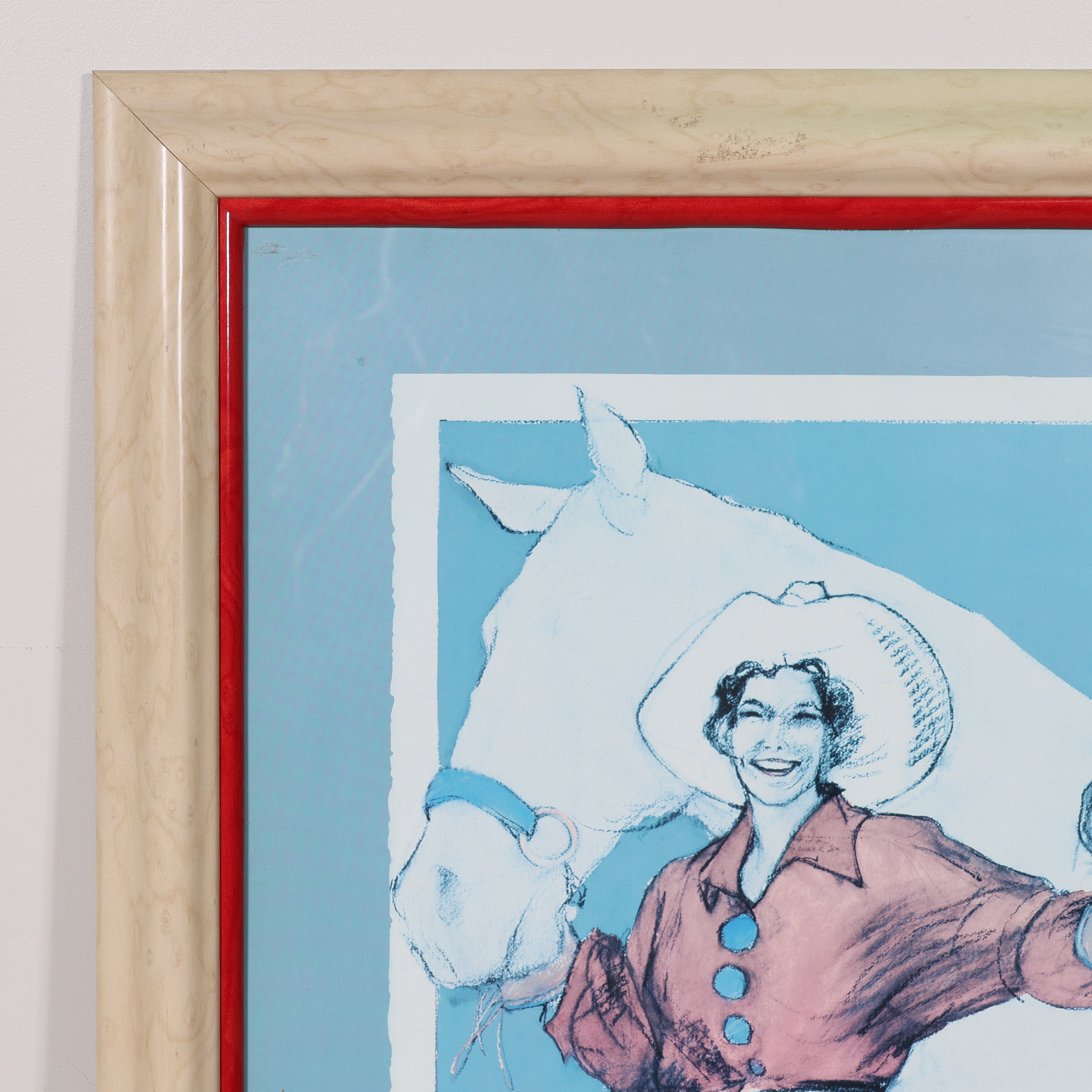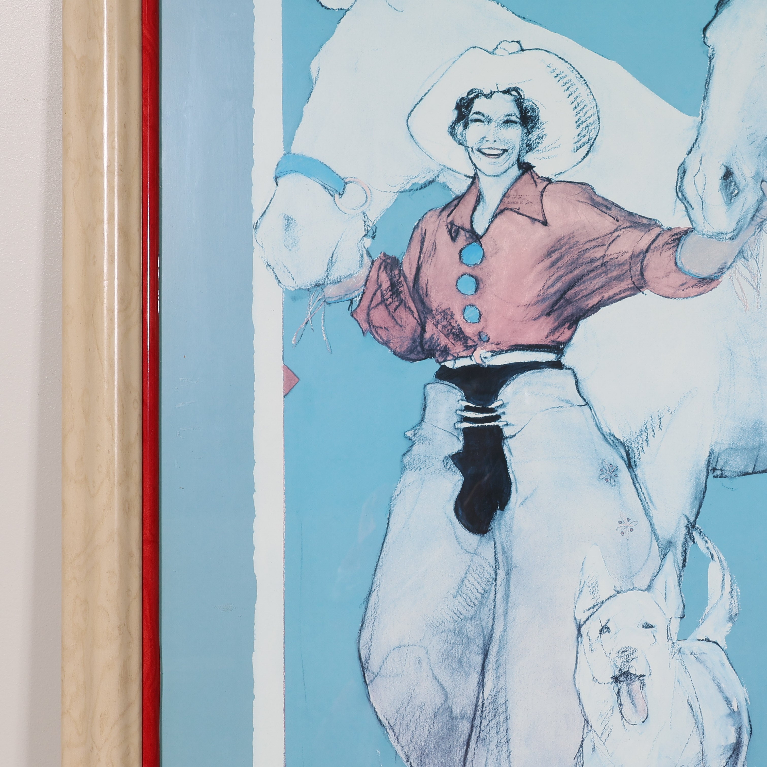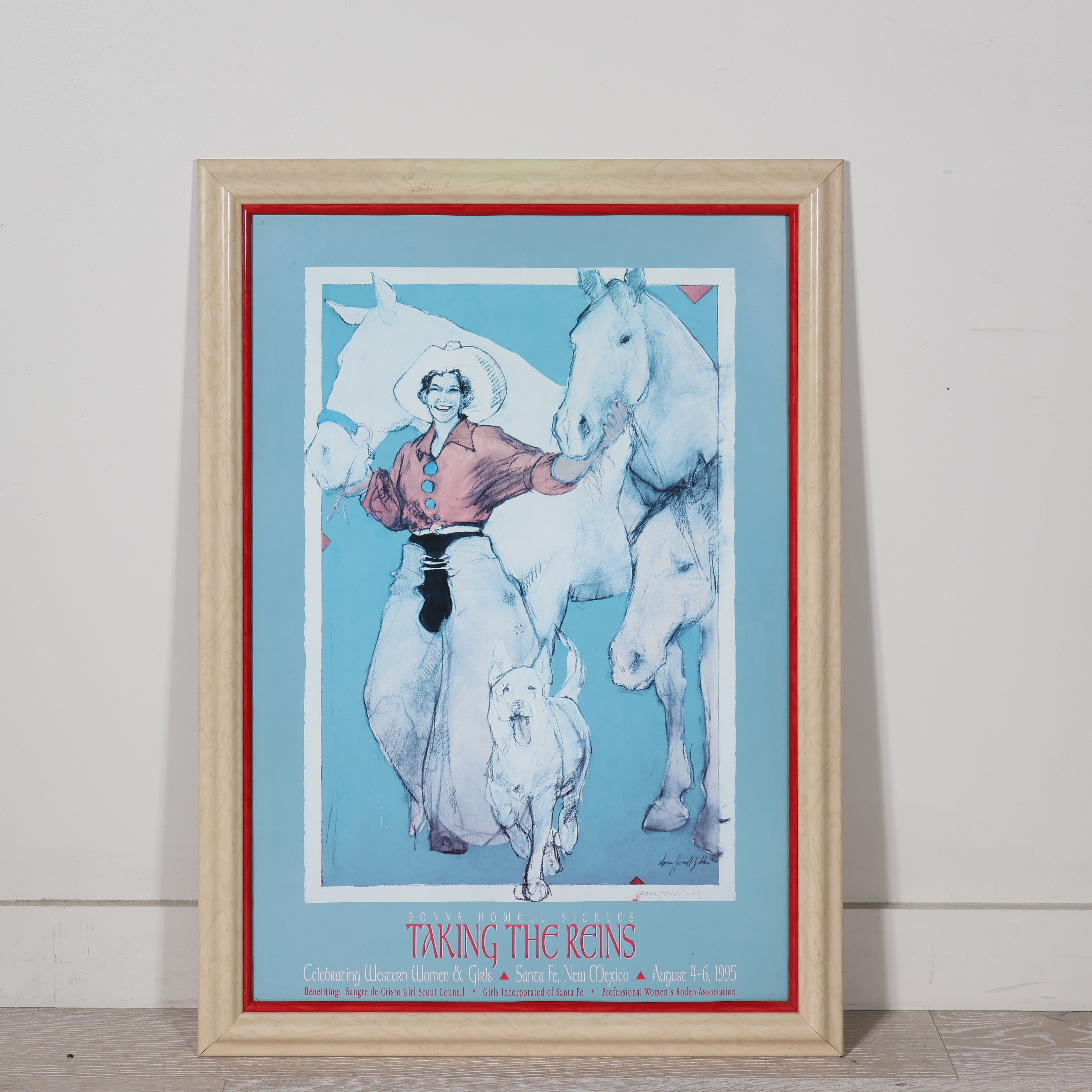 Originally created to celebrate Western women and girls in Santa Fe, New Mexico (August 4–6, 1995), the poster reflects Howell-Sickles’ long-standing fascination with historic cowgirl culture. Framed with a red accent liner and gorgeous natural wood frame, it makes a vibrant statement piece for anyone drawn to Western art, rodeo culture, or strong female iconography.