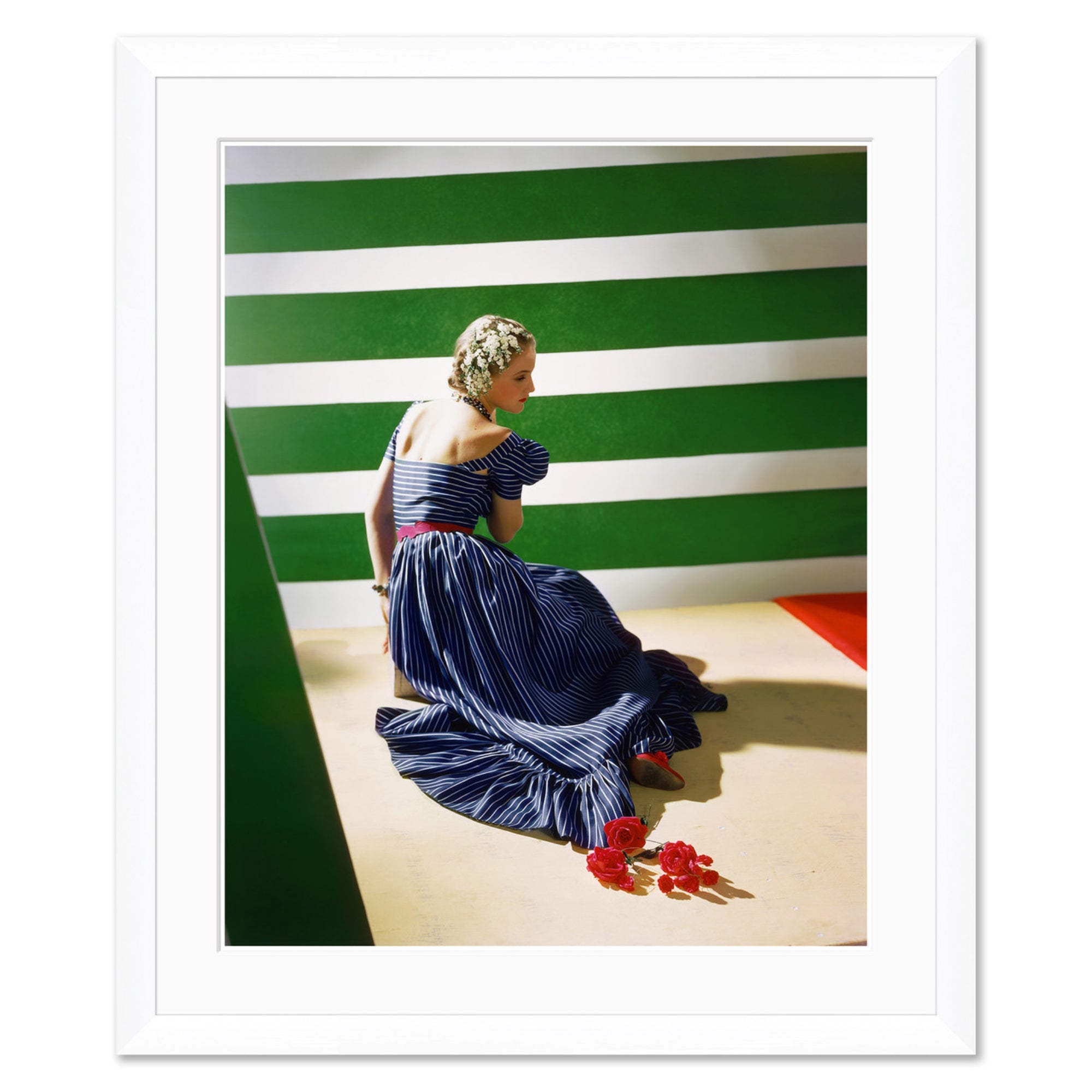 Transform your next project with the timeless elegance of Vogue Magazine, "Model in Striped Blue Dress," published in June 1957, from Soicher Marin's exclusive Condé Nast Collection.