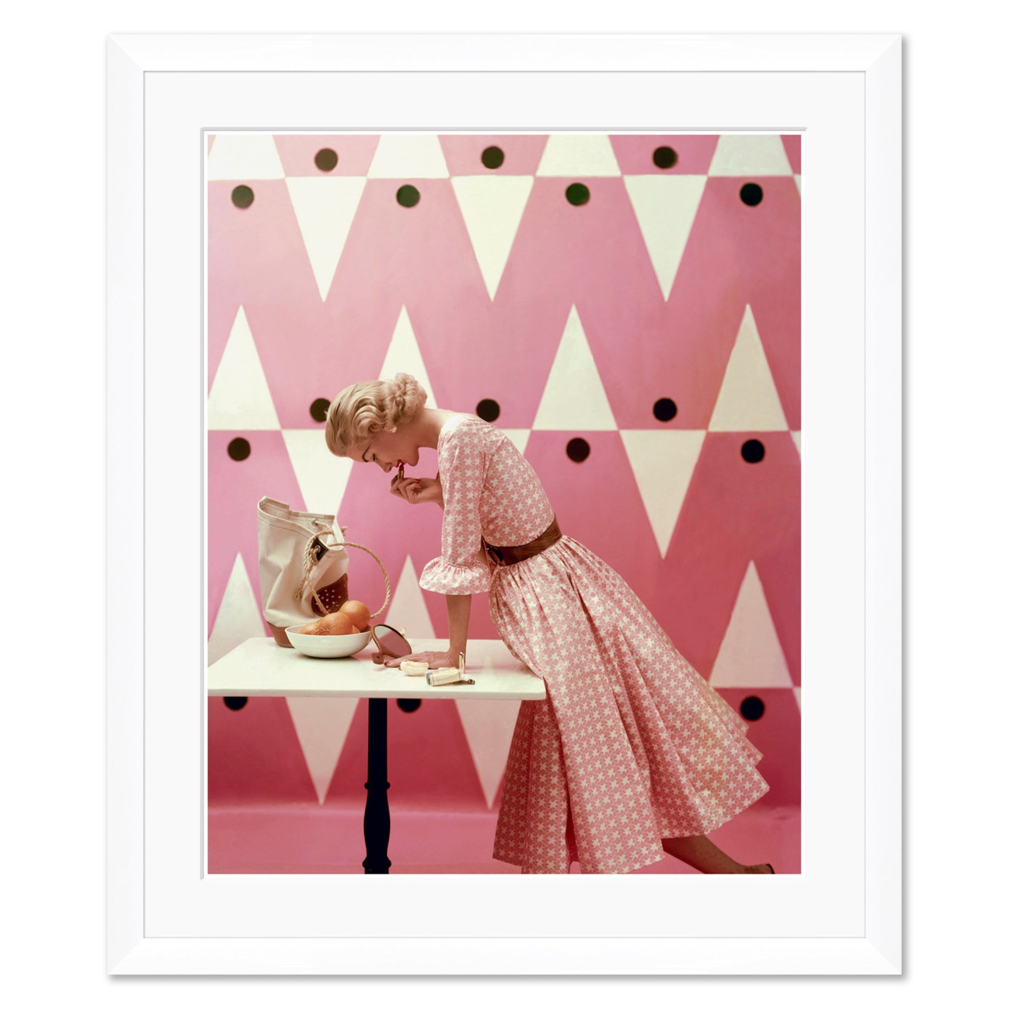 This intimate photograph captures mid-century glamour, depicting a model applying lipstick in a poised, reflective moment, rendered in a palette of pink hues that evoke feminine sophistication.