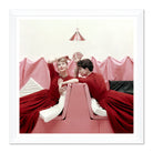 This bold photograph captures mid-century glamour, depicting models in vibrant red dresses posed against a stylish backdrop, rendered in a palette of red hues that evoke dynamic sophistication.